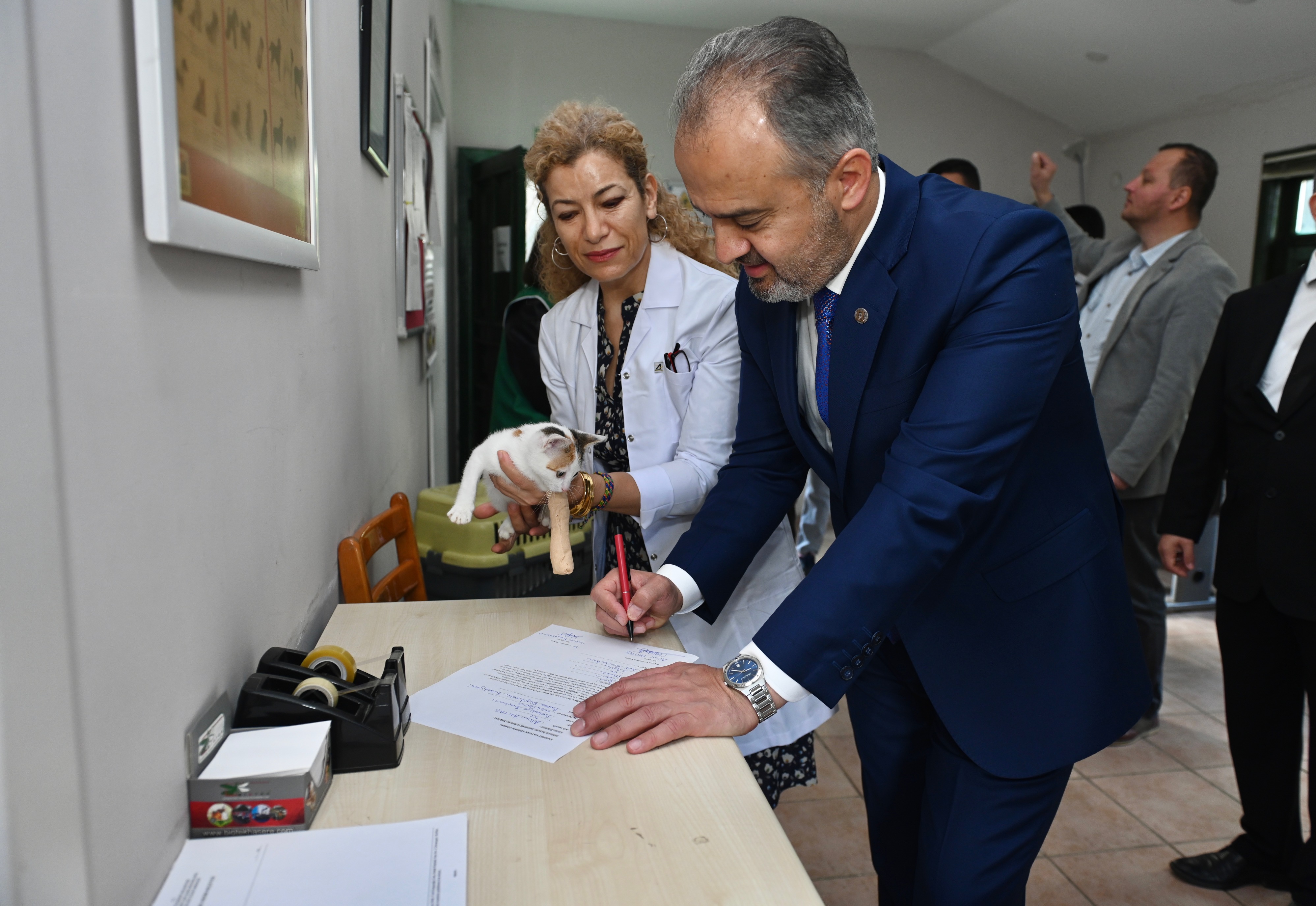 Bursa’da sahipsiz sokak hayvanlarının bakımlarının yapılması ile beslenmesinden yaralı hayvanların tedavisine kadar her alanda önemli hizmetleri hayata geçiren Büyükşehir Belediyesi, Dünya Hayvanları Koruma Günü’nde çalışmalarını aralıksız sürdürüyor. Bursa Büyükşehir Belediye Başkanı Alinur Aktaş, 4 Ekim Dünya Hayvanları Koruma Günü nedeniyle, mahalle gönüllüleri, STK ve Bursa Barosu temsilcileriyle birlikte Soğukkuyu Sokak Hayvanları Tedavi Merkezi’ni ziyaret etti. Hayvan severlerin çalışma ve taleplerini dinleyen Başkan Alinur Aktaş, daha sonra form doldurarak 4 aylık tekir cinsi yavru bir kediyi sahiplendi. Yavru kedinin tedavi süreci hakkında bilgi alan Başkan Aktaş, sol patisinde burkulma ve sinirlerinde zedelenme olan minik kediyi kucağına alıp sevdi.