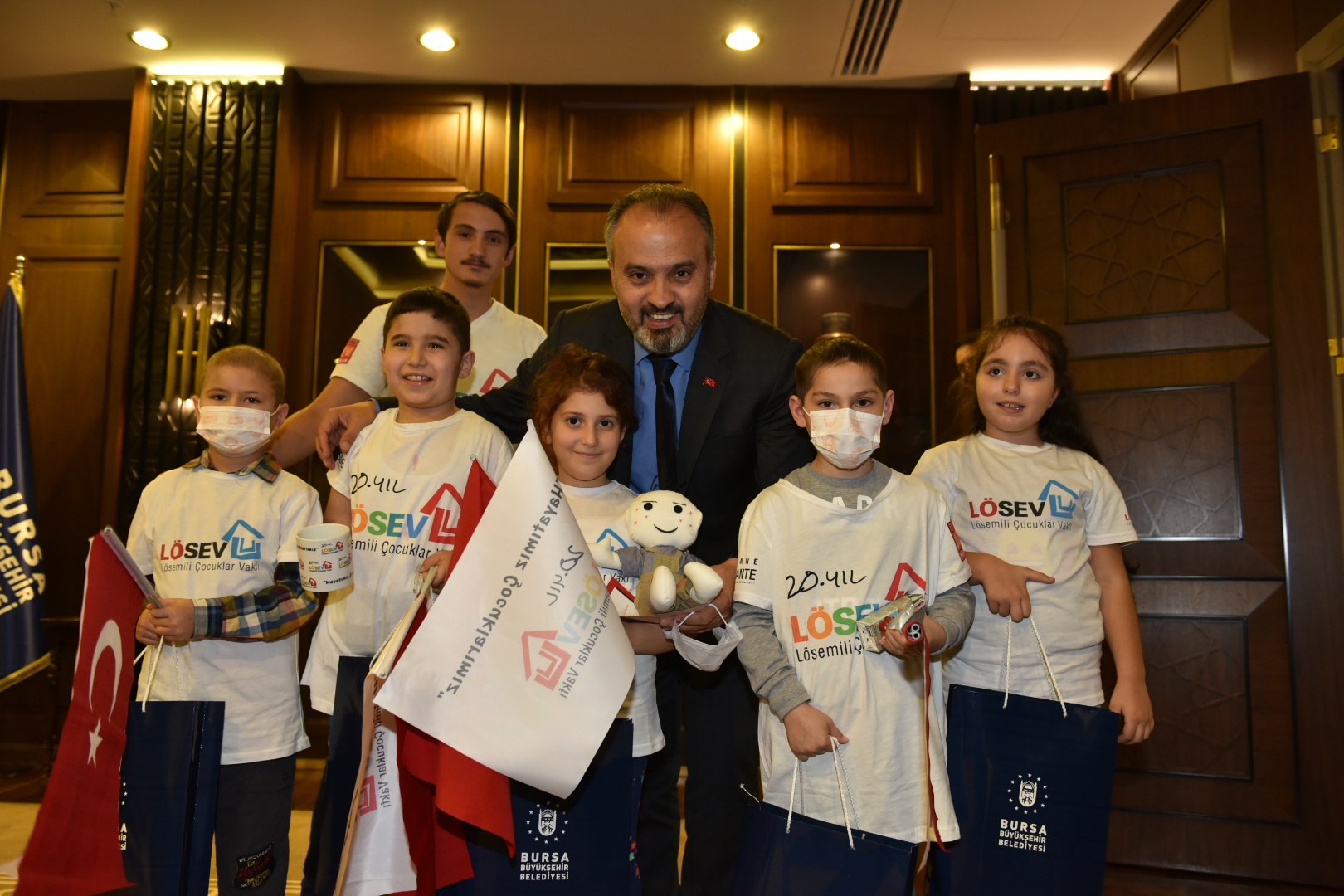 Bursa Büyükşehir Belediye Başkanı Alinur Aktaş, Lösemili Çocuklar Vakfı (LÖSEV) Bursa Şubesi üyeleri ile Büyükşehir Belediyesi Hizmet Binası Başkanlık makamında bir araya geldi. Başkan Aktaş, LÖSEV Bursa Koordinatörü Füsun Özcan’dan çalışmaları ile ilgili bilgiler aldı, ziyarete katılan çocuklarla da bol bol sohbet etti. Başkan Aktaş, “Hayatımız Çocuklarımız” diyen LÖSEV’e dikkatleri çekmek ve ‘2 – 8 Kasım Lösemili Çocuklar Haftası’nda farkındalık oluşturmak amacıyla maske takarak, çocuklarla birlikte fotoğraf çektirdi. Çocuklar da Başkan Aktaş’a LÖSEV’in umut bebeğini hediye etti. LÖSEV Bursa Koordinatörü Füsun Özcan ise LÖSEV adını kullanarak bağış toplayanlarla ilgili vatandaşları dikkatli olmaya çağırdı.