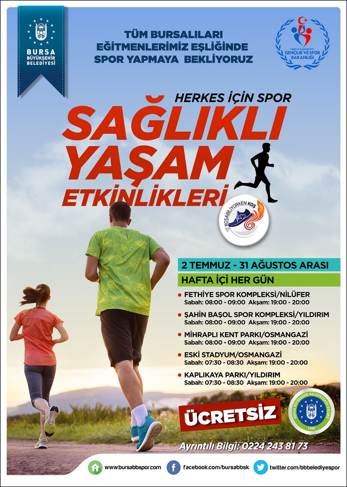 Büyükşehir Belediyesi tarafından ‘Herkes için spor’ mottosuyla düzenlenen ‘Sağlıklı Yaşam Etkinlikleri’, 2 Temmuz ile 31 Ağustos tarihleri arasında tüm Bursalıları, uzman eğitmenler eşliğinde, açık havada spor yapmaya davet ediyor.