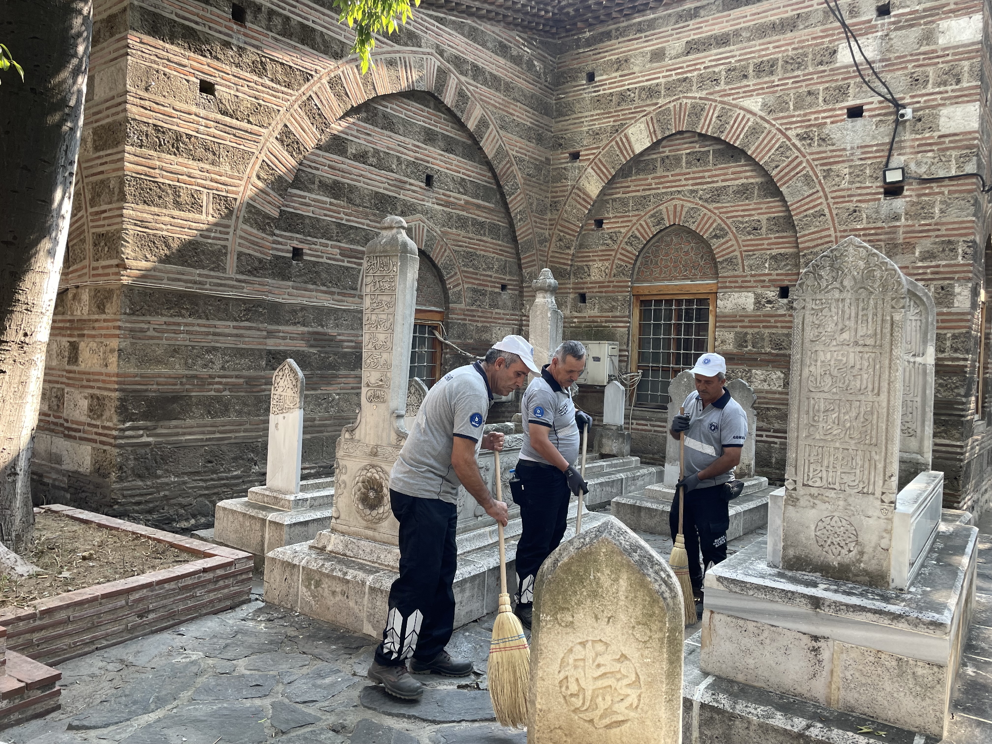 Tarihi ve kültürel miras yatırımlarıyla Bursa’yı adeta açık hava müzesine dönüştüren Büyükşehir Belediyesi, türbe ve cami hazirelerinde bulunan tarihi mezarlıklarda da düzenli temizlik çalışması yapıyor. Bursa’nın 17 ilçesinde yaklaşık 12 milyon metrekare alanı kaplayan 1300 mezarlıkta düzenli bakım ve temizlik yapan ekipler, tarihi mezarlara da ayrı bir özen gösteriyor. İl genelindeki 196 türbe ve cami haziresinde bulunan tarihi mezarlıklar, belirli periyotlarla temizleniyor. Bunun yanında vatandaşların daha rahat bir şekilde ziyaret edebilmeleri için türbeler de düzenli olarak temizleniyor.