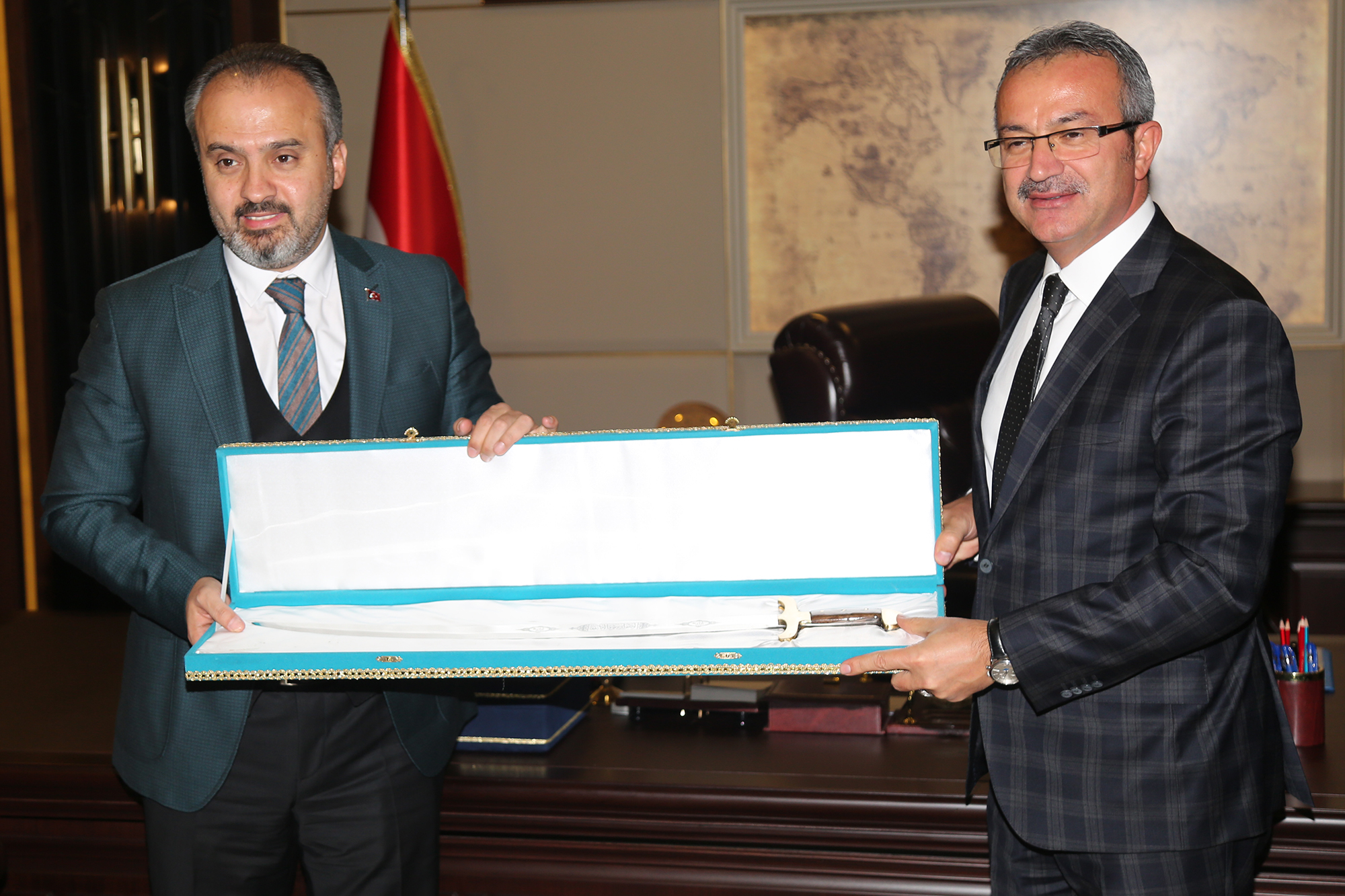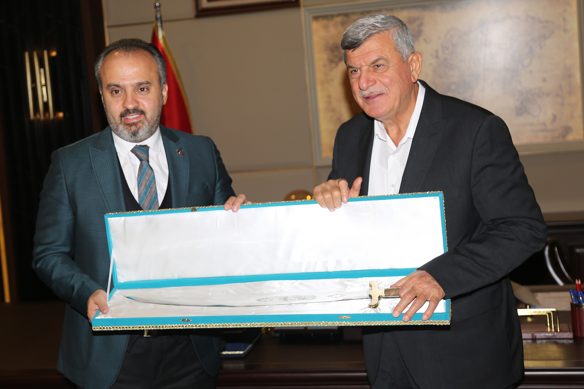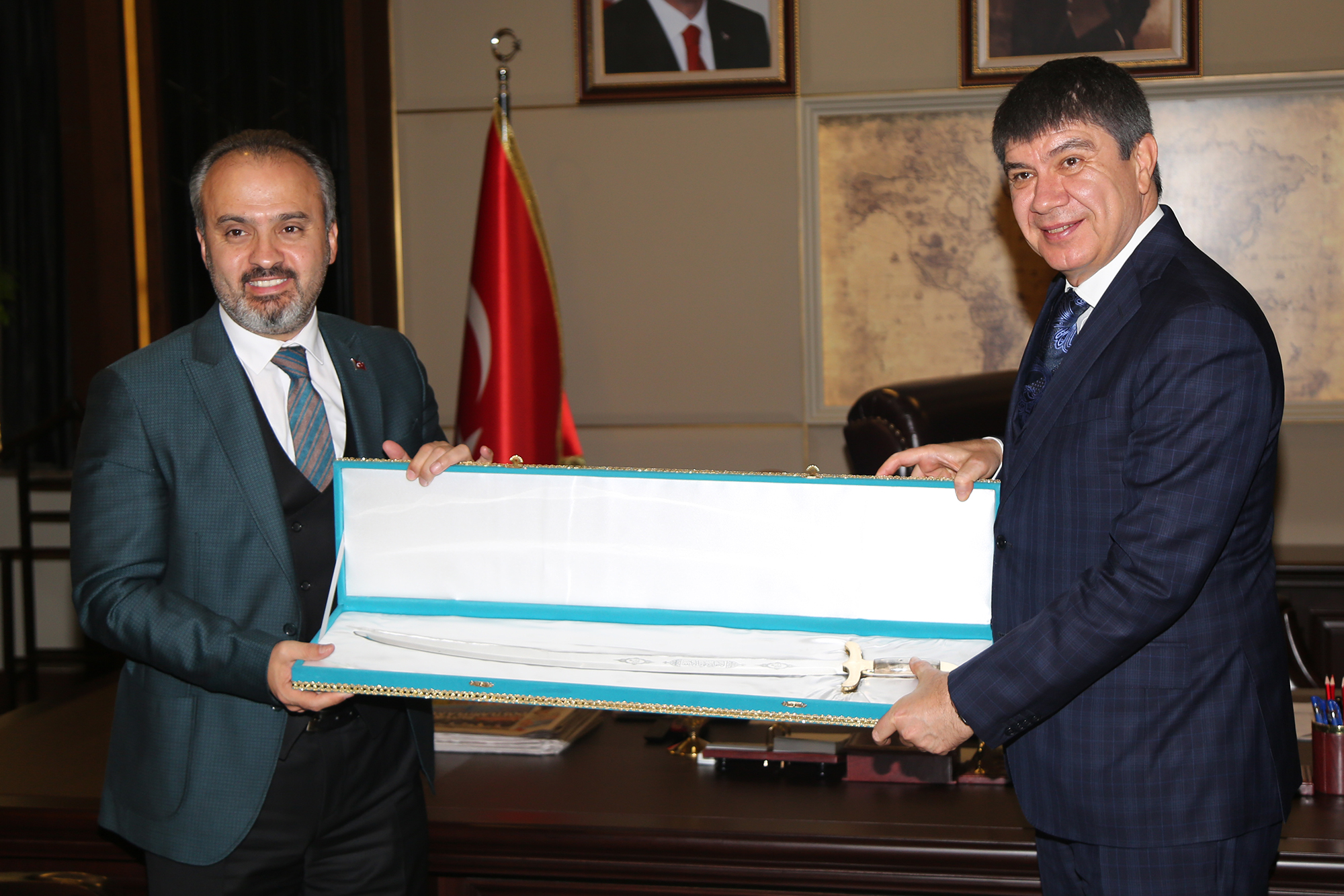 Milletvekili Şahin, Karaosmanoğlu ve Türel’in hizmetleriyle Bursa’da yapılacak hizmetlere öncülük edeceğine de değinerek, “Yeni Belediye Başkanımız da inşallah Bursa’mızda çok önemli işler yapacak. Bizler, halka hizmeti Hakk’a hizmet anlayışıyla düstur edinerek siyaset yapan bir ekolün temsilcileriyiz. Dolayısıyla siyaset yaparken temel önceliğimiz, halkın istekleridir. Bunu da Hakk’ı gözeterek yapıyoruz. İnşallah Bursa’mızı bundan öncekilerin yönettiği gibi başarıyla daha ileriyle götürmek için elimizden gelen gayreti göstereceğiz. Merkezi hükümetin her türlü desteği, Bursa Büyükşehir Belediyemizin ve diğer belediyelerimizin yanında olacak. Belki hükümetimizin desteğinin de sağlanacağı çok önemli projeler var. İnşallah güzel günler göreceğiz” diyerek, başkanlara çalışmalarında başarılar diledi. Gebze Belediye Başkanı Adnan Köşker’in de katıldığı ziyarette Başkan Aktaş, konuklarına Bursa’ya özgü el yapımı kılıçları hediye etti.