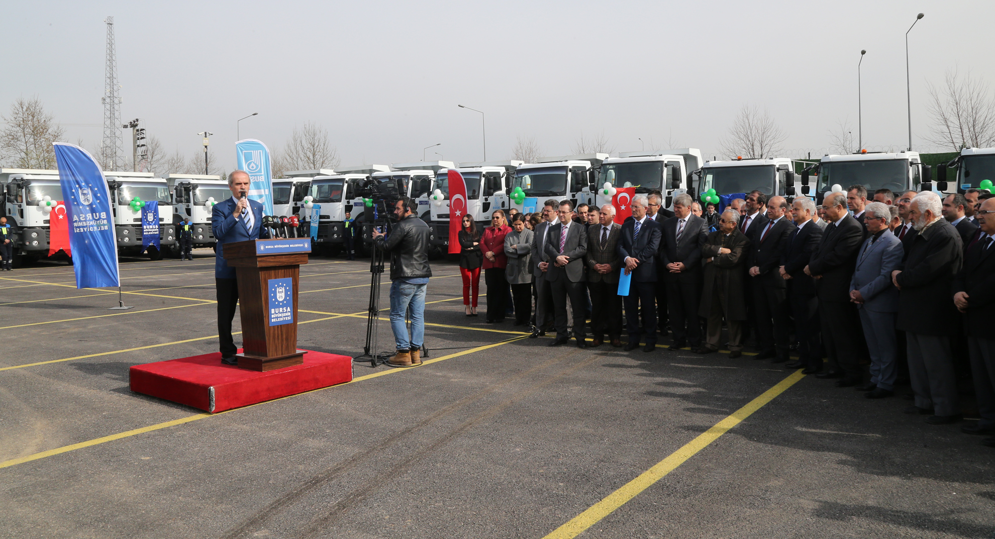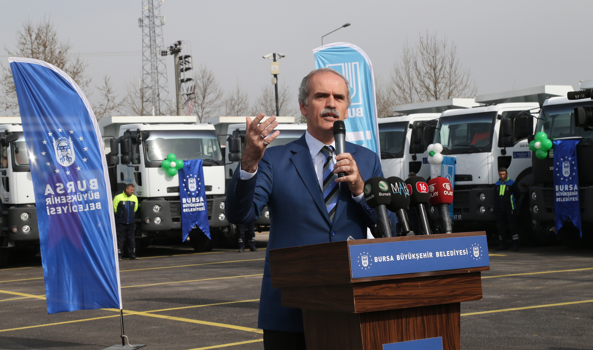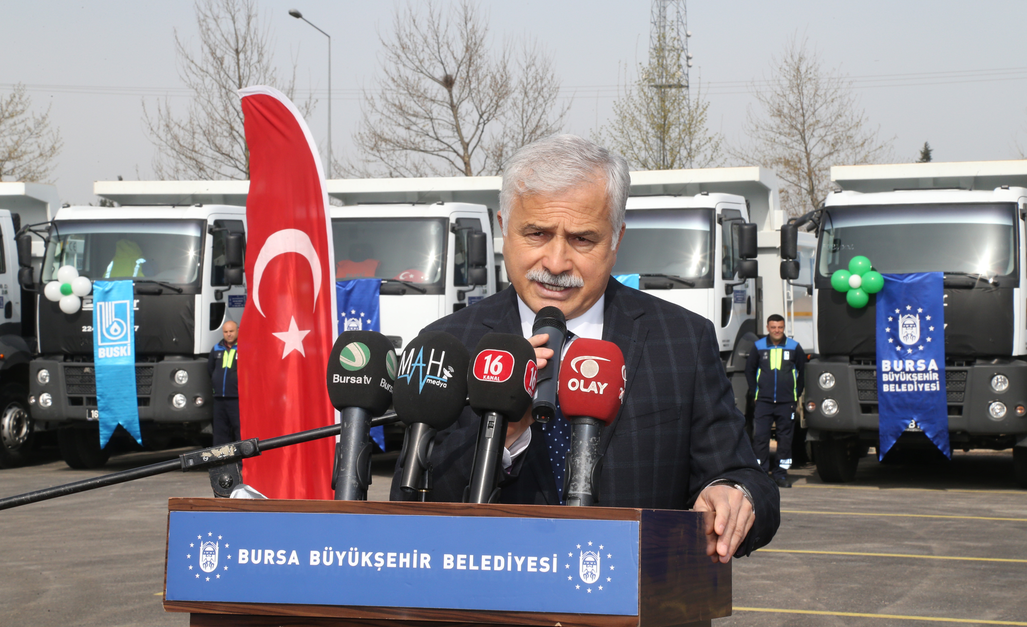 Büyükşehir Belediye Başkanı Recep Altepe, 17 ilçede 1070 mahallede kesintisiz hizmet verdiklerini belirterek, yeni alınan yaklaşık 11 milyon TL’lik 61 yeni iş makinesi ile Büyükşehir Belediyesi’nin gücüne güç kattıklarını söyledi. BUSKİ’nin her bölgeye sağlıklı içme suyu ulaştırılması, kanalizasyon ve yağmur suyu hatları döşenmesi, sahillerin temizlenmesi için arıtma tesisleri kurulması yanında su havzalarının korunmasından arıtma tesislerinde biriken çamurun yakılmasını sağlayacak tesisleri kurmaya kadar geniş bir alanda hizmet ürettiğini dile getiren Başkan Altepe, “Arıtma tesislerindeki çamurların en modern şekilde bertaraf edilmesi ve buradan çıkan enerji ile elektrik üretilmesi konusundaki tesisleri de Bursa’da yapıyoruz. Bursa artık metro, tramvay ve uçak üretmenin yanında son teknoloji çamur yakma tesislerini de üretiyor. Bir taraftan çamur yok edilirken, diğer taraftan 2,5 megavat elektrik üretmiş olacağız. Bu tesislerin de çok yakında ihracatını yapmış olacağız. Bizim artık dışardan almayı bırakıp, dışarıya satmamız lazım. Sadece 60 vagon ve 12 tramvayın Bursa’da üretilmesi ile 440 milyon TL kar sağladık. Bu iki stadyum parası demek. Bu kadar Bursa’daki diğer yatırımlar için kasada kalmış oldu. Bugün yeni hizmete giren araçlarımızla da gücümüze güç katmış oluyoruz. Bursa’mız için hayırlı olsun” diye konuştu.