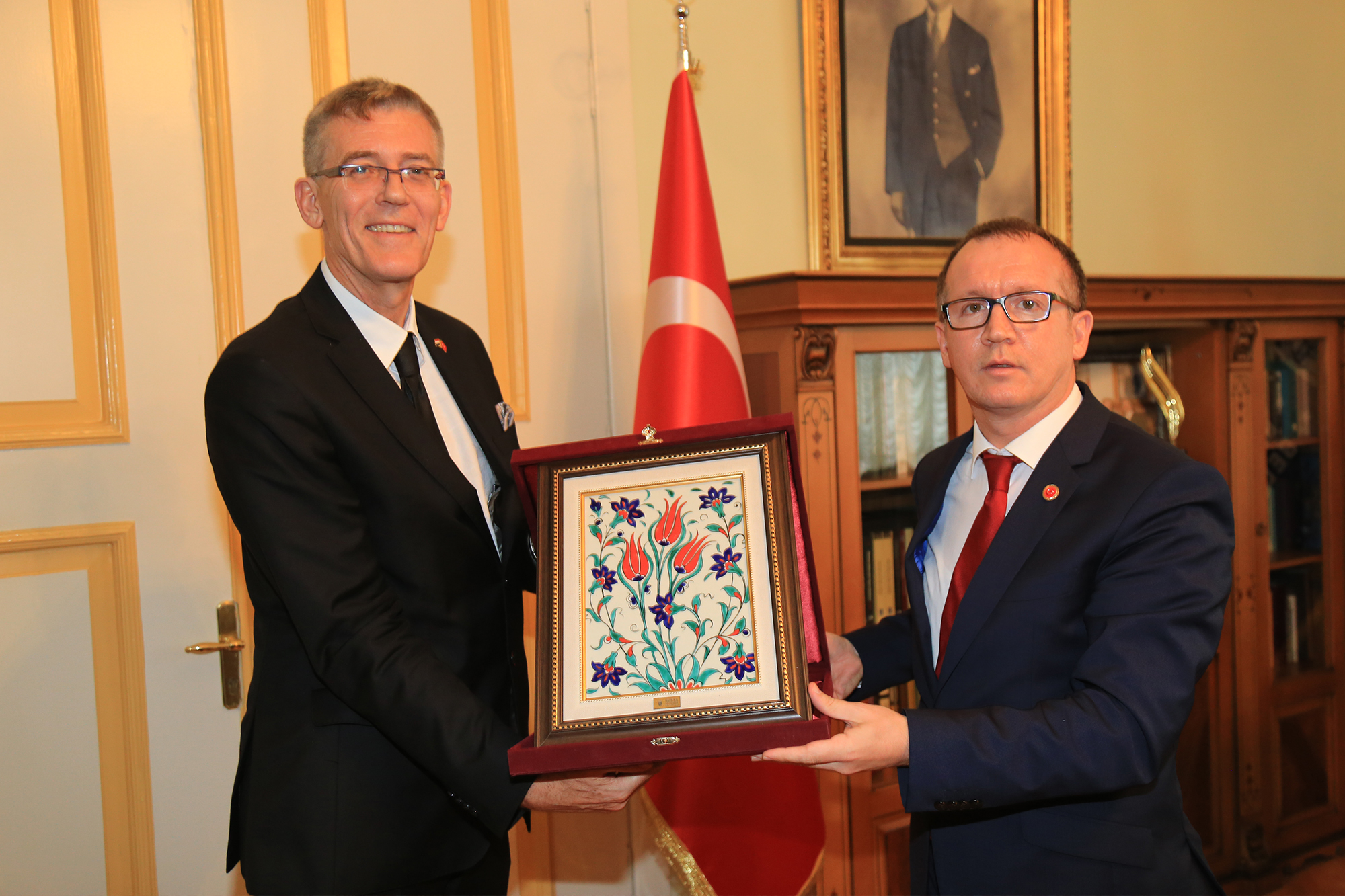 Başkanvekili Karlık, yabancı heyete ziyaretin anısına İznik çinisinden yapılmış şilt ile Bursa’ya has hediyeler takdim etti. Başkonsolos Schuddeboom ise Karlık’a, çiniden yapılmış tablo takdim etti. Ziyaret, çektirilen hatıra fotoğrafının ardından son buldu.