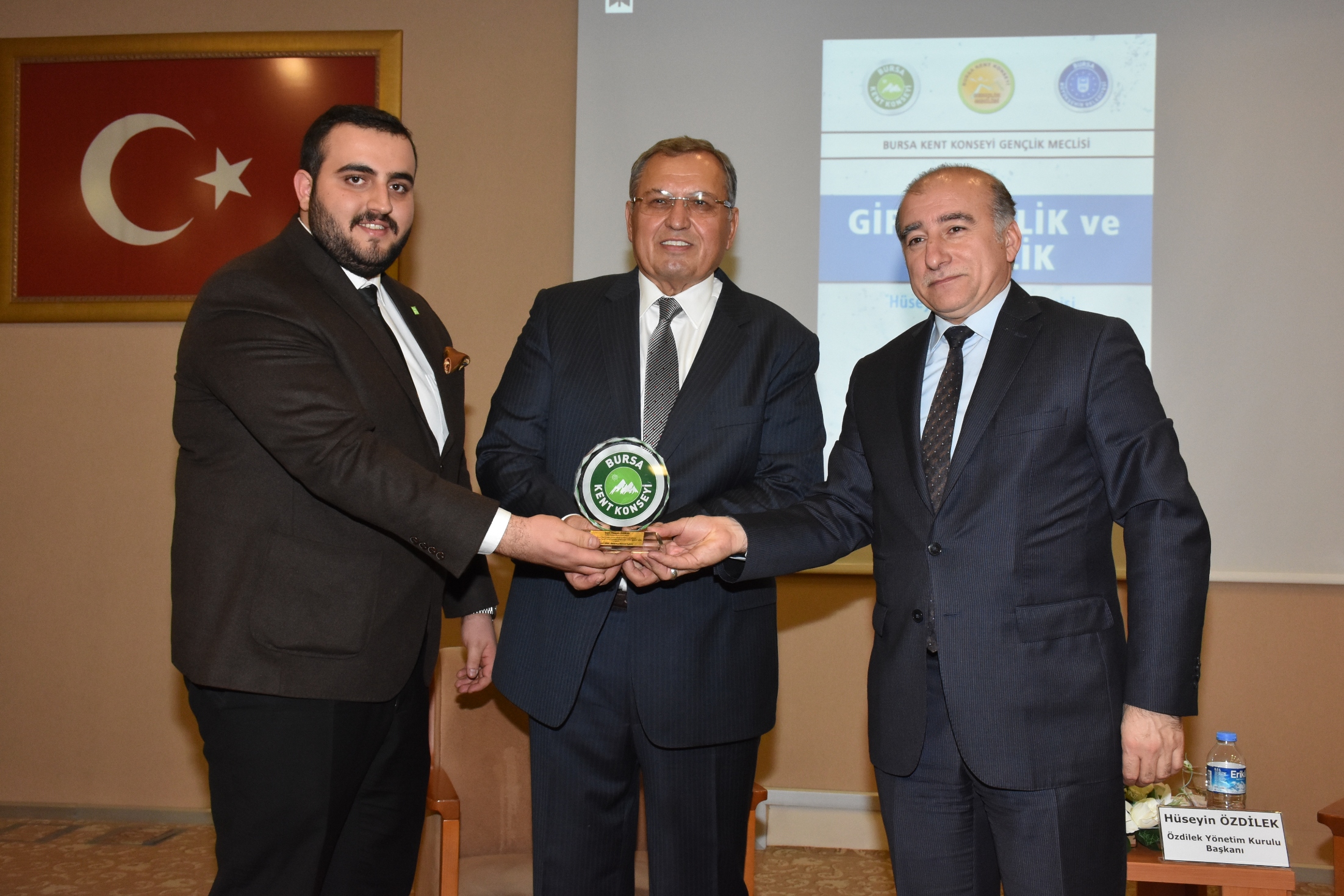 Konuşmaların ardından Bursa Kent Konseyi Başkanı Hasan Çepni tarafından iş adamı Hüseyin Özdilek’e günün anısına plaket takdim edildi.