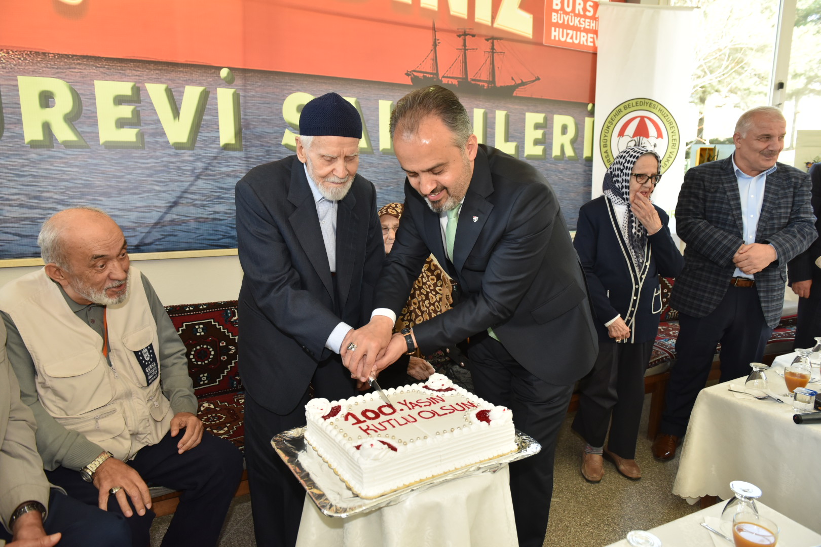 Bursa Büyükşehir Belediye Başkanı Alinur Aktaş, Büyükşehir Belediyesi Huzurevi’nde 100’üncü yaşını kutlayan Şevket Özcan’la birlikte doğum günü pastası kesti.