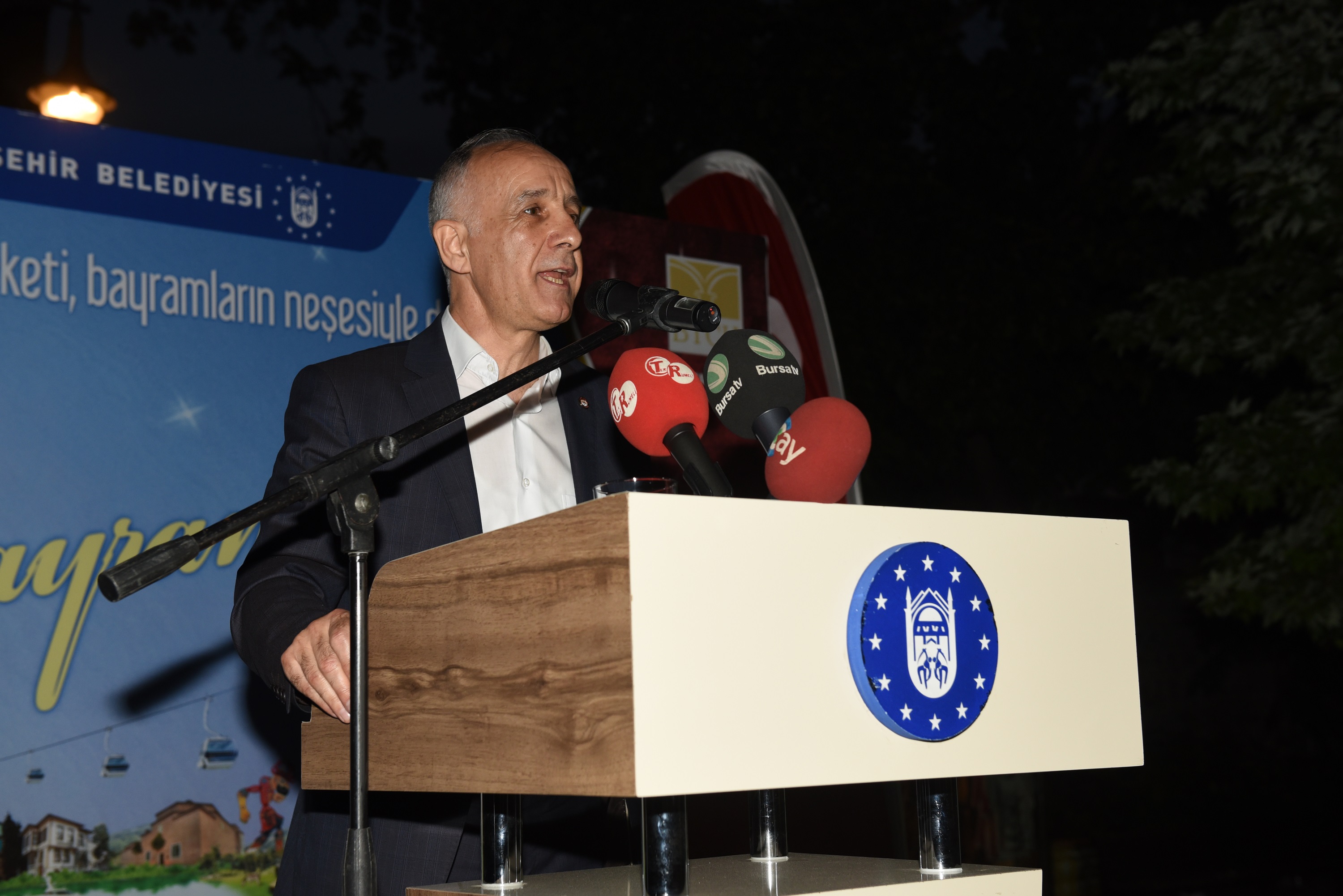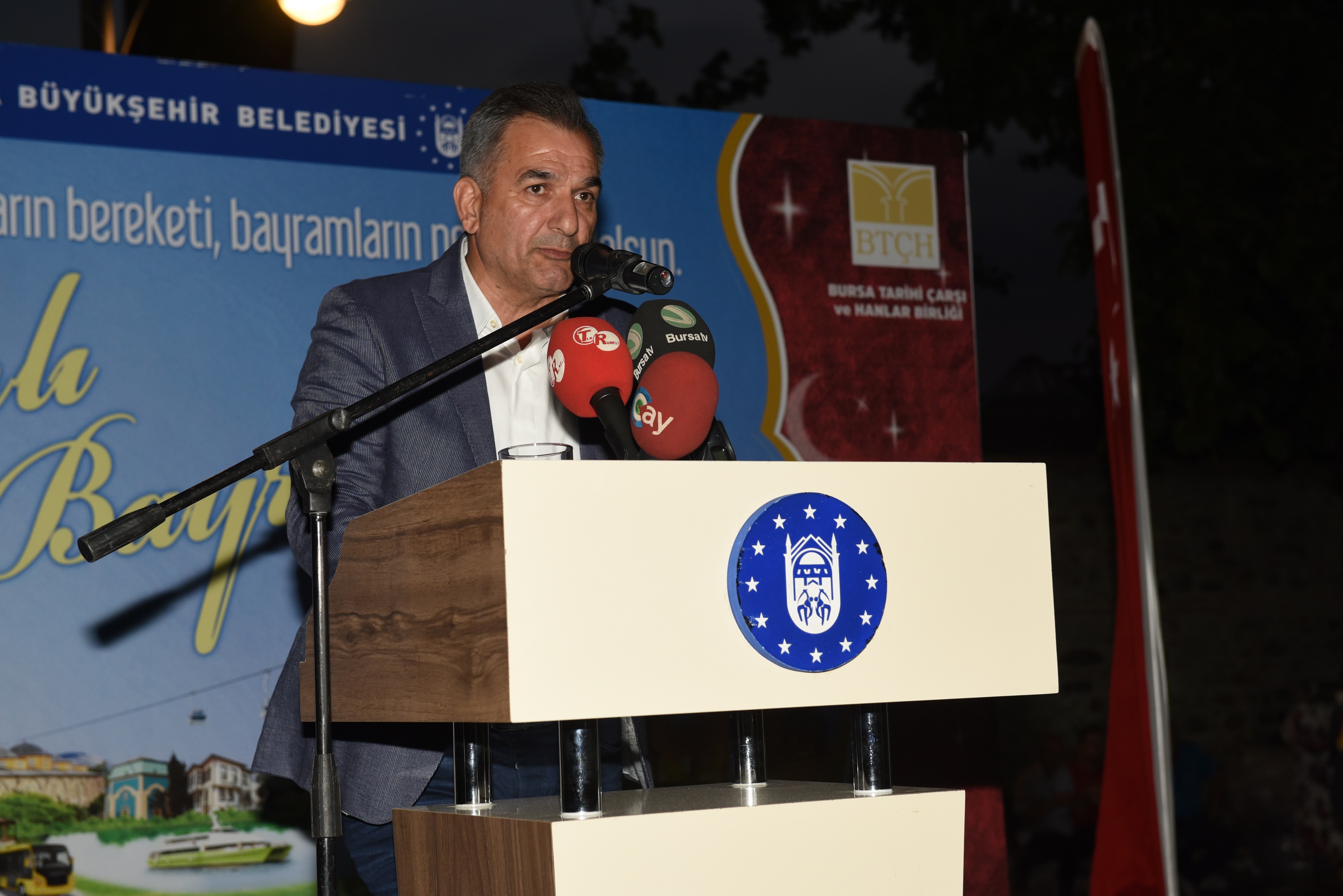 Bursa Valisi İzzettin Küçük de huzurlu bir Ramazan ayı geçirildiğini ifade ederek, “Bursa, bağrında yaşayan insanları yücelten, aş, iş, ekmek veren, onları güçlendiren bir şehirdir. Bu şehir kim geldiyse bağrına basmış, sevgiyle yanında tutmuş bir şehirdir. Bugün de 15 bine yakın değerli hemşehrimizle bir araya geldik. Birlikteliğimiz çok önemlidir. Birbirimize omuz vermek, iyi niyet ve sevgi beslemektir. Bu sofraların manası budur. Beraberliğimiz, birbirimize olan sevgimiz bu sofralarda asıl paylaşılan şeydir. Bu birliktelik, sevgi, birbirimize olan inanç, pek çok sorunu aşmamıza neden olmuştur ve bundan sonra bizi daha güçlü kılacak olan şey de budur. Esnaflarımız, çarşımız bizim şehrimizin merkezidir, ana kalbidir, atardamarıdır. Şehir, ahlak, kültür ve değerlerimiz olarak buradan beslenir. Esnaf kardeşlerim çok kıymetli insanlardır. Bu kültürü ve değeri uzun zamandır yaşattıkları için tebrik ediyorum” diyerek Bursalıların bayramını da kutladı.