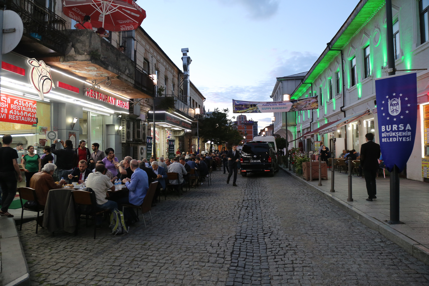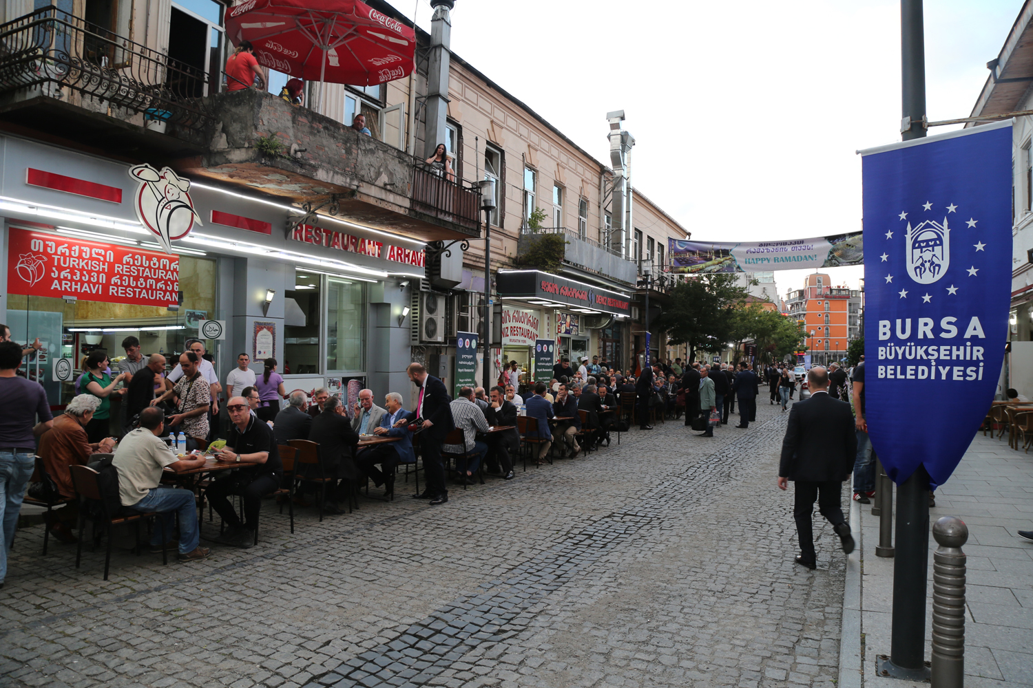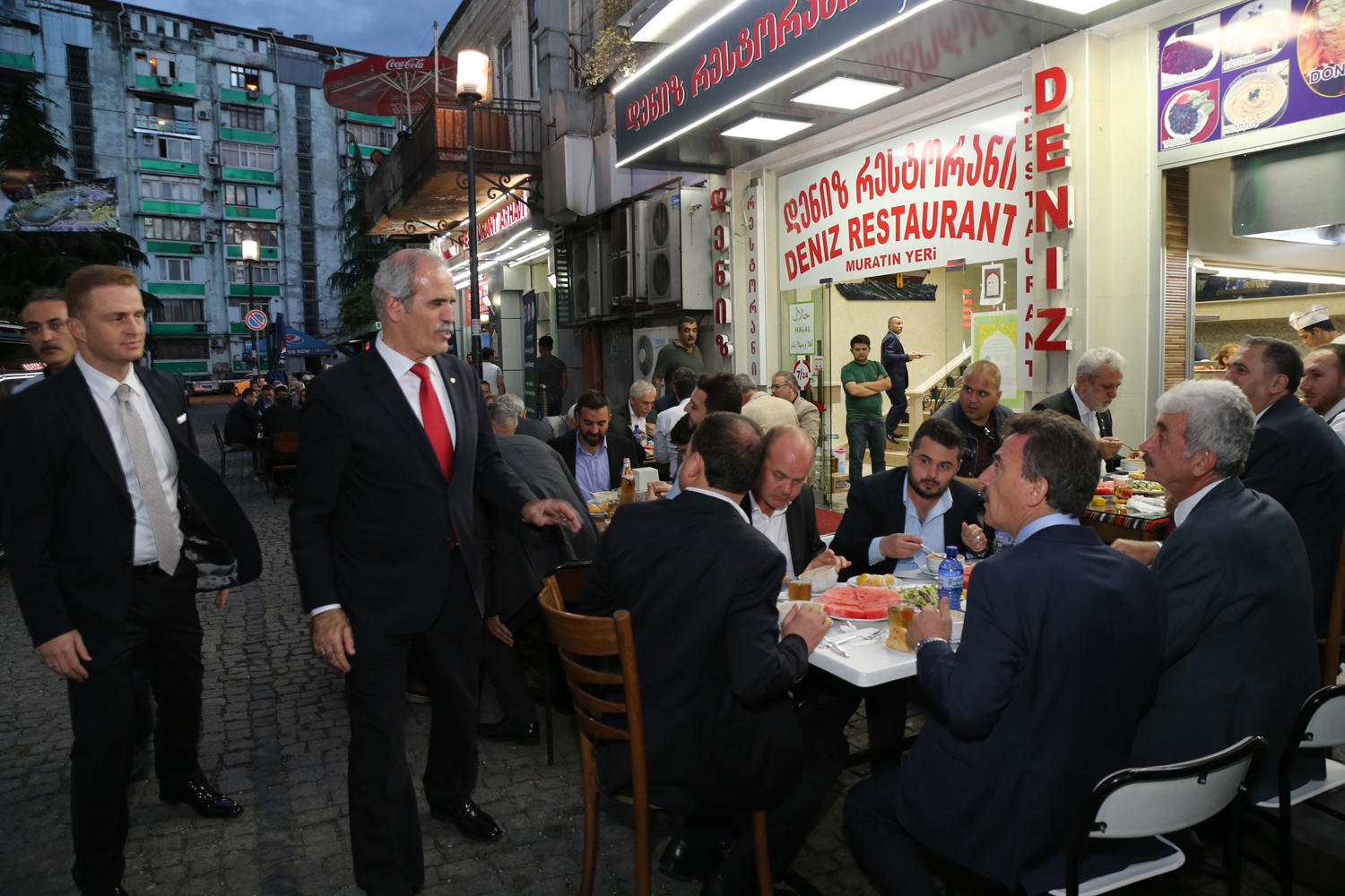 Batum çarşı meydanındaki iftar yemeğine Bursa´dan tam bir çıkarma oldu. Türk işletmelerin yer aldığı ve Türk Sokağı olarak adlandırılan bölgede 7 ayrı lokantada verilen yemeğe, Çalışma ve Sosyal Güvenlik Bakanı Dr. Mehmet Müezzinoğlu, AK Parti MKYK Üyesi Efkan Ala, Bursa Valisi İzzettin Küçük, AK Parti İl Başkanı Cemalettin Torun, AK Parti Bursa milletvekilleri Hakan Çavuşoğlu, Hüseyin Şahin, Muhammet Müfit Aydın ve Emine Yavuz Gözgeç, Bursa Ticaret ve Sanayi Odası Başkanı İbrahim Burkay ile Bursa ve Gürcistan´dan Müslümanlar katıldı.