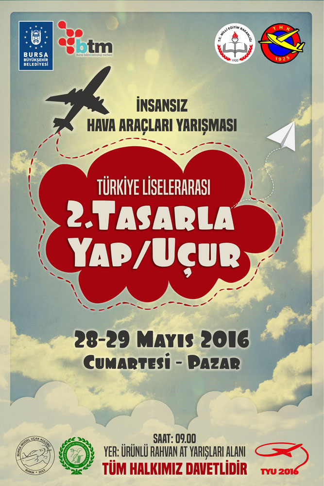 Bursa Büyükşehir Belediyesi’nin vizyon projelerinden biri olan Bursa Bilim ve Teknoloji Merkezi uçuş meraklılarının gözdesi olan insansız hava araçlarını 28-29 Mayıs’ta Ürünlü’de yarıştırıyor. BTM ile Tophane Endüstri Meslek Lisesi’nin ev sahipliğinde, Bursa Model Uçak Kulübü’nün katkılarıyla gerçekleştirilen ‘2. Türkiye Liselerarası İnsansız Hava Araçları Yarışması’, 28-29 Mayıs tarihlerinde Ürünlü’de yapılacak.