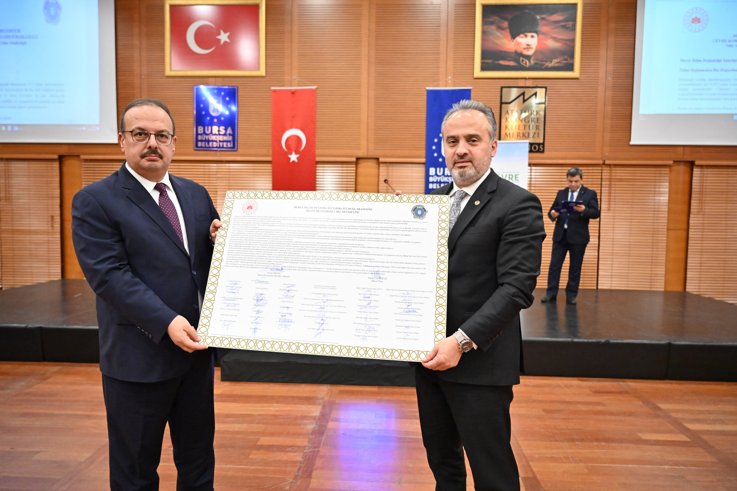 Bursa Büyükşehir Belediyesi Çevre Koruma ve Kontrol Dairesi Başkanı Yıldız Odaman Cindoruk’un “Büyükşehir Belediyesi’nin İklim Değişikliğiyle Mücadeleye Yönelik Çalışmaları” ve Çevre Uzmanı Emine Çelebioğlu’nun, “Türkiye’nin Uluslararası ve Ulusal Ölçekteki İklim Değişikliği Çalışmaları” ile ilgili sunumunun ardından, deklarasyona ilk imzayı Başkan Aktaş ile Vali Canbolat attı.