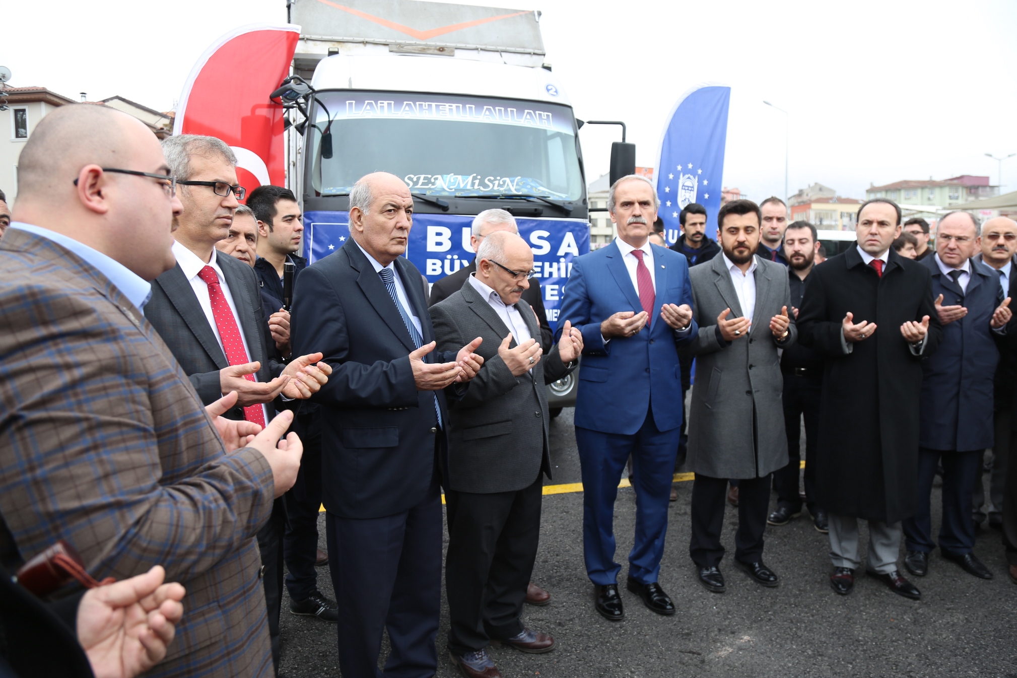 Suriye’deki savaşta yaralanan ve ilaç olmadığı için hayat mücadelesi veren Müslümanlar için Bursa’da başlatılan ilaç seferberliği, Büyükşehir Belediyesi’nin desteğiyle çığ gibi büyüyor. Büyükşehir Belediye Başkanı Recep Altepe’nin bu konuda seferberlik başlatarak halka çağrıda bulunmasının ardından oluşturulan ilk Tır, yola çıkarıldı. İlaç ve gıda maddelerinden oluşan yardım Tırı, Büyükşehir Belediyesi’nin Doğanbey Otoparkı’nda düzenlenen törenle bölgeye uğurlandı.