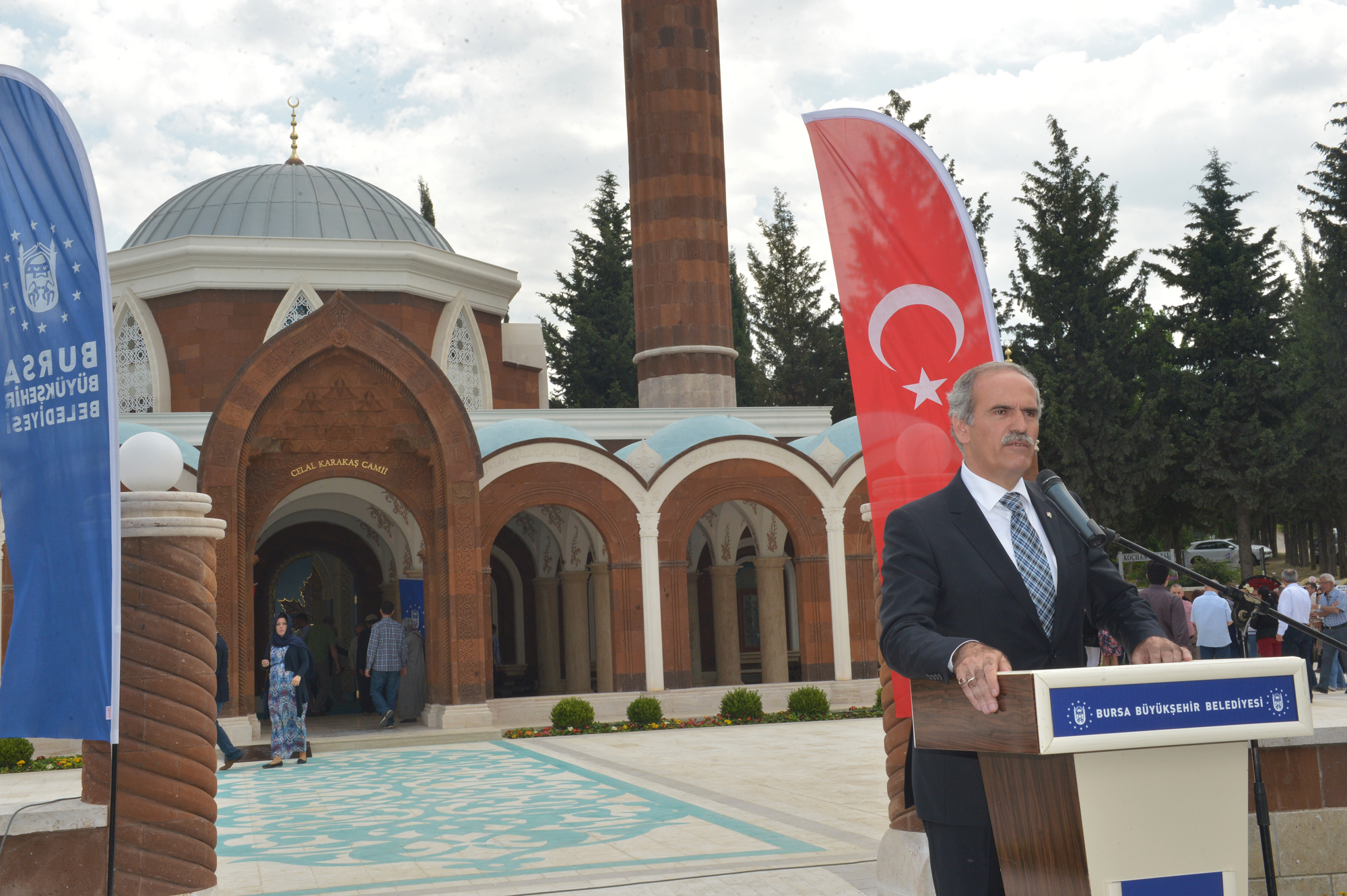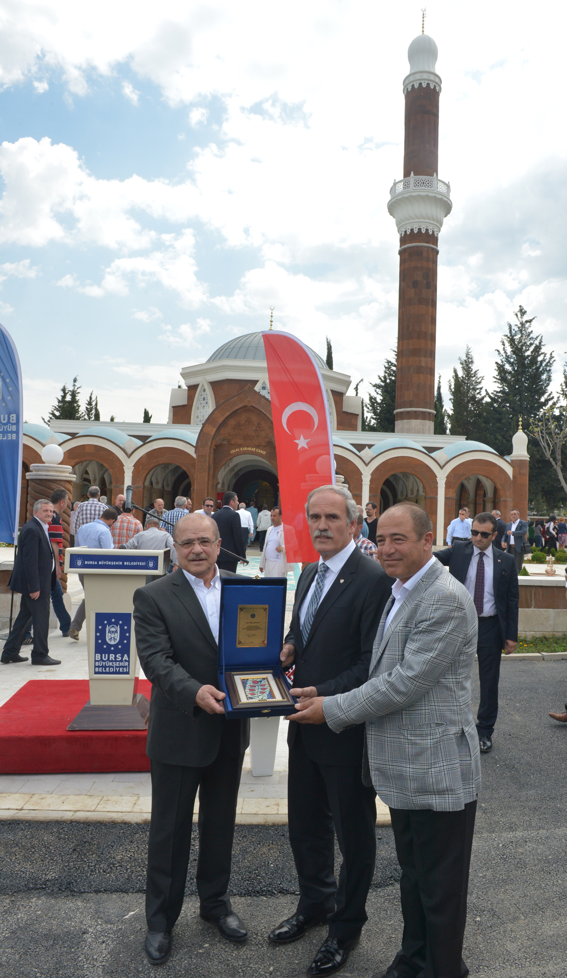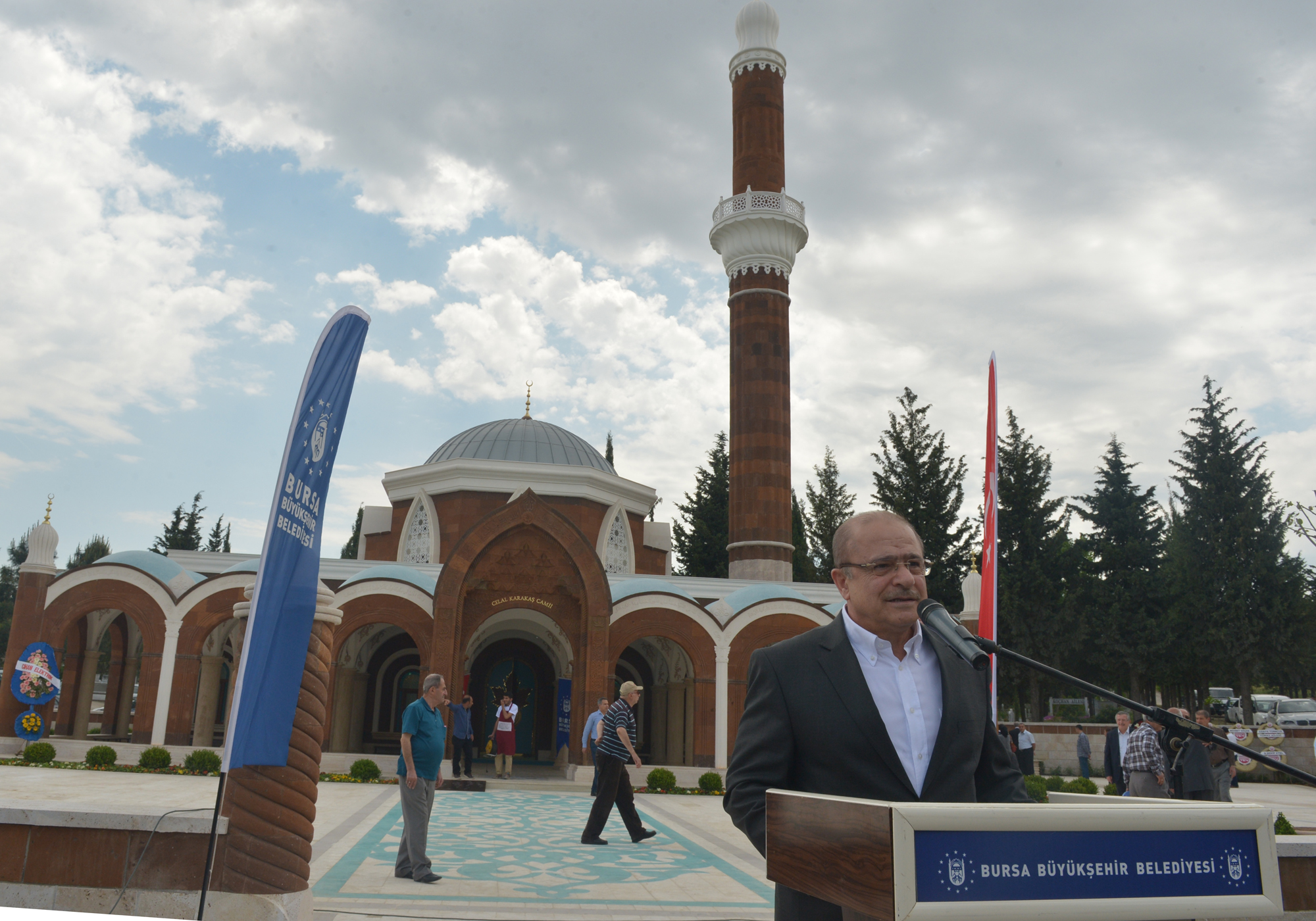 Başkan Altepe, Nezir ve Metin Karakaş’ın büyük bir vefa ve fedakârlık örneği gösterdiğini ifade ederek, “Camiye merhum Celal Karakaş’ın adı verildi. Cami inşa çalışmaları, 18 Ocak 2012 tarihinde imzalanan protokolle başlamıştı ve bugün de mimari özellikleriyle çevreye uyumlu bir yapı ortaya çıktı. Bu sayede Bursa çok özellikli bir anıtsal esere daha kavuştu. Gün içinde yoğunluğun yaşandığı mezarlığın cami ihtiyacı da cevabını bu sayede buldu. Cami yaptırmak herkese nasip olmaz. Çok özenle ve itinayla yapılan bu eser, iman gücünü yansıtan özel anıtsal bir yapı oldu. Dünyada güzel bir eser bıraktıkları ve Bursa’mıza böyle anlamlı bir eser kazandırdıkları için Karakaş ailesine teşekkür ediyorum” diyerek, hayırsever işadamı Nezir Karakaş’a çini plaket verdi.