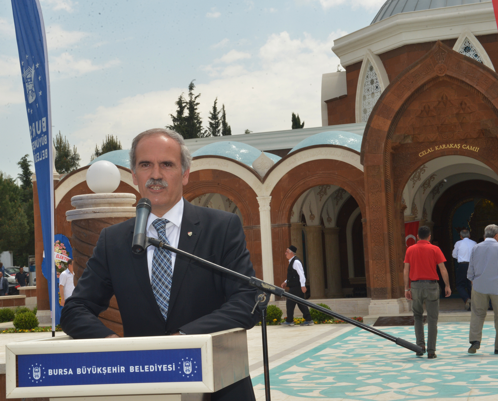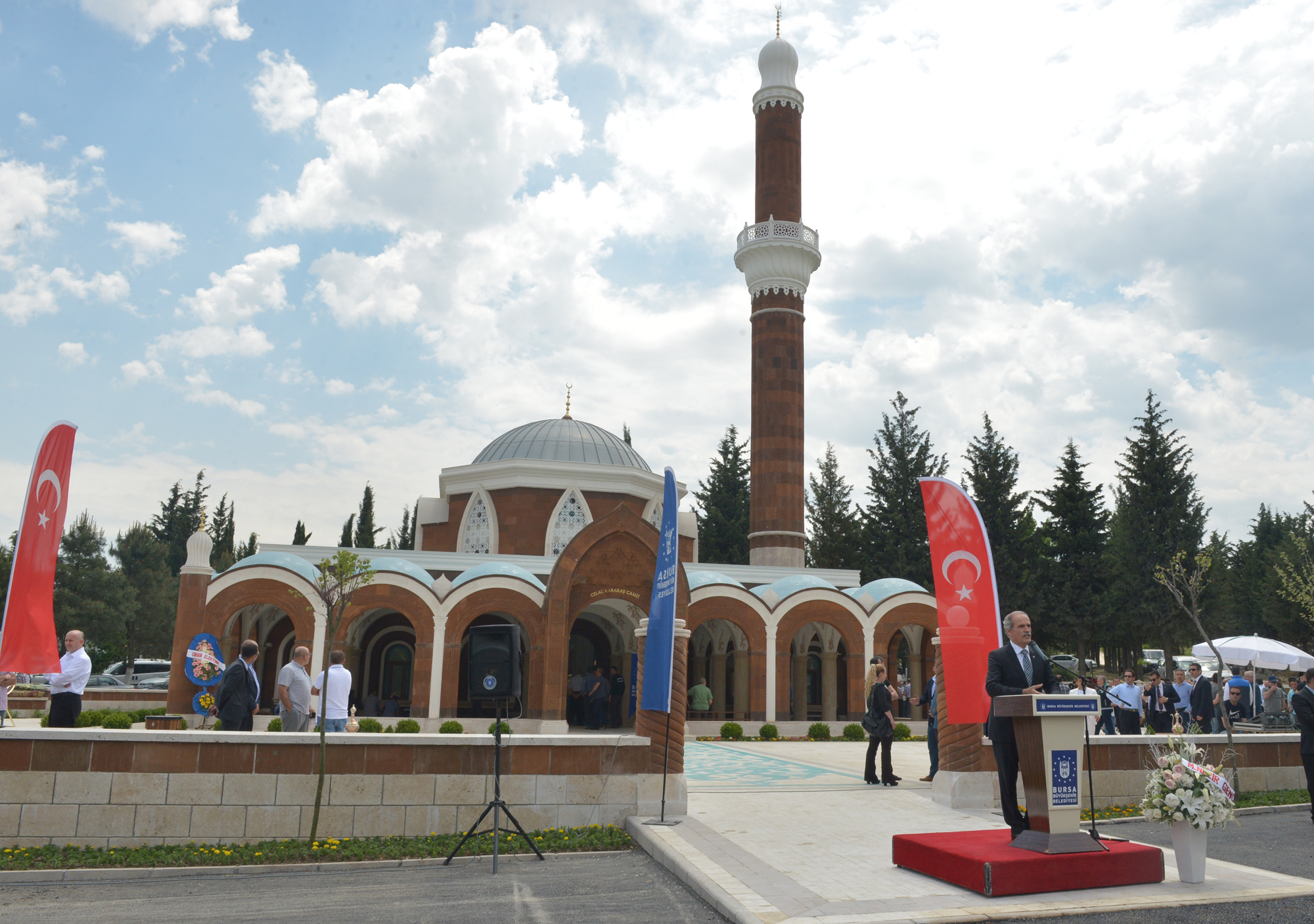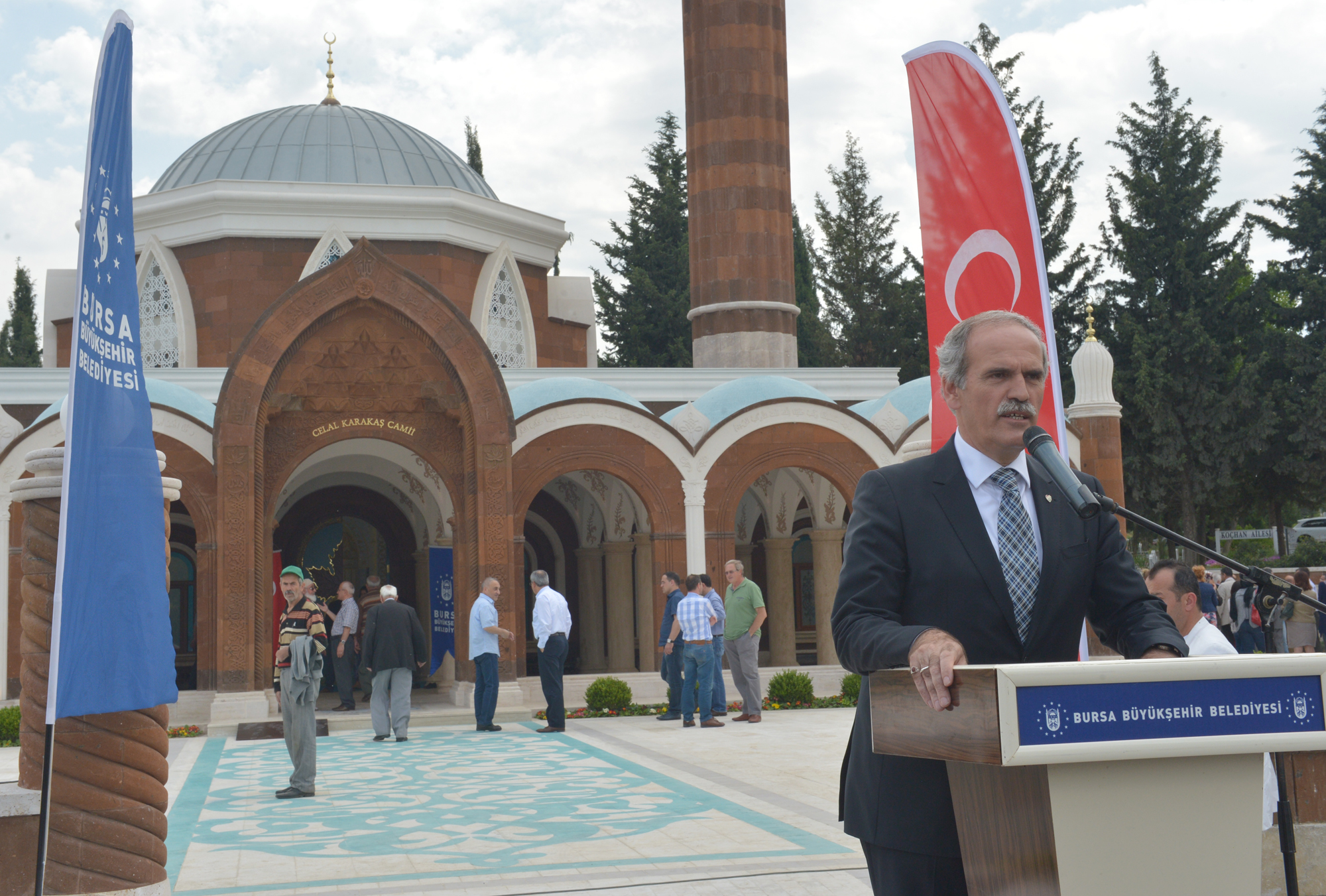 Başkan Altepe, Nezir ve Metin Karakaş’ın büyük bir vefa ve fedakârlık örneği gösterdiğini ifade ederek, “Camiye merhum Celal Karakaş’ın adı verildi. Cami inşa çalışmaları, 18 Ocak 2012 tarihinde imzalanan protokolle başlamıştı ve bugün de mimari özellikleriyle çevreye uyumlu bir yapı ortaya çıktı. Bu sayede Bursa çok özellikli bir anıtsal esere daha kavuştu. Gün içinde yoğunluğun yaşandığı mezarlığın cami ihtiyacı da cevabını bu sayede buldu. Cami yaptırmak herkese nasip olmaz. Çok özenle ve itinayla yapılan bu eser, iman gücünü yansıtan özel anıtsal bir yapı oldu. Dünyada güzel bir eser bıraktıkları ve Bursa’mıza böyle anlamlı bir eser kazandırdıkları için Karakaş ailesine teşekkür ediyorum” diyerek, hayırsever işadamı Nezir Karakaş’a çini plaket verdi.