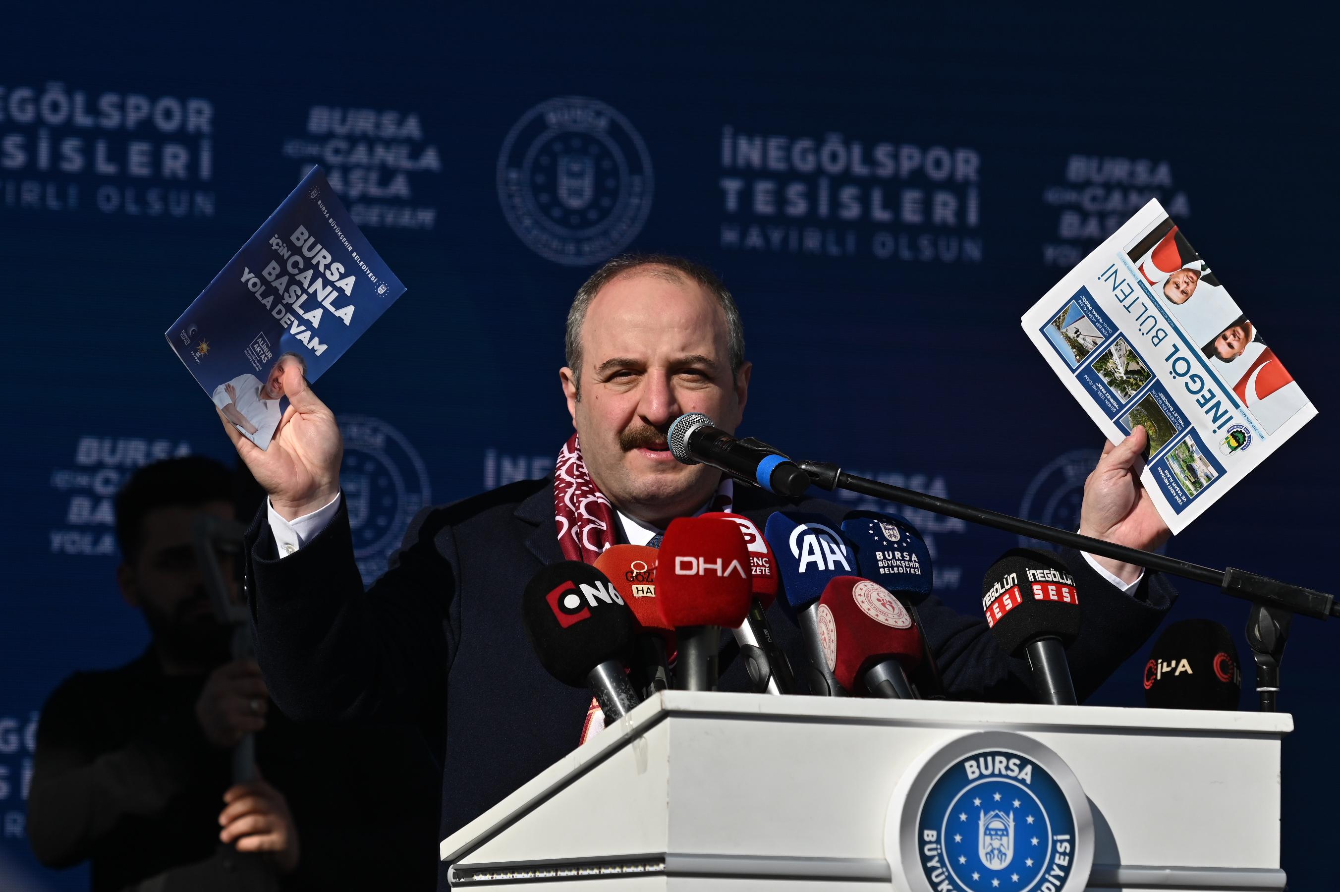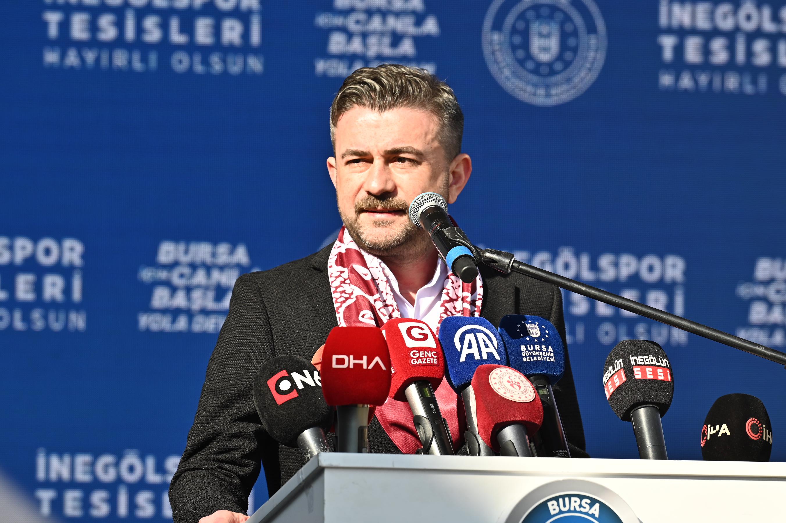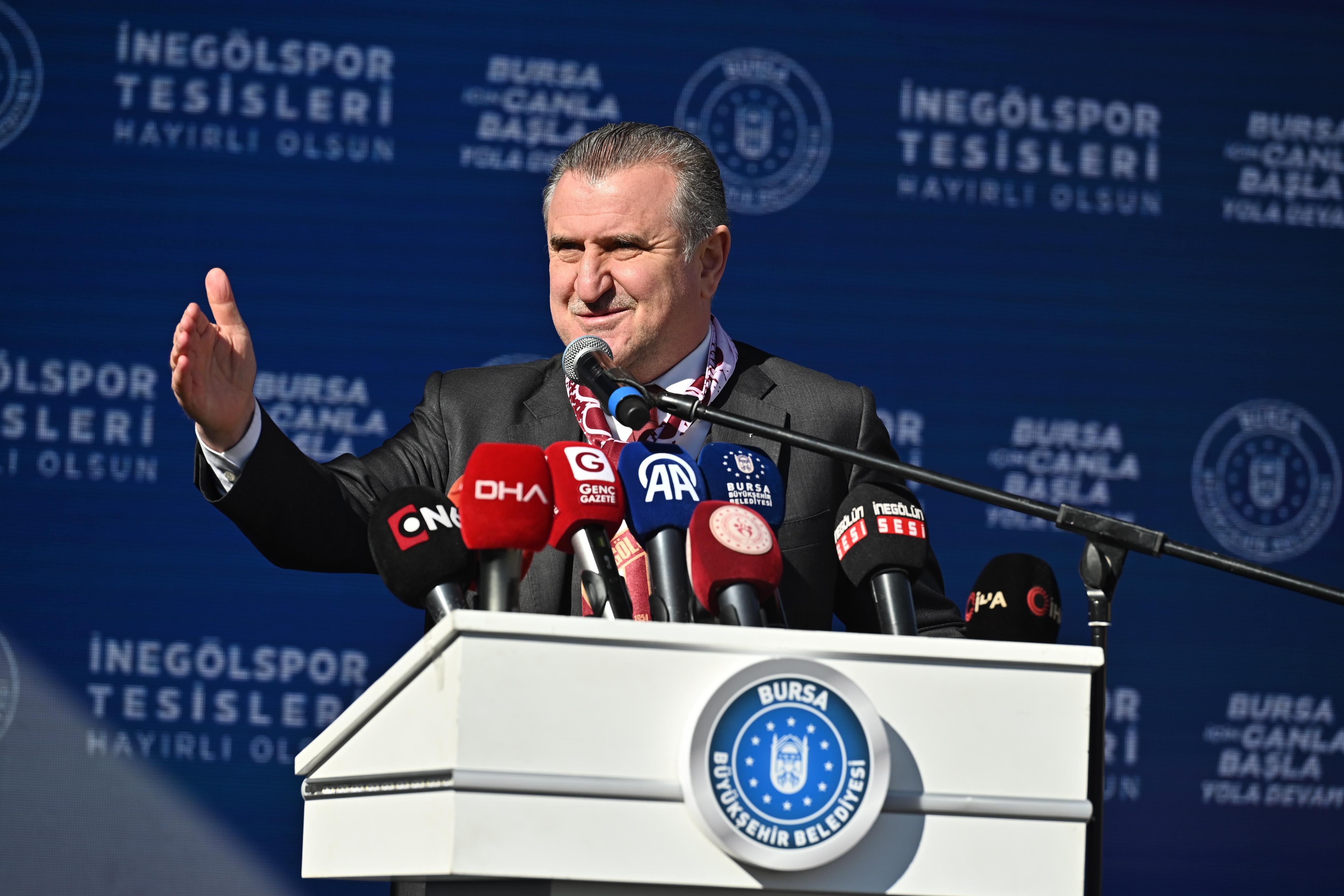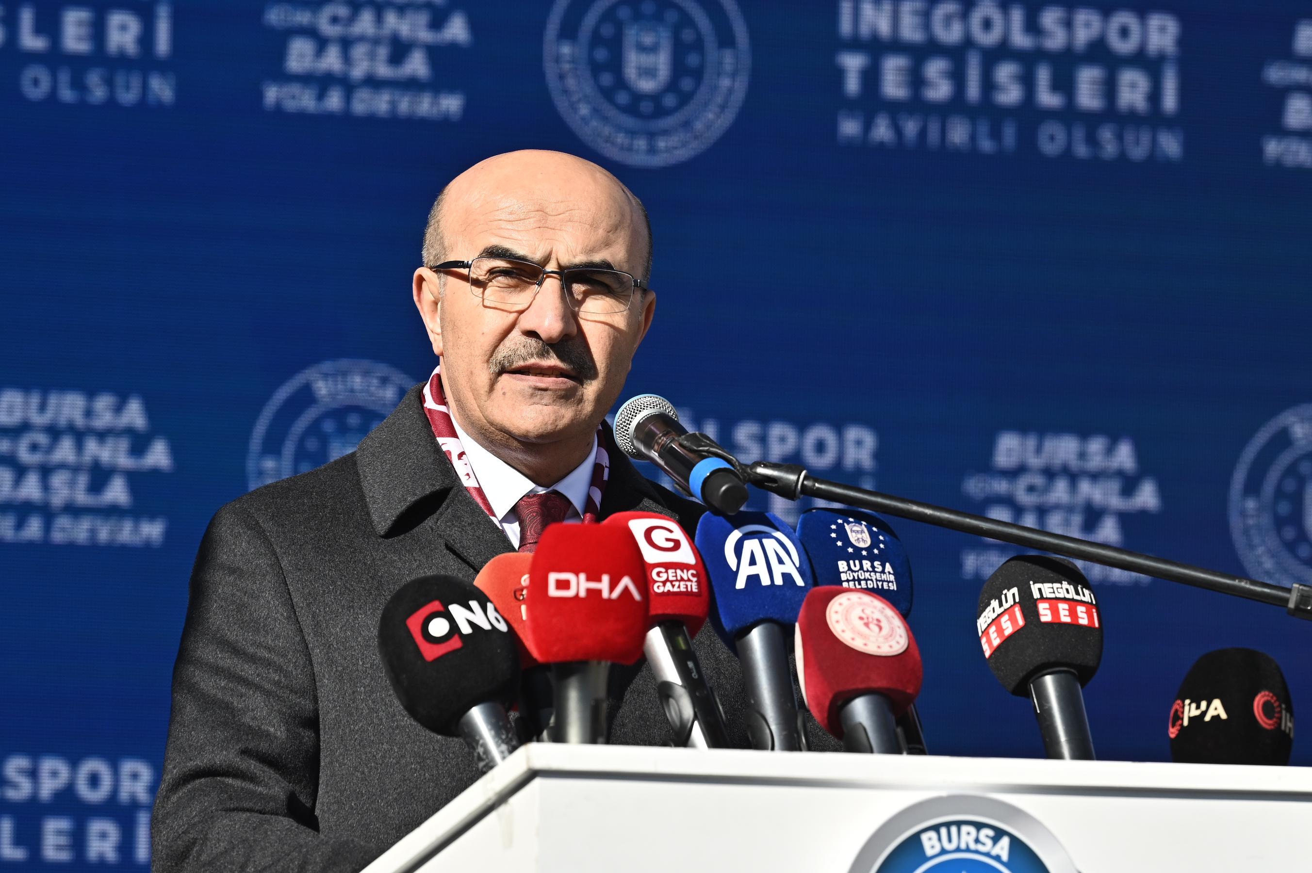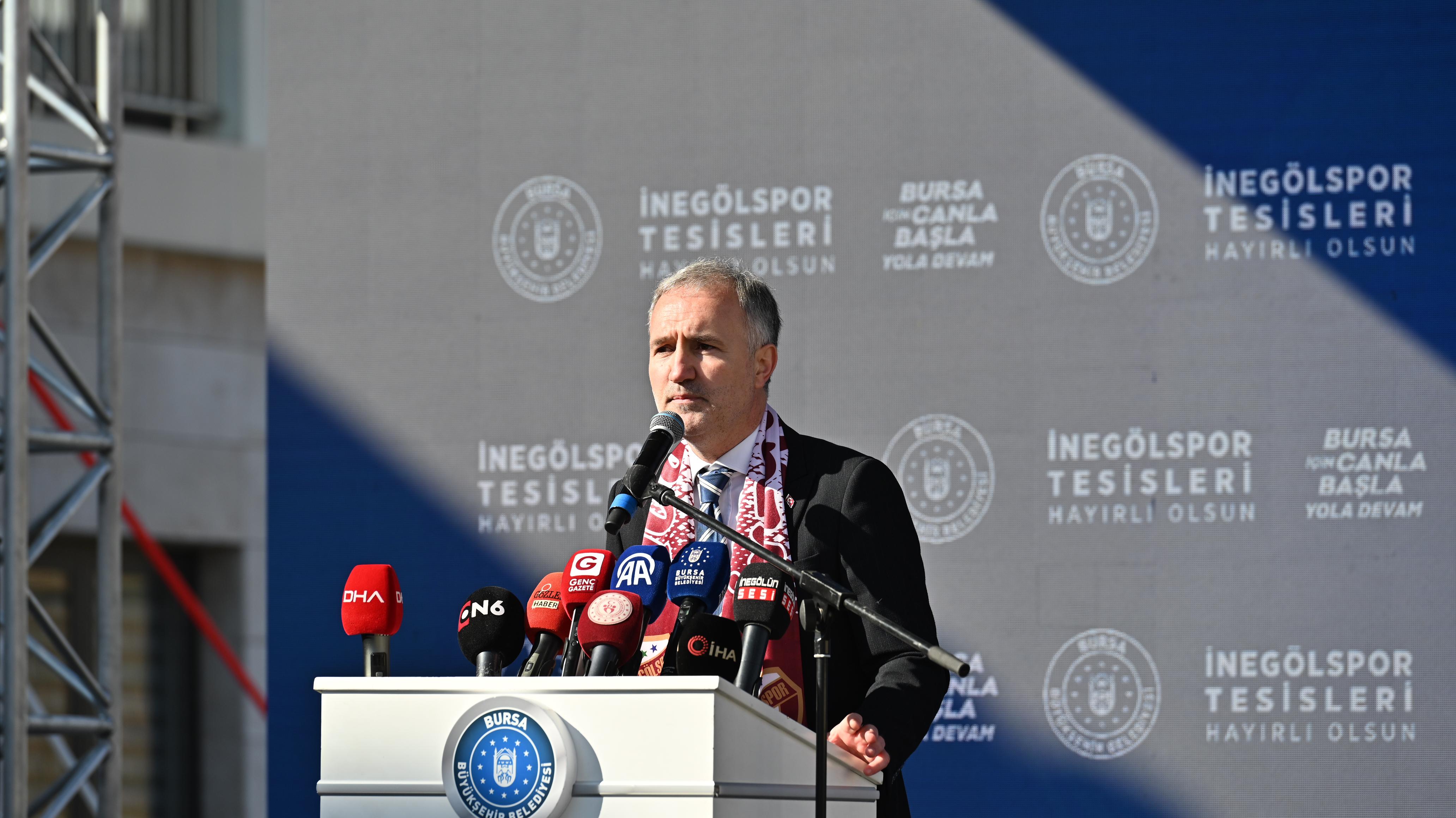 Gençlik ve Spor Bakanı Osman Aşkın Bak, açılışı yapılan tesisin İnegölspor’un geleceğine mühür vuracağını belirtti. İnegölspor’u çok eskiden beri tanıdığını, 1996 yılında İstanbul Büyükşehir Belediyespor’un genel sekreterliğini yaparken bir futbolcu transferi için İnegöl’e gelerek Hikmet Şahin ile görüştüğünü anlatan Bakan Bak, Hikmet Şahin’in de İnegöl’e spor anlamında da büyük katkılar sunduğunu ifade etti. İnegölspor’un önemli oyuncular yetiştiren ve altyapısı güçlü bir takım olduğunu dile getiren Bak, “Türk sporuna hizmet etmiş çok önemli bir kulüp. İnegölspor’un yolu açık olsun. Böyle bir tesisin önemli olduğunu görüyoruz. Alinur başkan da buraya bir vefa borcunu yerine getirmiş oldu. Yerel yönetimlerle spor kulüplerinin ilişkileri çok önemlidir. Cumhurbaşkanımız Recep Tayyip Erdoğan’ın İstanbul Büyükşehir Belediye Başkanlığı döneminde yaptığı ilk işlerden birisi amatör spor kulüplerine spor sahaları yapmak, malzeme dağıtmak, tesislerini geliştirmek oldu. Bunu devam ettiriyor ve 22 senedir Türkiye bir spor devrimi yaşıyor. Türkiye’nin dört bir yanında UEFA standartlarında yapılan 36 tane stadyum var. Devam edenler var. Yüzlerce kapalı spor salonları, 700’ye yakın olimpik veya yarı olimpik yüzme havuzları var. Sporda büyük bir devrim var. Olimpiyatlardaki alınan başarılarla bunun sonuçlarını görüyoruz. En son grekoromen güreş milli takımımız, Avrupa Şampiyonu oldu. 31 sene sonra serbest güreş takımımız Avrupa Şampiyonu oldu. Bayan milli takımımız Avrupa ikincisi oldu. Halterde, tekvandoda sporcularımız birçok madalya kazandı. 2032 Avrupa Futbol Şampiyonası’na İtalya ile beraber Türkiye olarak ev sahipliği yapacağız. Bu yüzden Bursa’da ve diğer şehirlerde spor anlamında birçok yatırım var” dedi.