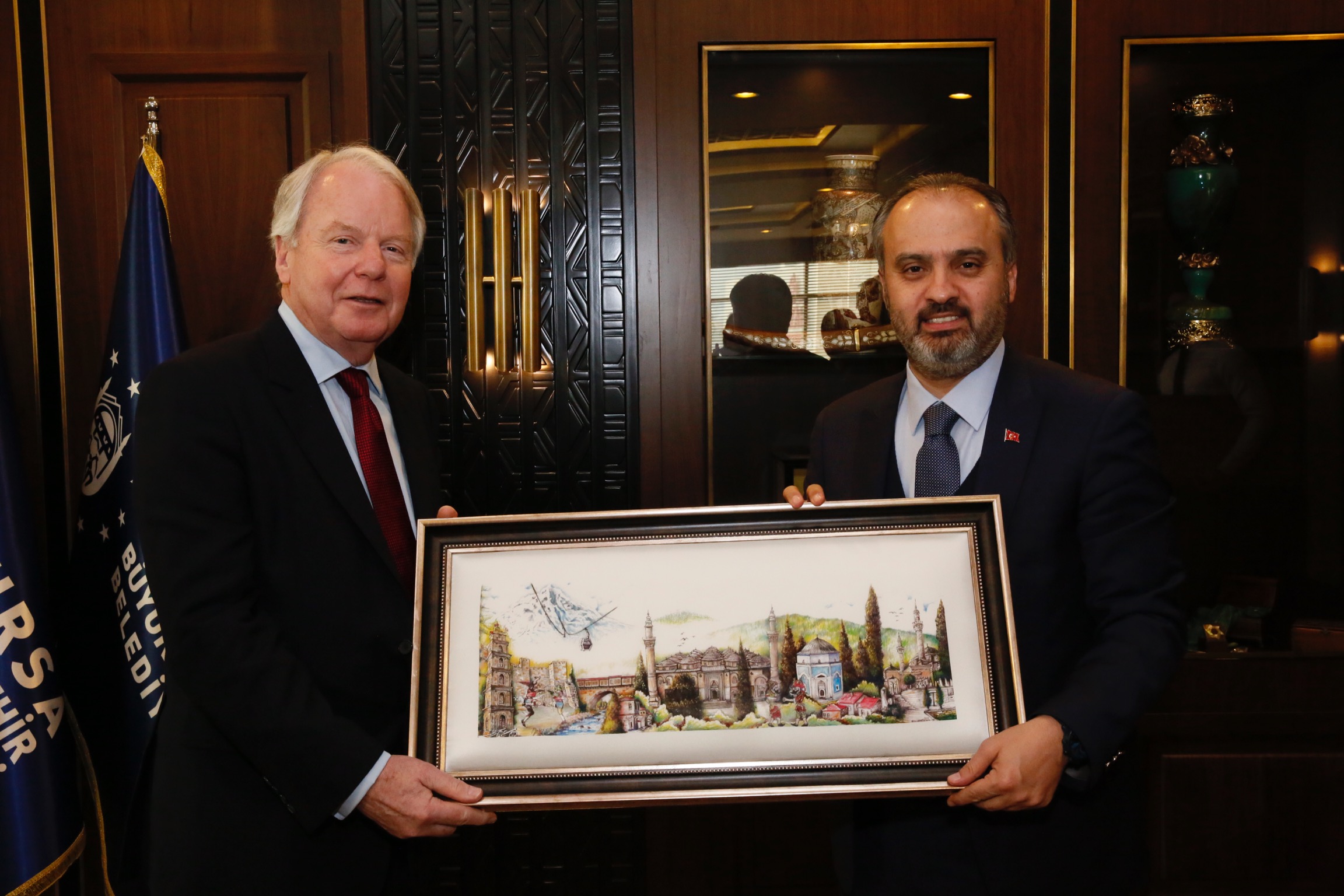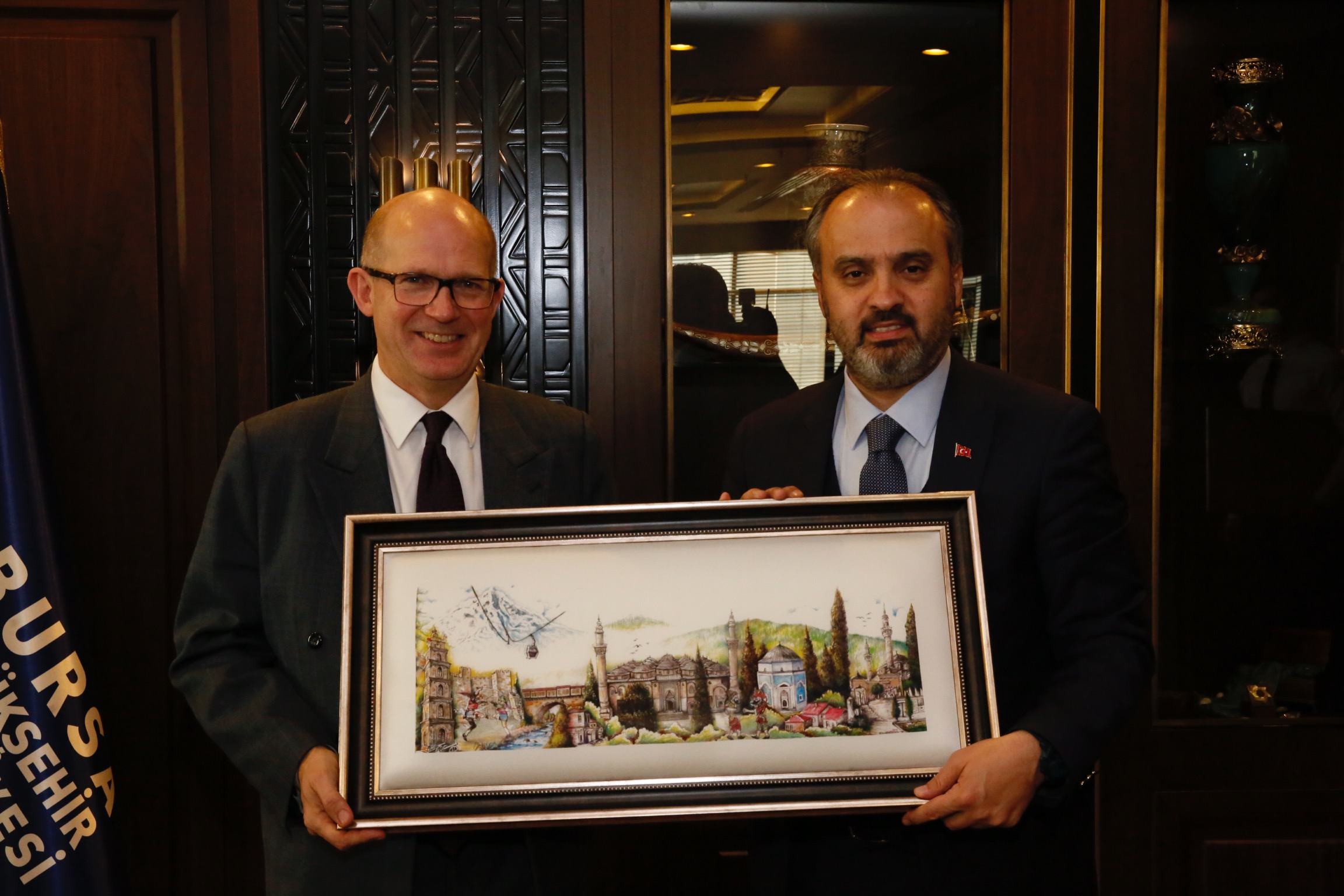 Başkan Aktaş, ziyaretin sonunda Büyükelçi Dominick Chilcott ve Ticaret Elçisi Lord Janvrin’e Bursa’ya özgü el yapımı ipek tablo hediye etti.