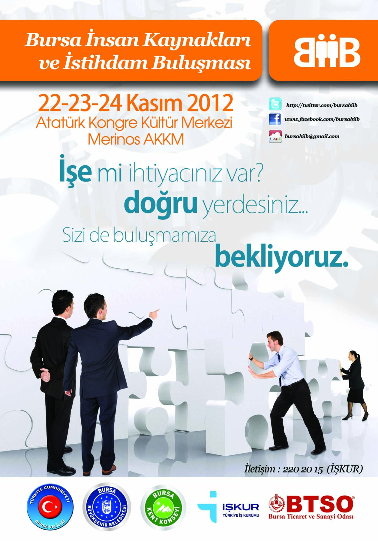 BURSA – Bursa Valiliği, Bursa Büyükşehir Belediyesi, Bursa Kent Konseyi, Türkiye İş Kurumu (İŞKUR) ve Bursa Ticaret ve Sanayi Odası’nın (BTSO) işbirliği ile düzenlenecek olan ‘Bursa İnsan Kaynakları ve İstihdam Buluşması (BİİB)’, 22-23-24 Kasım 2012 tarihlerinde işverenler ile iş arayanları bir araya getirecek.