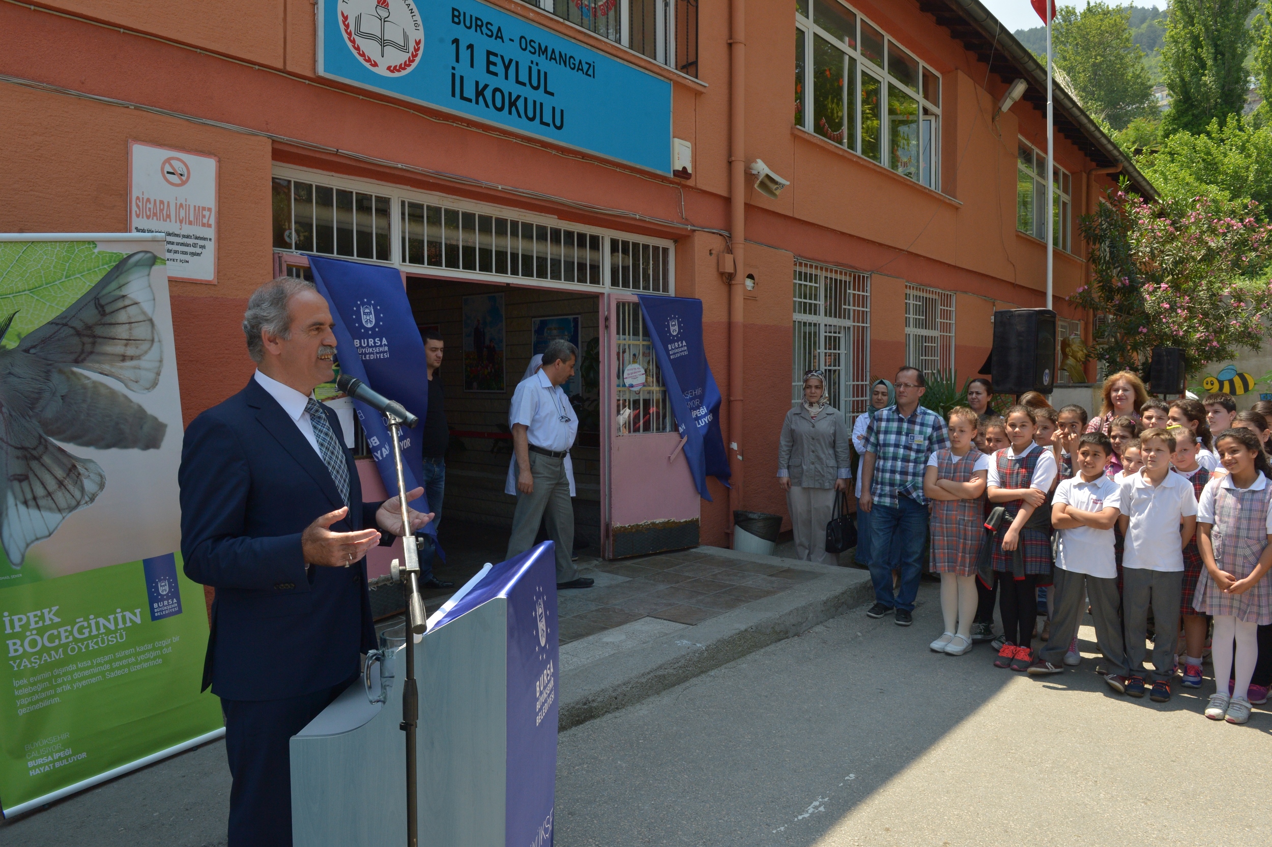 Bursa Büyükşehir Belediyesi Kültür ve Turizm Dairesi Başkanlığı tarafından ipekçiliğin ve ipekböceği evrelerinin çocuklara tanıtılması ve uygulamalı olarak öğretilmesi amacıyla gerçekleştirilen ‘Bursa İpeği Hayat Buluyor’ projesi, Muradiye’deki 11 Eylül İlkokulu’nda düzenlenen törenle başladı.