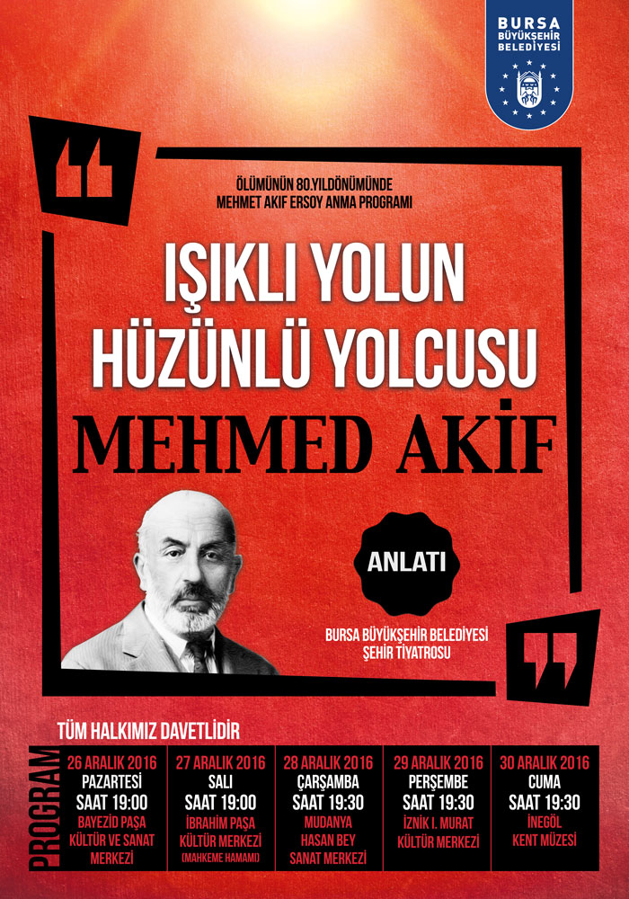 Mithat Cemal Kuntay’ın ‘Mehmed Akif; Hayatı- Seciyesi- Sanatı’ ve Hicran Göze ‘Mehmed Akif; Hüzünlü Bir Yolculuk’ adlı kitaplarından yola çıkılarak hazırlanan ‘Işıklı Yolun Hüzünlü Yolcusu; Mehmed Akif’ adlı anlatı 26 – 30 Aralık tarihleri arasında 5 ayrı mekânda sunulacak. Anlamlı program 26 Aralık Pazartesi günü saat 19.00’da Bayezıd Paşa Kültür ve Sanat Merkezi’nde, 27 Aralık Salı günü İbrahim Paşa Kültür Merkezi’nde (Mahkeme Hamamı), 28 Aralık Çarşamba günü Mudanya Hasan Bey Sanat Merkezi’nde, 29 Aralık Perşembe İznik I. Murat Kültür Merkezi’nde ve 30 Aralık Cuma günü de İnegöl Kent Müzesi’nde gerçekleştirilecektir.