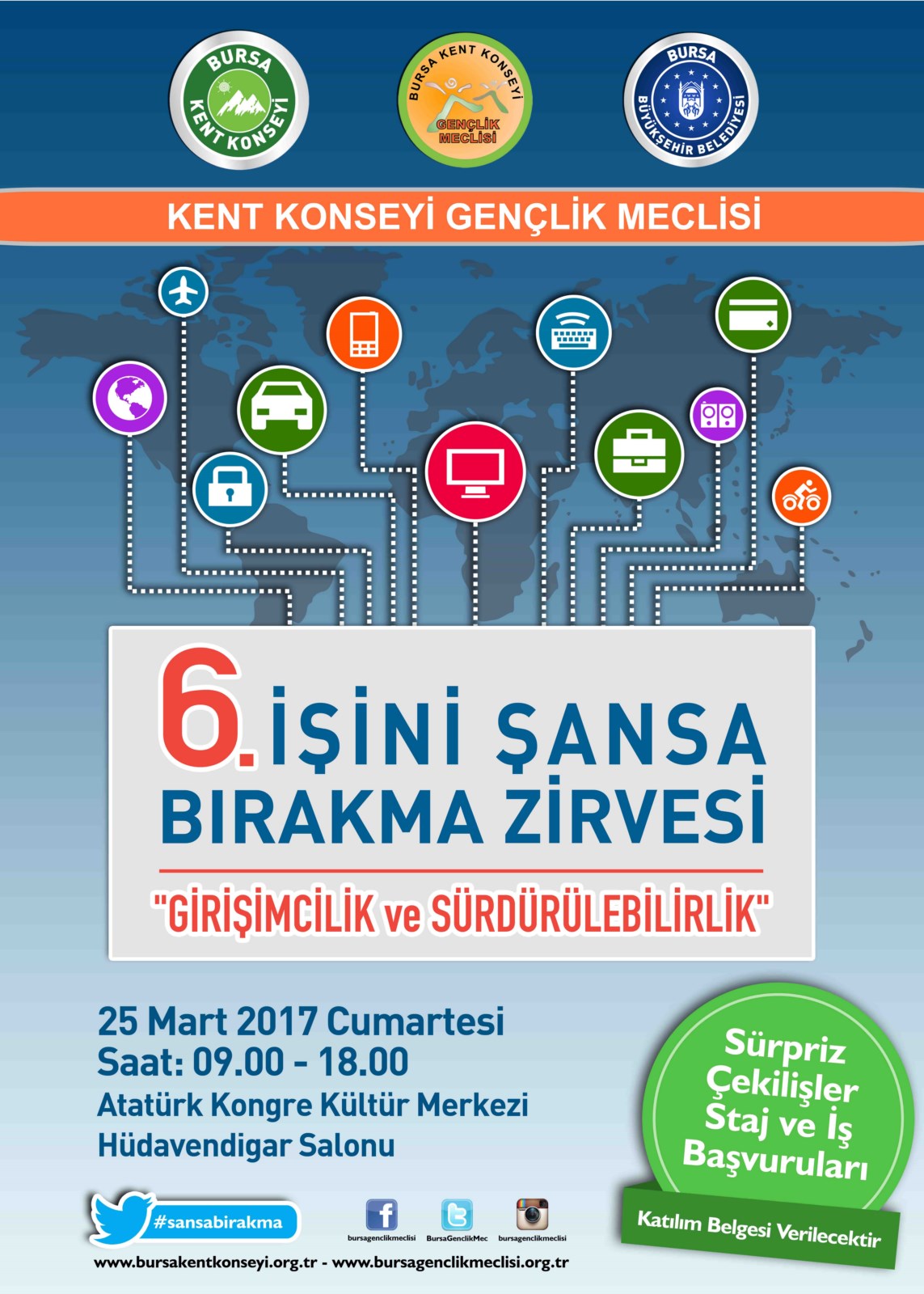 -Bursa Kent Konseyi Gençlik Meclisi tarafından ´Girişimcilik Ve Sürdürülebilirlik´ temasıyla bu yıl 6.´sı düzenlenen ‘İşini Şansa Bırakma Zirvesi´ 25 Mart 2017 Cumartesi günü gerçekleştirilecek.