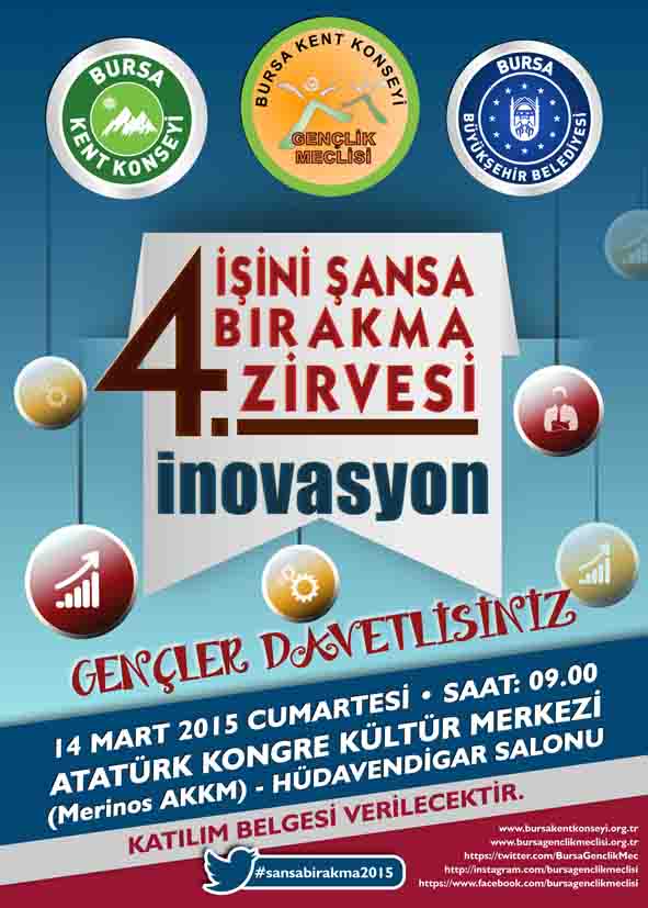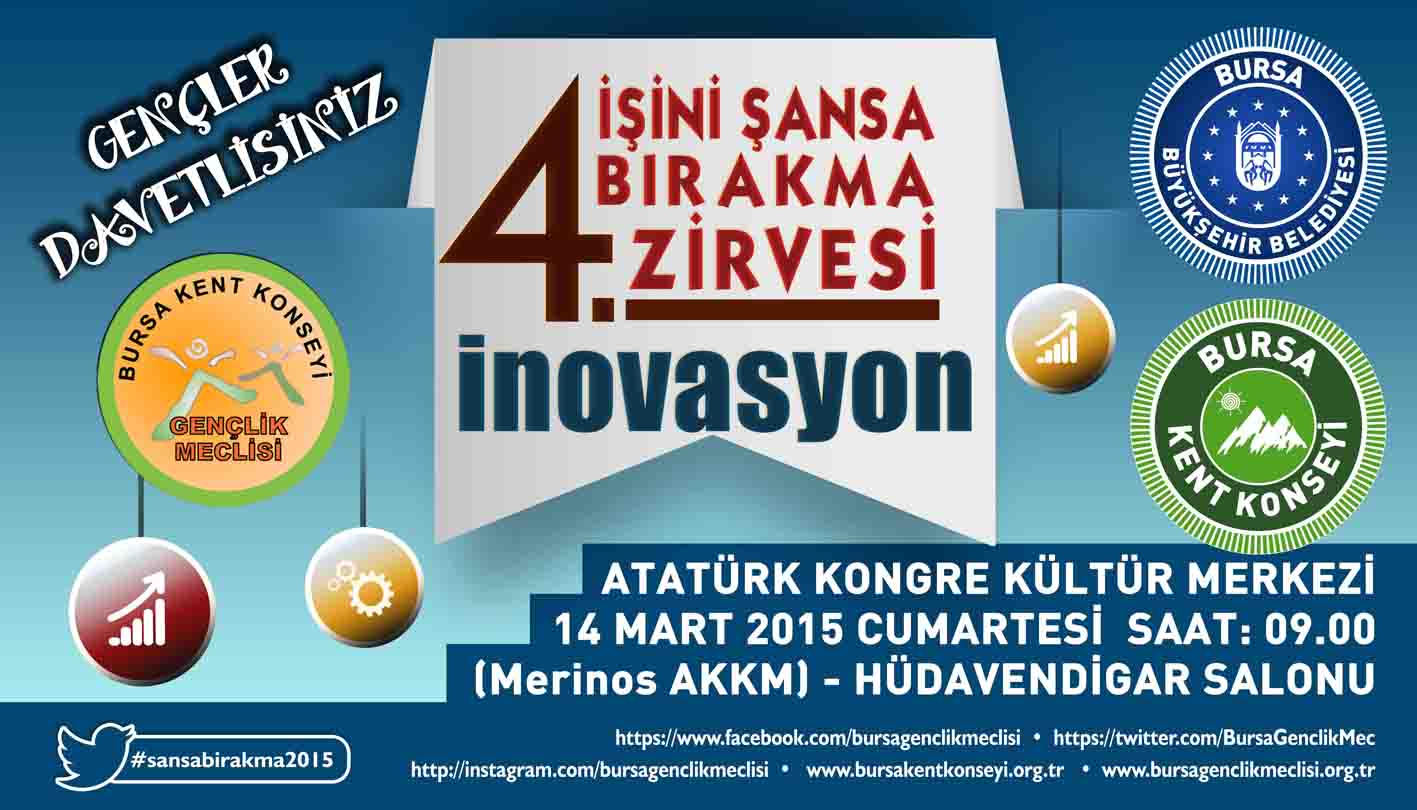 Bursa Kent Konseyi (BKK) Gençlik Meclisi İstihdam ve Kariyer Çalışma Grubu tarafından bu yıl dördüncüsü yapılacak olan ‘İşini Şansa Bırakma Zirvesi’, ‘İnovasyon’ temasıyla 1 Mart 2014 Cumartesi günü saat 09.00’da düzenlenecek. Atatürk Kongre Kültür Merkezi (Merinos AKKM) Hüdavendigar Salonu’ndaki zirvede, konusunda uzman isimler gençlere gün boyunca bilgi ve birikimlerini aktaracak.