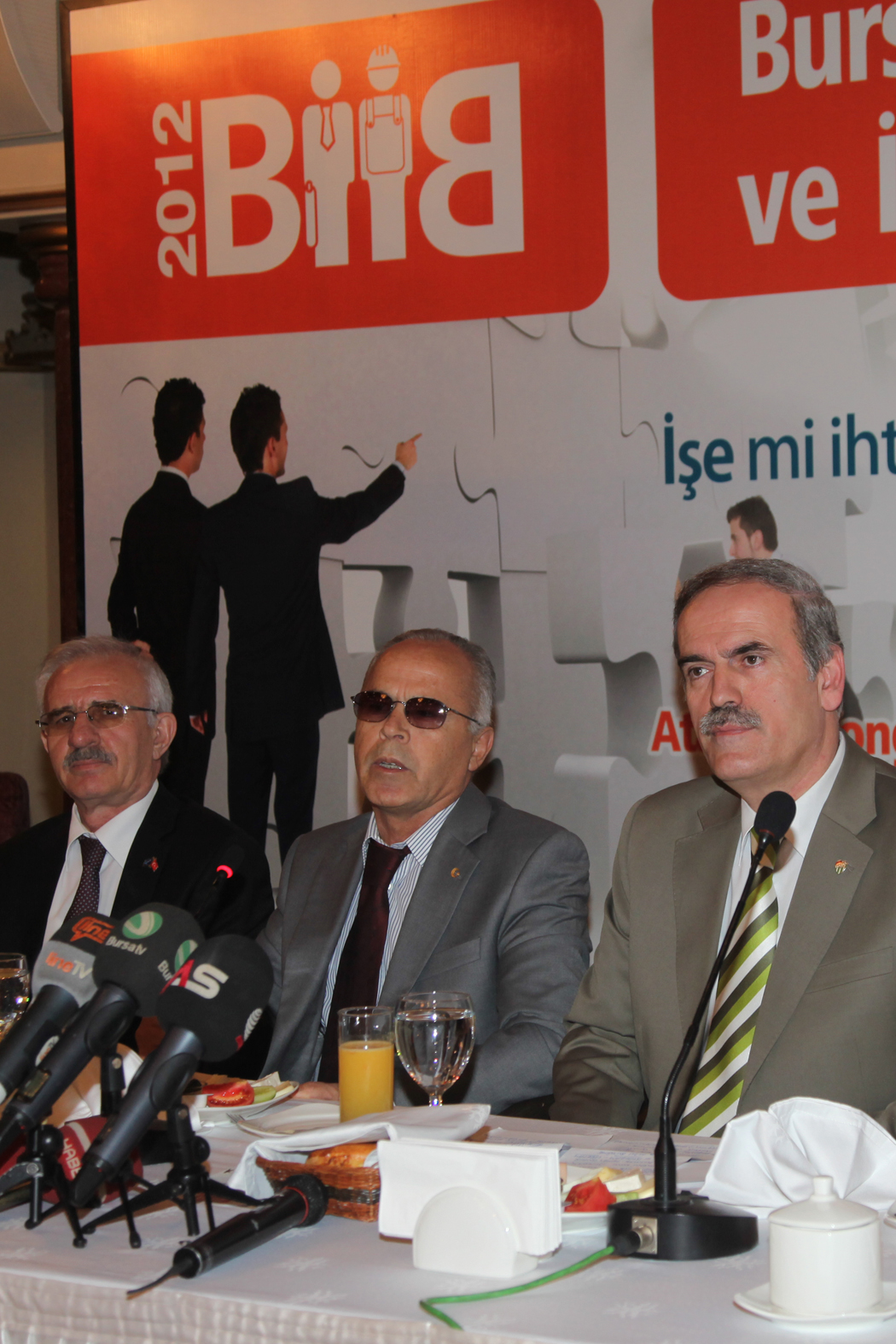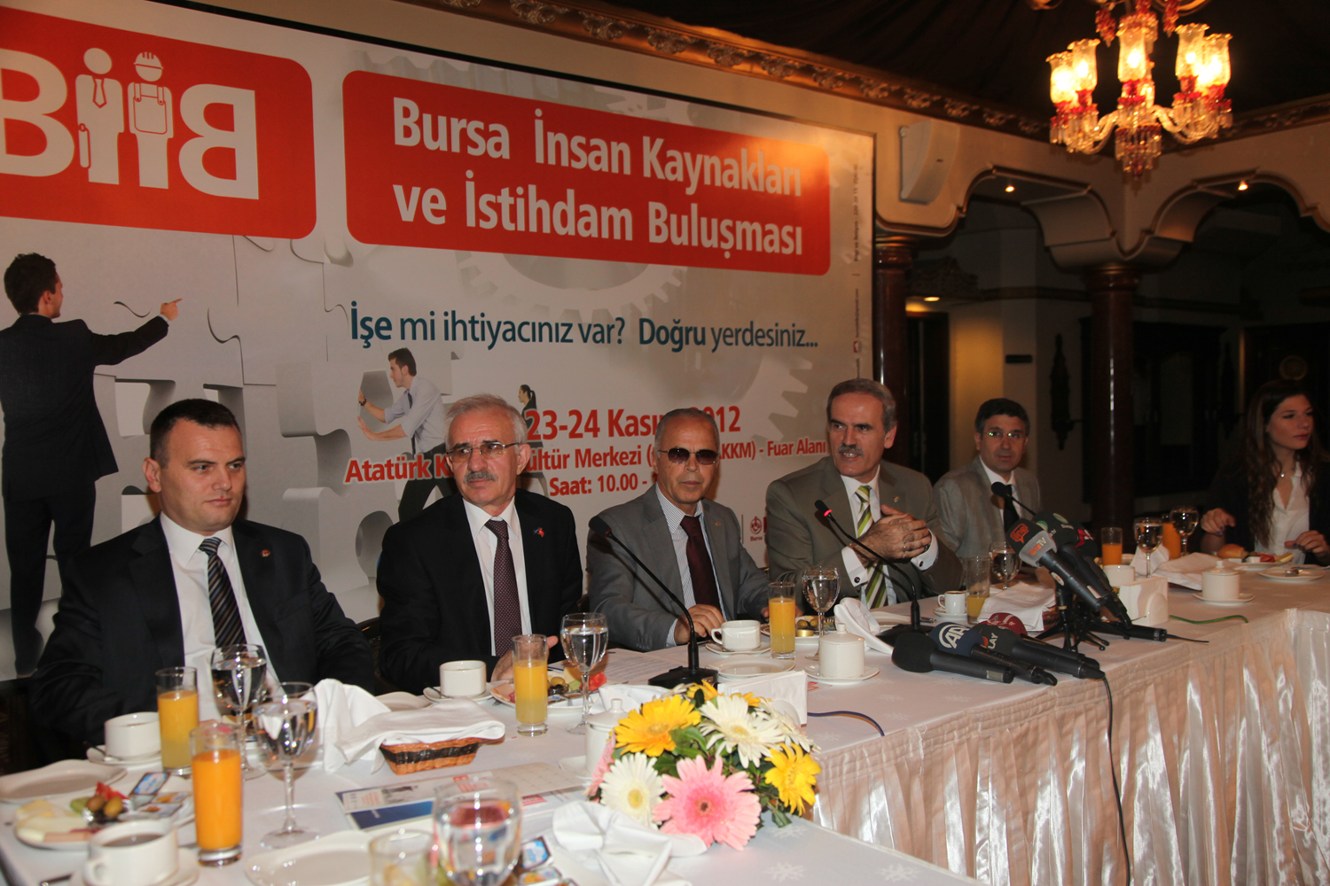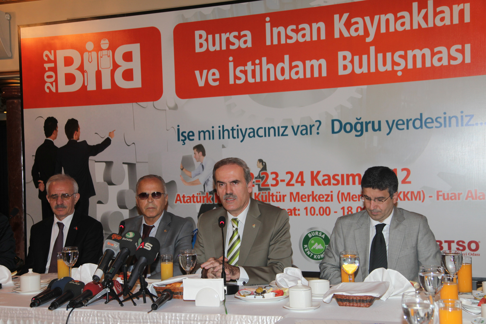 Bursa Valiliği, Büyükşehir Belediyesi, Kent Konseyi, Ticaret ve Sanayi Odası ve İŞ-KUR İl Müdürlüğü tarafından organize edilen Bursa İnsan Kaynakları ve İstihdam Buluşması´nın (BİİB´12) tanıtım toplantısı, Almira Otel´de yapıldı. Büyükşehir Belediye Başkanı Recep Altepe, Vali Yardımcısı Hüseyin Eren, Kent Konseyi Genel Sekreteri Enes Battal Keskin ve İŞ-KUR İl Müdürü Kasım Tilki´nin de katıldığı tanıtım toplantısında, 3 gün boyunca devam edecek olan ve özel sektörle iş arayanları buluşturacak organizasyonla ilgili basın mensuplarına bilgiler verildi.