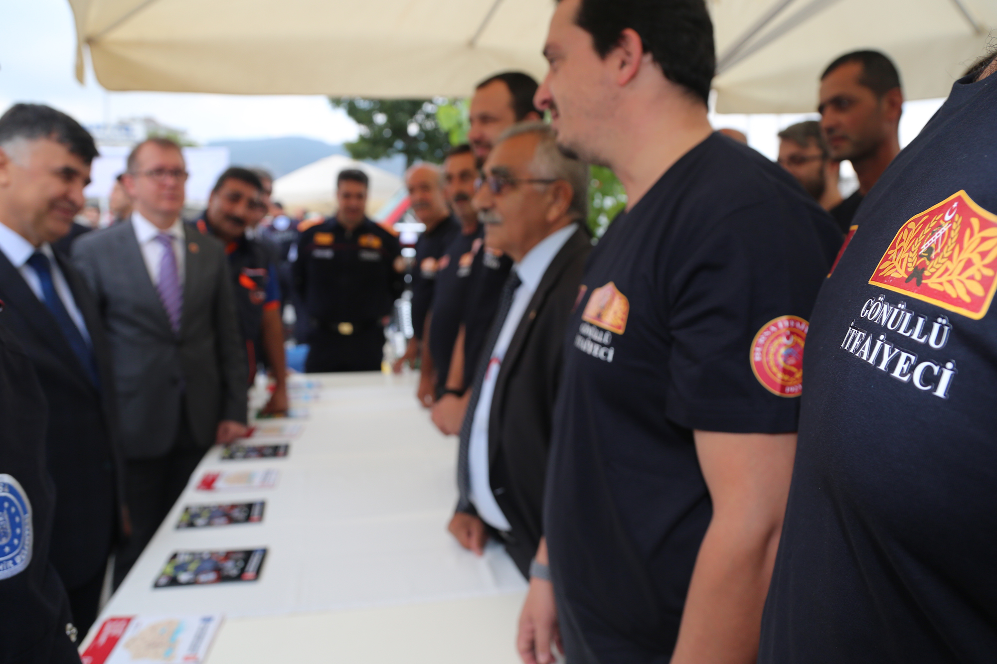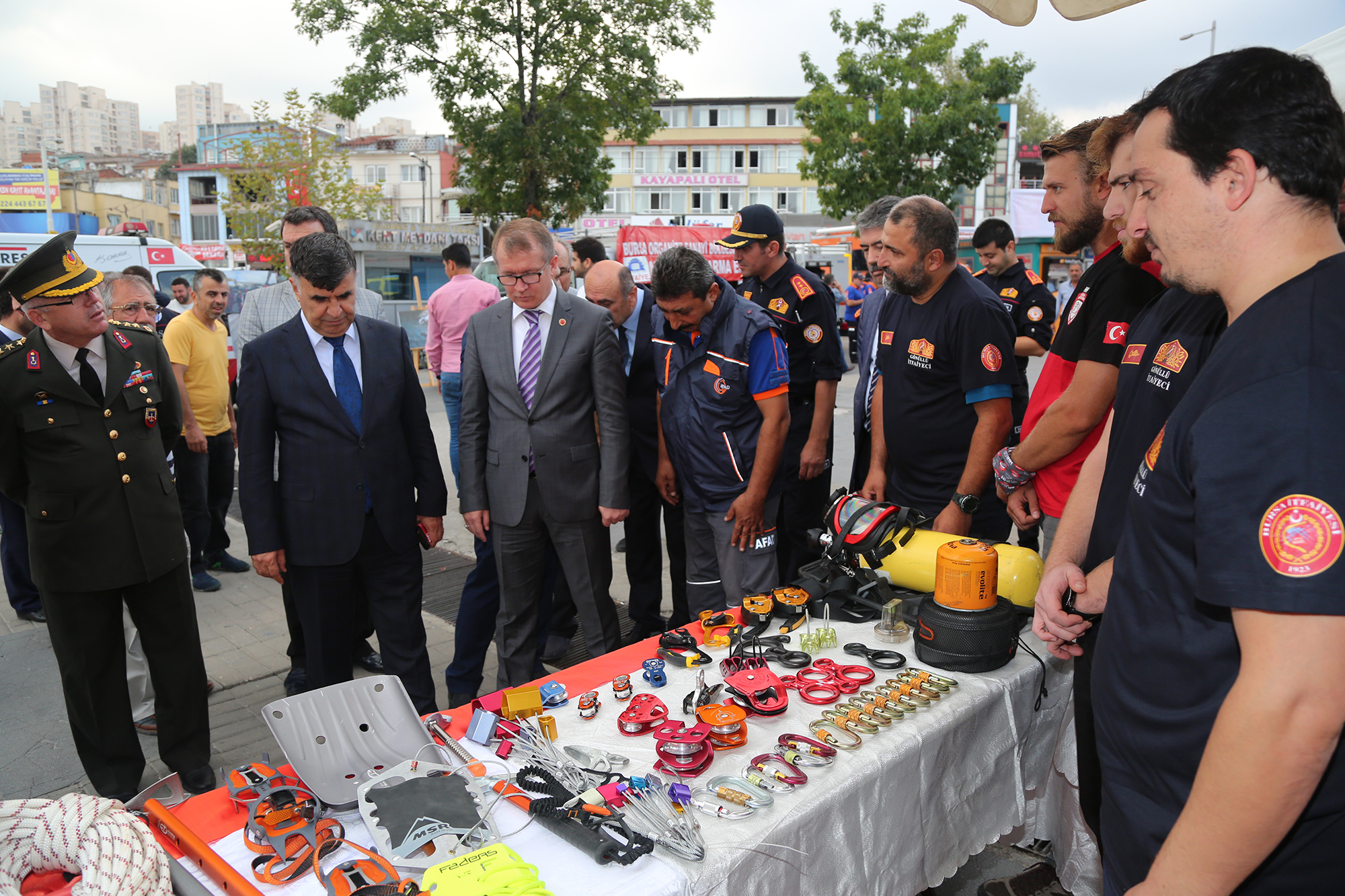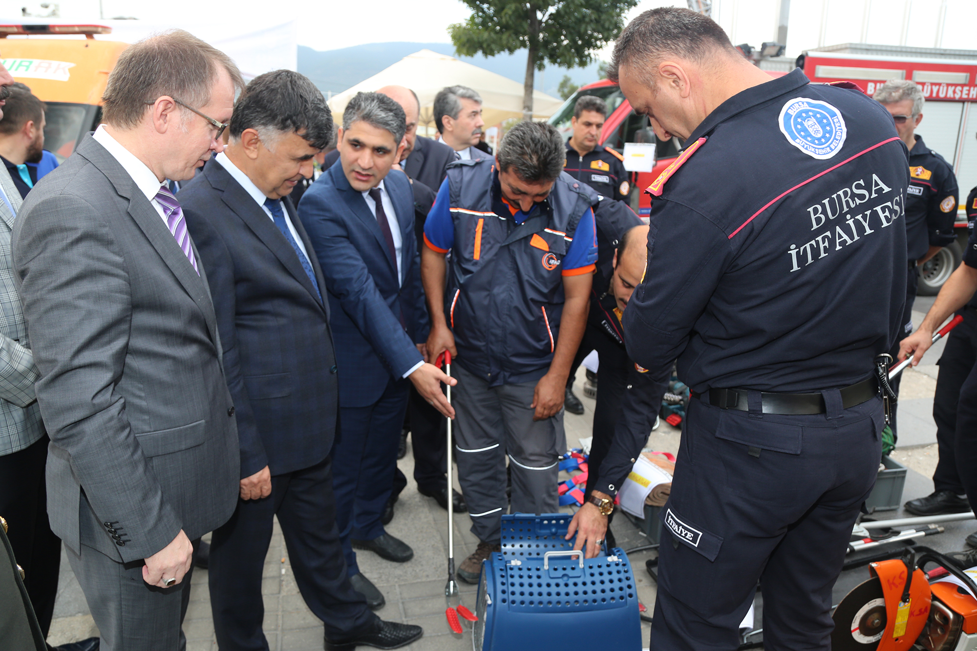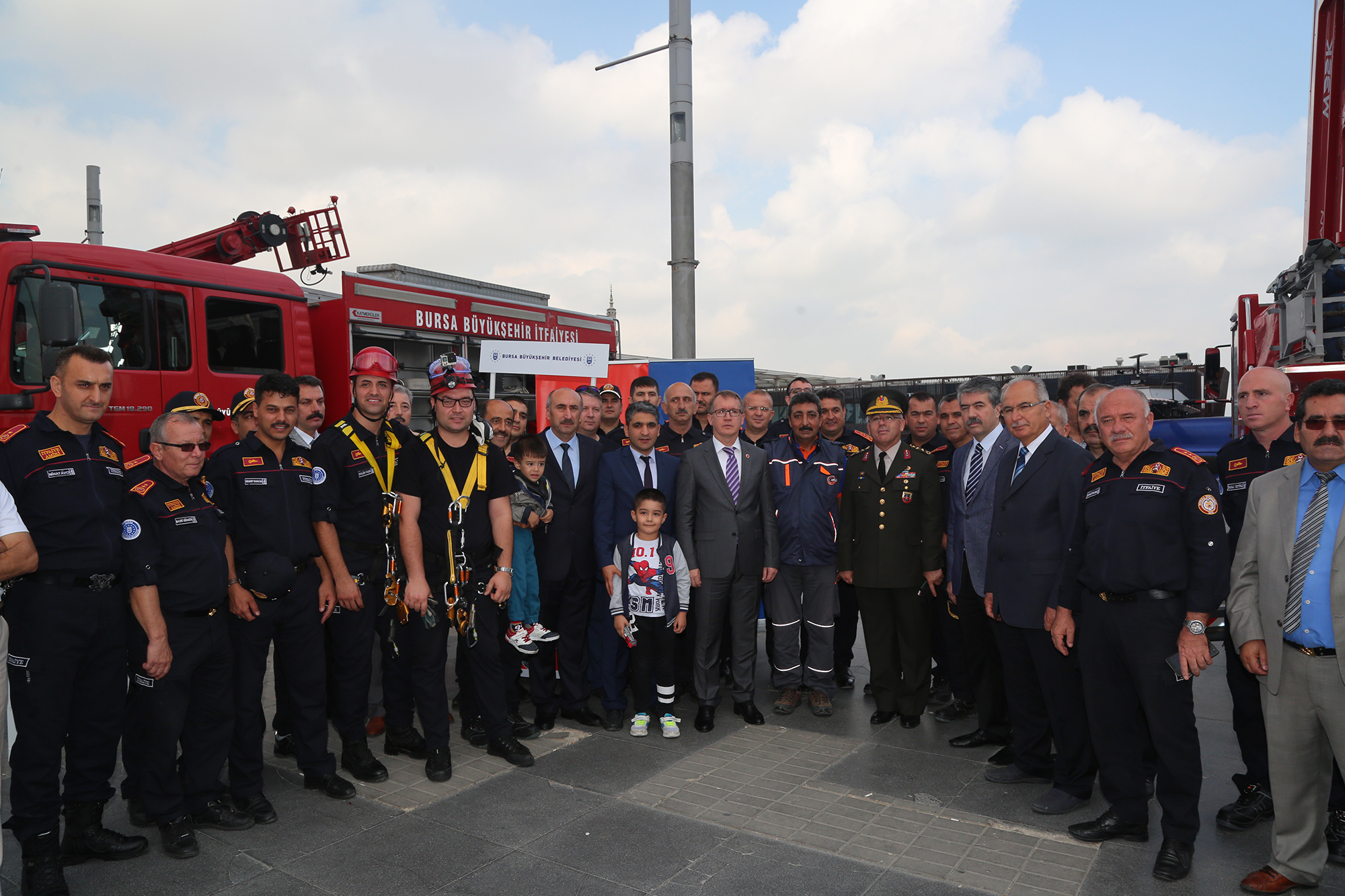 İtfaiye Haftası kutlamaları kapsamında Kent Meydanı’nda Büyükşehir Belediyesi İtfaiye Daire Başkanlığı, AFAD, AKUT, Bursagaz, BUSKİ, Türkiye Radyo Amatörleri Cemiyeti stant açarak, yangın ve doğal afetlerde kullanılan ekipmanları tanıttı. Vatandaşların da yoğun ilgi gösterdiği sergide Büyükşehir Belediyesi itfaiye ekipleri, nefes kesen bir gösteri yaptı. Yaklaşık 20 metre yüksekliğe kaldırılan itfaiye sepetindeki 2 itfaiye eri, dağcılar gibi halatlarla aşağıya indi. Aşağıya inen dağcıların havada Türk Bayrağı açması vatandaşlardan bol bol alkış aldı.