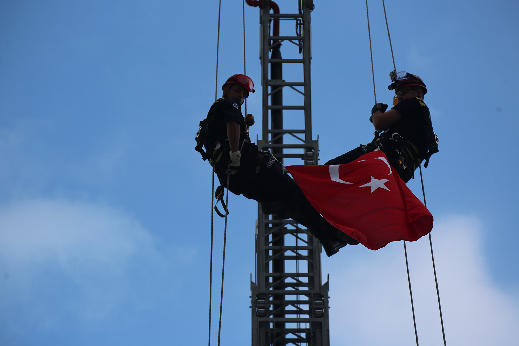 BURSA - İtfaiye Teşkilatı’nın kuruluşunun 303.yılı kutlama programı kapsamında Bursa Kent Meydanı’nda düzenlenen sergide, itfaiyeciler 20 metre yükseklikteki itfaiye merdiveninden halatlarla Türk Bayrağı açarak indi.