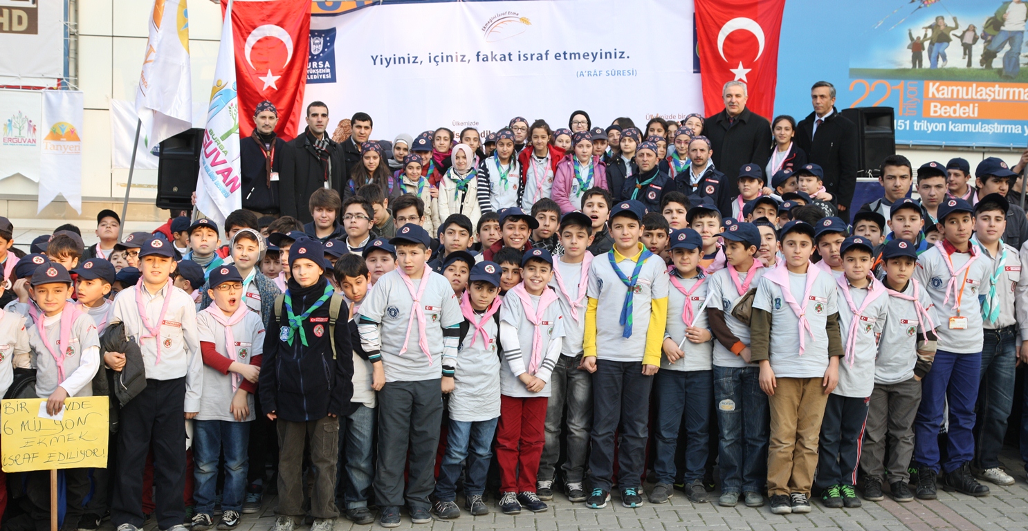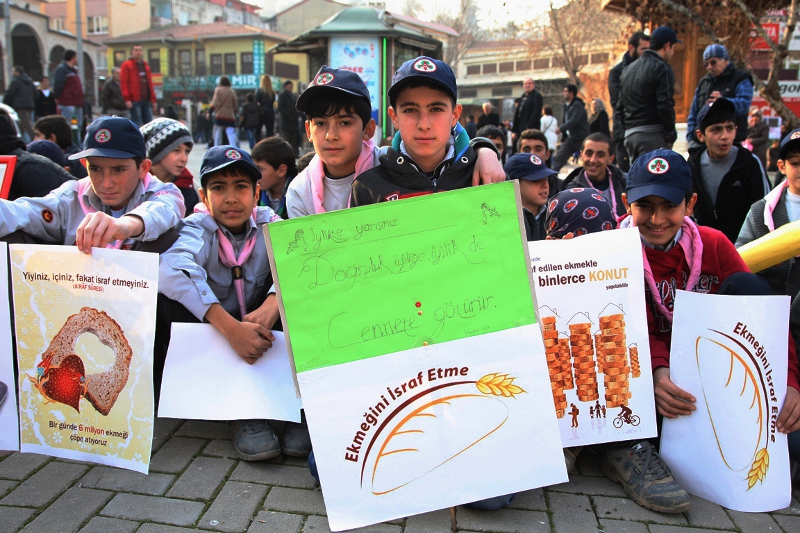 Büyükşehir Belediyespor Kulübü Başkan Yardımcısı İlhan Satık’ın da katıldığı programda, izciler ekmek israfının öneminin yazılı olduğu pankartlarla Bursalıları uyardı. İzci Lideri Mustafa Altay, Gıda, Tarım ve Hayvancılık Bakanlığı’nın konuyla ilgili yaptığı bildiriyi okuyarak, yurt çapında yaptırılan bir araştırmada Türkiye’de günde 6 milyon, yılda 2,1 milyar ekmeğin israf edildiği sonucunun ortaya çıktığını, söz konusu ekmek israfının da bugünkü parasal karşılığının 1,5 milyar TL olduğunu belirtti. Bu nedenle ‘Ekmek İsrafını Önleme Kampanyası’nın başlatıldığını kaydeden Altay, kampanya ile israf konusunda toplumsal duyarlılık oluşturulması, israfın üretim ve tüketim aşamalarında önlenmesi, ekmeğin uygun yöntemlerle muhafazasının sağlanması, bayat veya ihtiyaç fazlası ekmeğin yine insan gıdası olarak değerlendirilmesi konularının daha çok anlatılması ve tam buğday ekmeği tüketiminin yaygınlaştırılmasının amaçlandığını vurguladı.