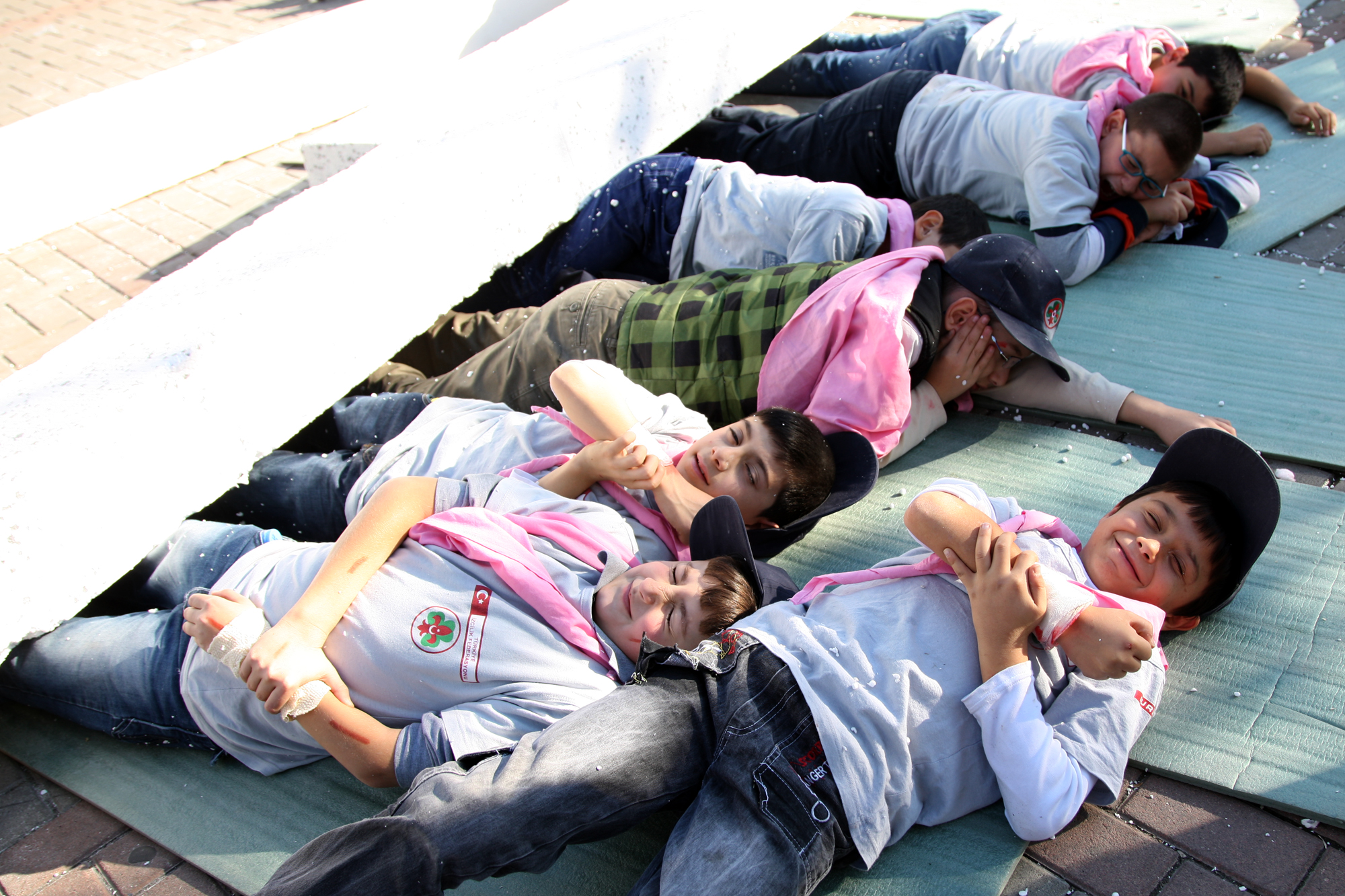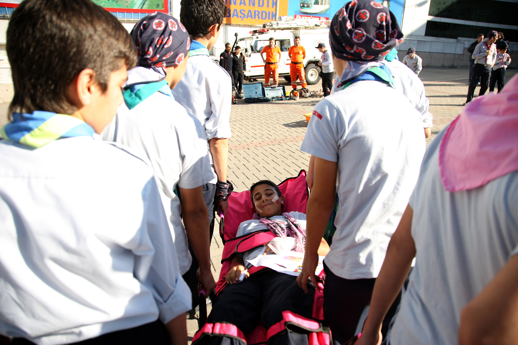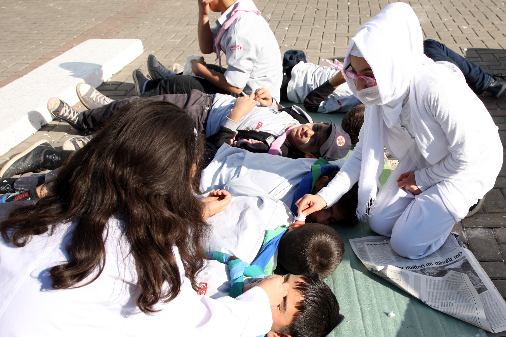 kurtarma görevlisi olarak vatandaşlara deprem sırasında yapılması gerekenleri gösterdi. Meydana kurulan çadırlarda temsili olarak deprem sırasında yaşananları aktaran izciler, vatandaşları da gösteriye dahil ederek, izleyicileri bilinçlendirdi.