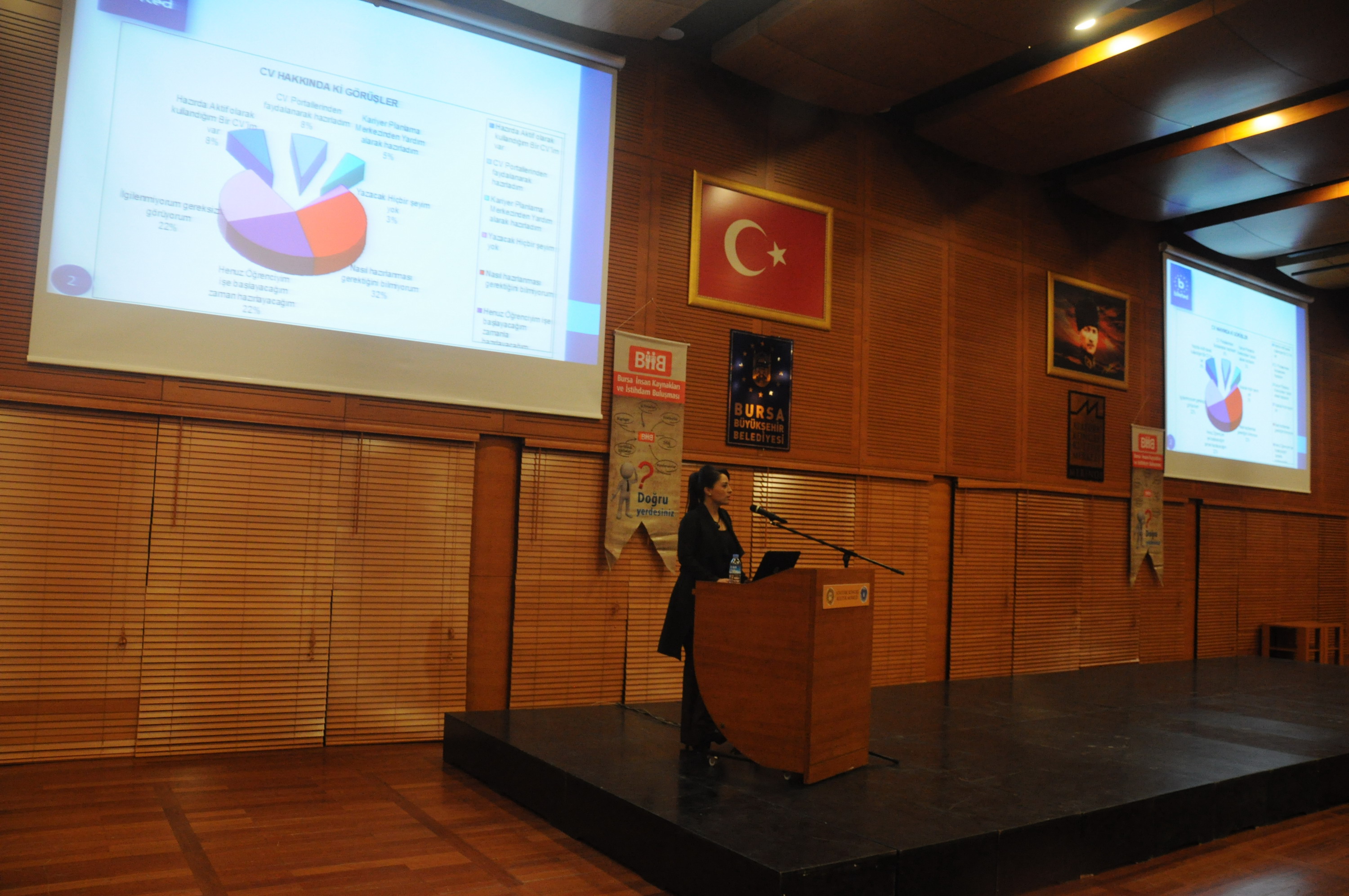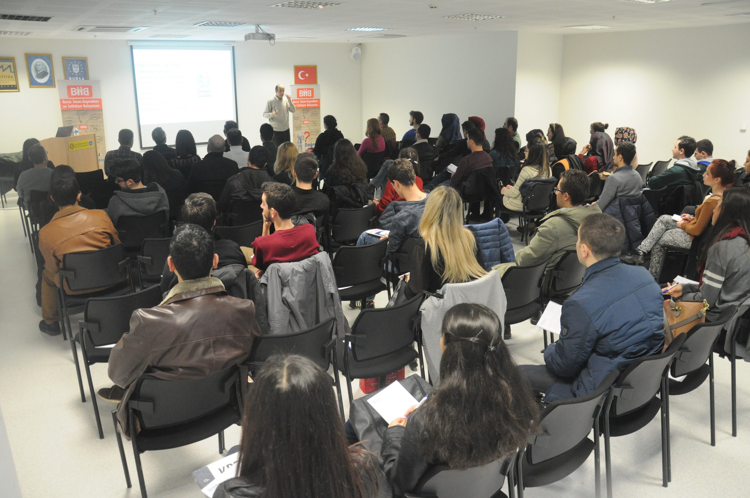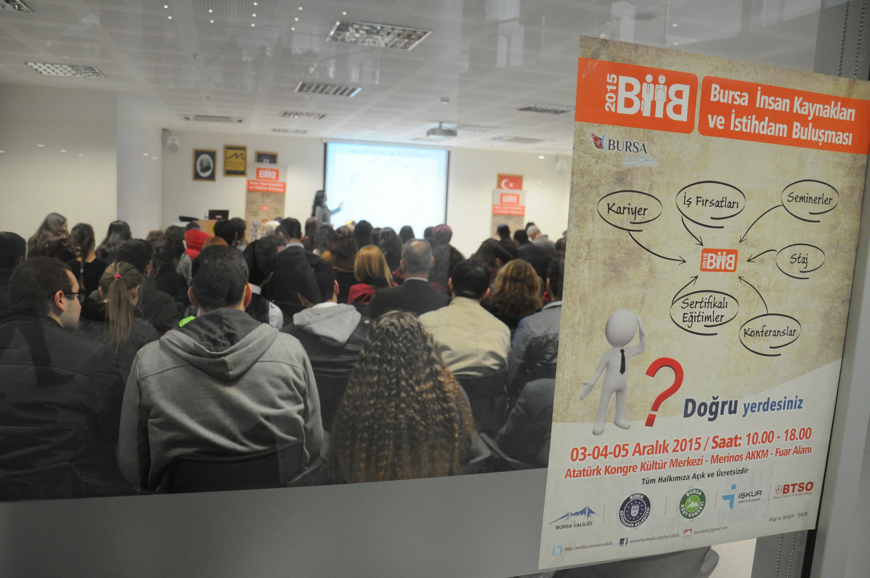 Bursa Büyükşehir Belediyesi, Bursa Valiliği, Bursa Kent Konseyi, Bursa Çalışma ve İş Kurumu (İş-Kur Bursa) ve Bursa Ticaret ve Sanayi Odası (BTSO) ortaklığında yapılan BİİB’2015, bir yandan Fuar Alanı’nda firma temsilcileriyle iş arayanların buluşması, bir yandan seminer, konferans ve sertifikalı eğitimleriyle sürüyor. Atatürk Kongre Kültür Merkezi’nin (Merinos AKKM) tüm salonlarının kullanıldığı buluşma kapsamında Kişisel Gelişim Uzmanı Ahmet Şerif İzgören de Bursalılarla buluştu. Osmangazi Salonu’nu dolduran yaklaşık 1500 kişi, İzgören’in ‘Bir Hikayeniz Olacak Mı?’ konulu konuşmasını dikkatle dinledi. Gösterilen ilgiden ötürü Bursalılara teşekkür eden Şerif İzgören, yaklaşık bir buçuk saat süren konferansta toplumun gizli kahramanlarını ve sessiz sedasız topluma kattıkları değerleri anlattı. Programın sonunda İzgören, sevenleriyle bir araya geldi.