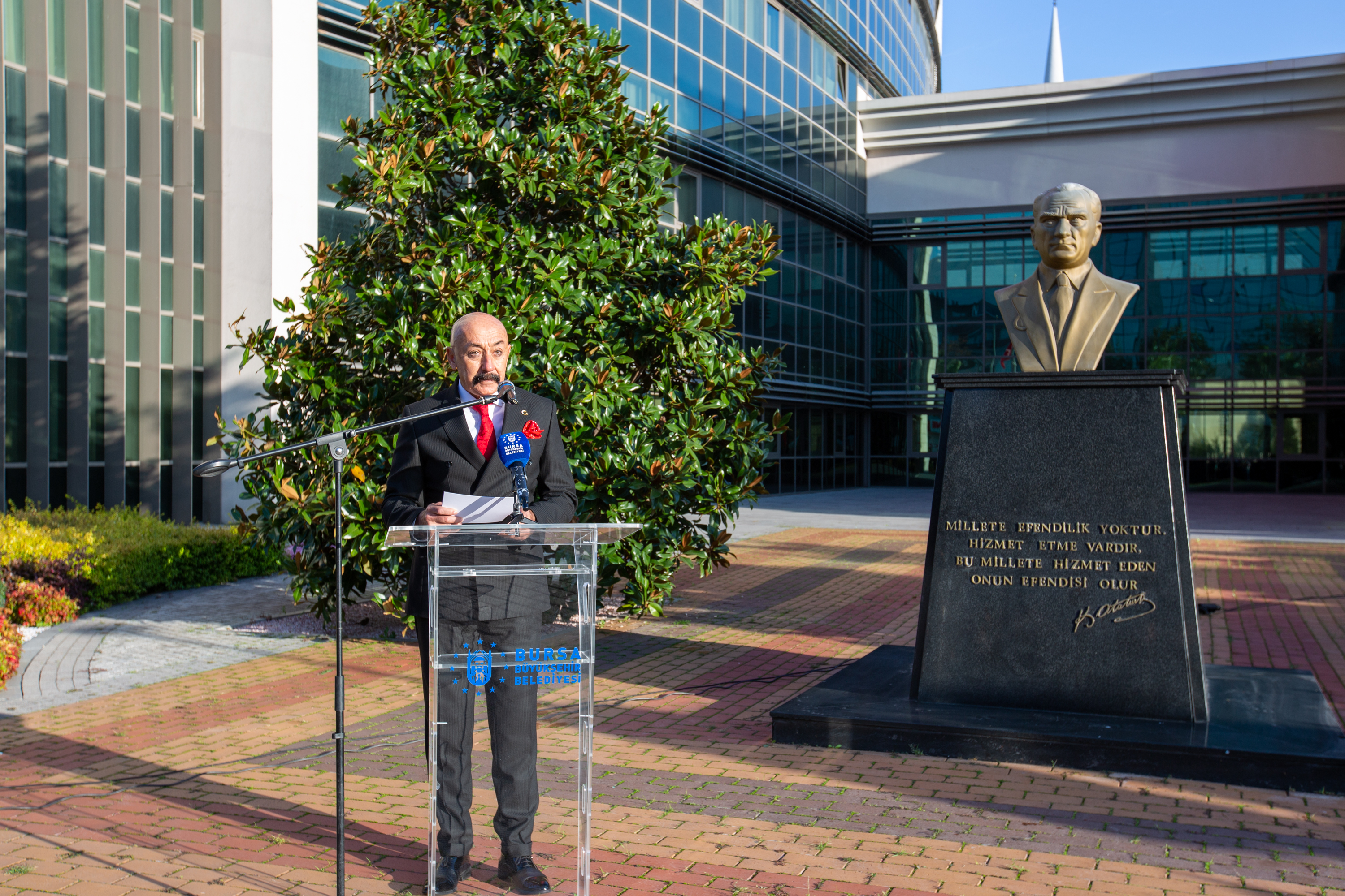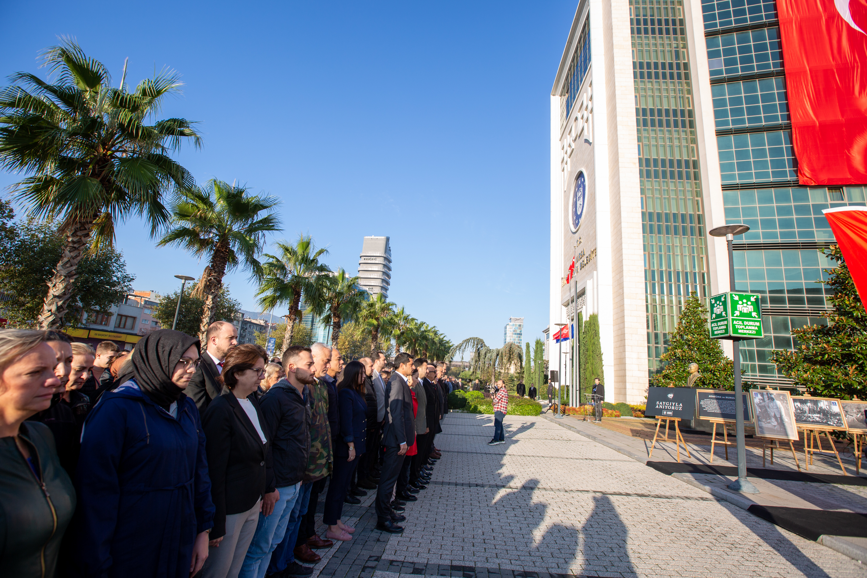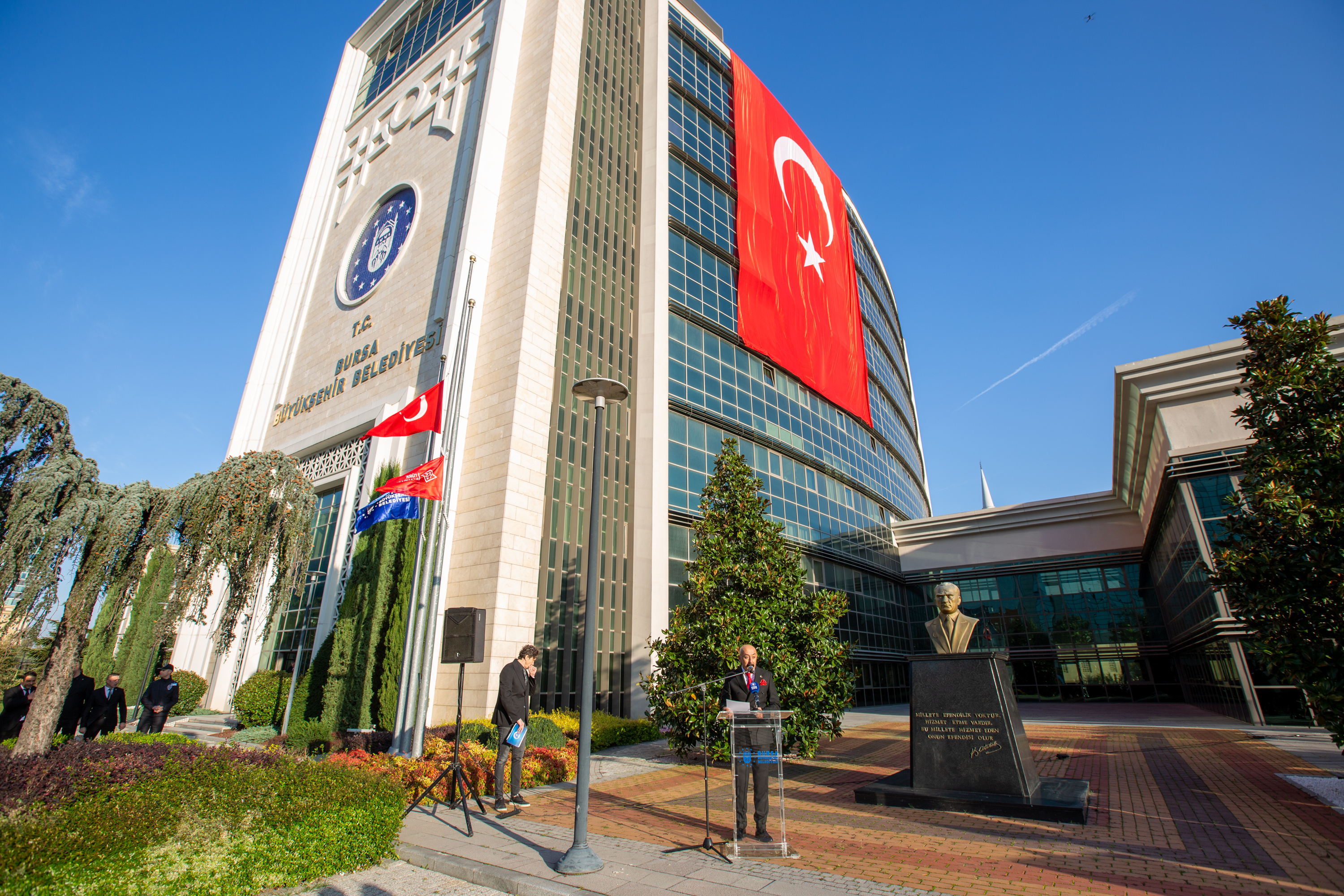 Bursa Büyükşehir Belediyesi personeli de anma töreni için belediye binası önündeki tören alanında toplandı. Saat 09.05’te sirenlerin çalmasıyla başlayan anma töreninde Türk Bayrağı yarıya indirildi, tüm personel hep bir ağızdan İstiklal Marşı’nı okudu. Büyükşehir Belediyesi Başkanvekili Fethi Yıldız, yaptığı konuşmada Gazi Mustafa Kemal Atatürk’ü rahmet ve minnetle andı. Büyükşehir personeli, buradaki törenin ardından Atatürk’ün Bursa ziyaretlerinde çekilmiş fotoğraflarının yer aldığı sergiyi de ilgiyle gezdi.