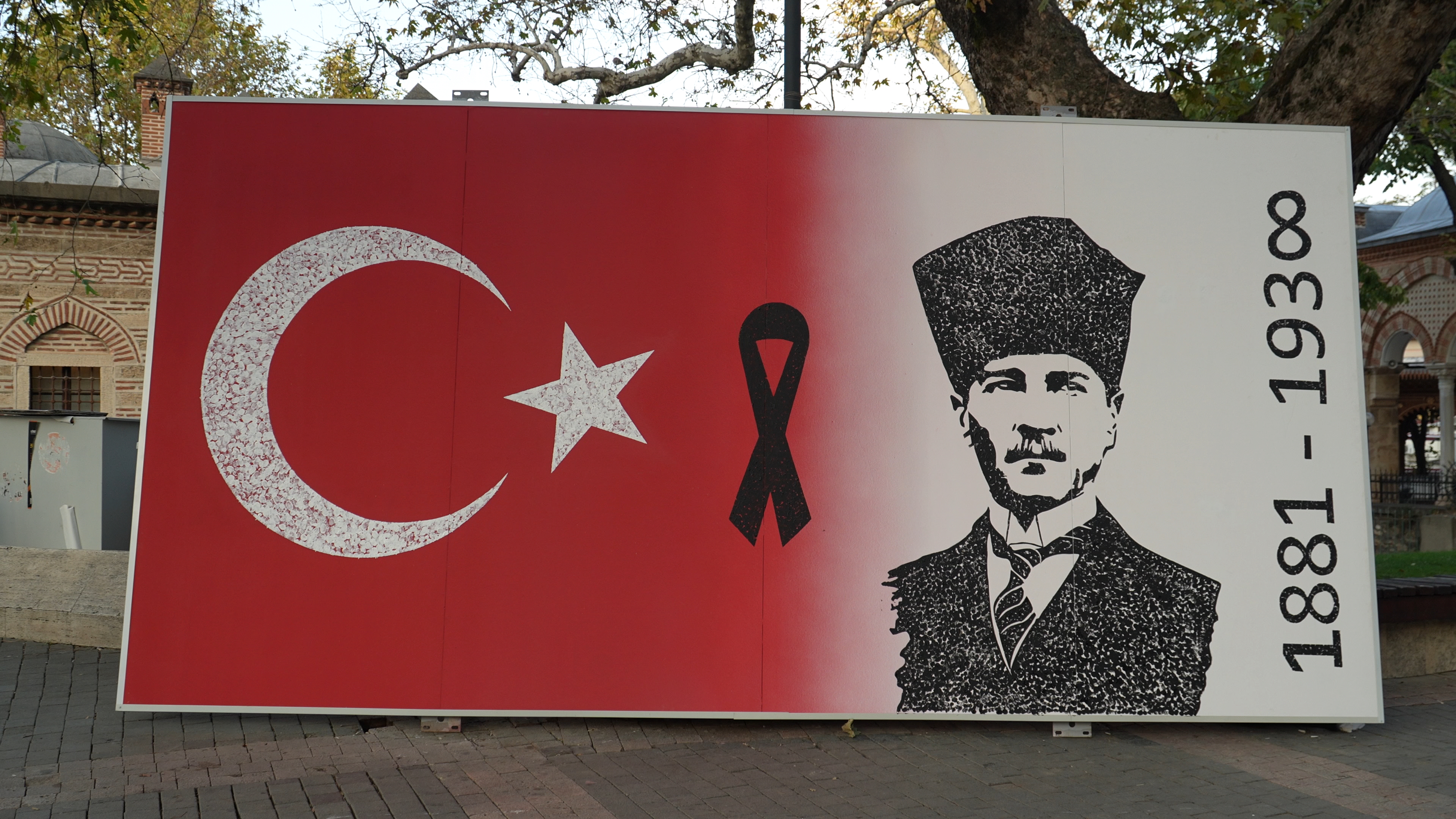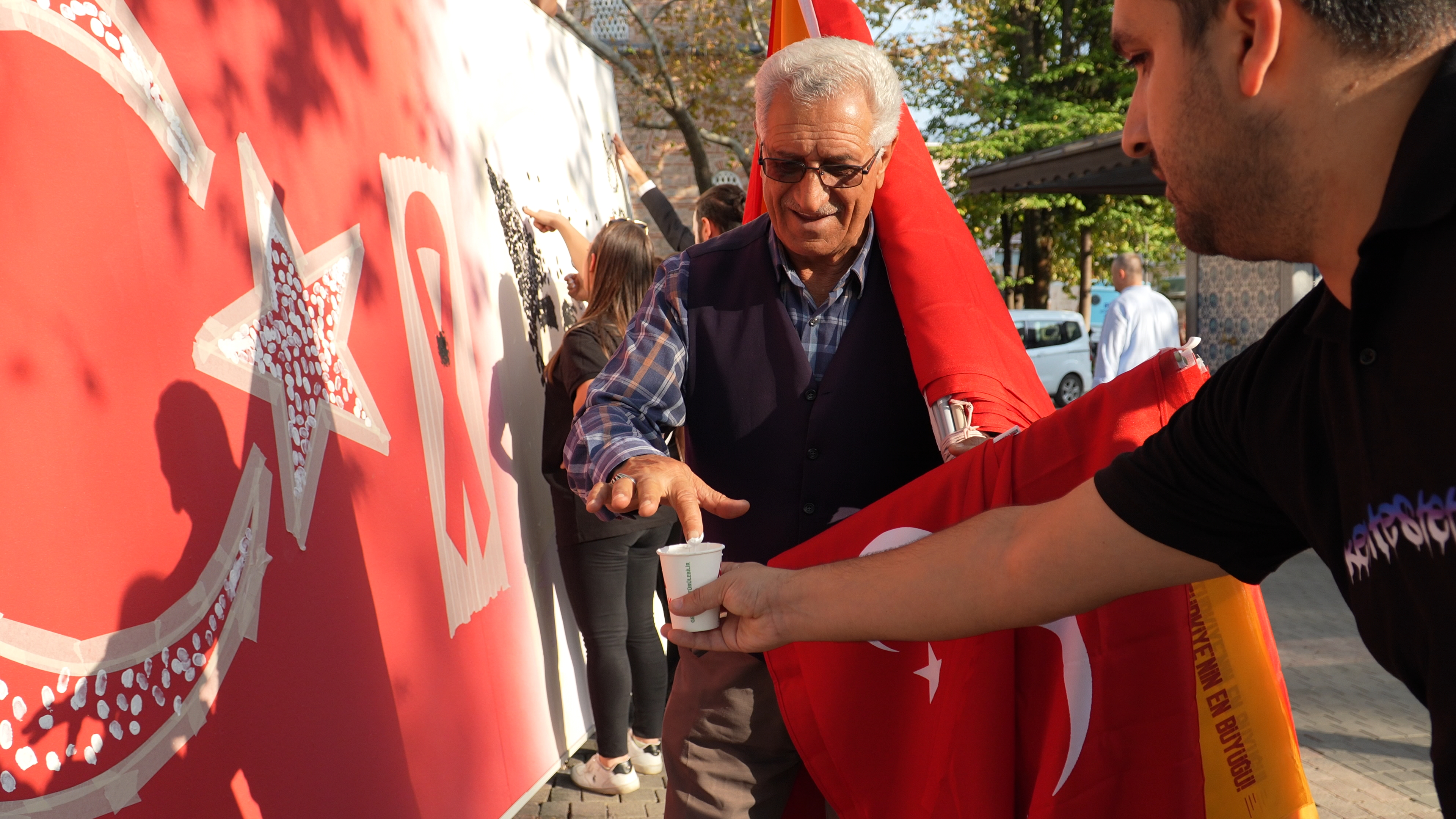 Bursa’nın cadde ve sokaklarını bir tuval gibi kullanıp, kente estetik bir değer kazandıran Büyükşehir Belediyesi Kent Estetiği Şube Müdürlüğü de anlamlı bir etkinliğe imza attı. “İzlerimiz farklı, hislerimiz aynı” temasıyla düzenlenen etkinlikle Büyükşehir Belediyesi’nin ressamları, dev bir pano üzerine Türk Bayrağı ve Atatürk silueti çalıştı. Bayrak ve siluetin oluşacağı alanlar bantlarla belirlenirken, dev pano Orhangazi Parkı’na getirilerek, projeye 7’den 70’e tüm Bursalılar dâhil edildi. Vatandaşlar, bardaktaki siyah ve beyaz boyalara parmaklarını batırıp, parmak izleriyle esere katkı sağladı. Vatandaşların büyük ilgi gösterdiği etkinlikte, üzerinde Türk Bayrağı ve Atatürk Silueti bulunan dev pano 1 saat gibi kısa bir zamanda tamamlandı.