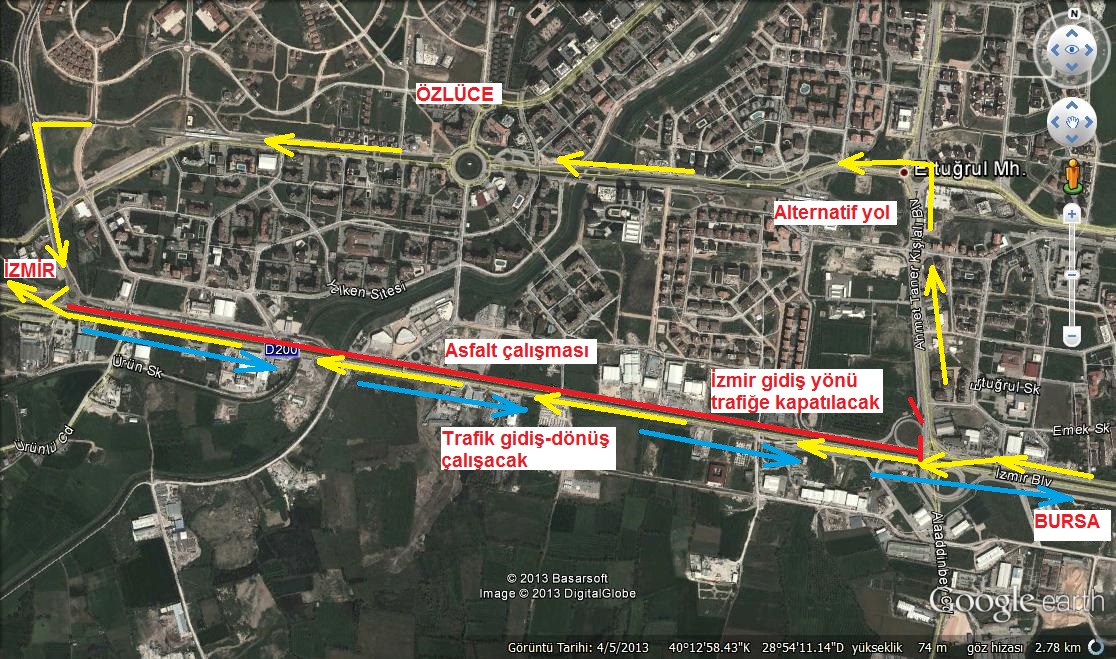 Bursa-İzmir Karayolu Küçük Sanayi Gül Kavşağı ile Alaaddinbey-Özlüce Kavşağı gidiş istikameti asfaltlama çalışmalarının tamamlanmasının ardından aynı güzergahta Alaaddinbey-Özlüce Kavşağı ile Uludağ Üniversitesi Kavşağı arasındaki asfaltlama çalışmalarına 22 Mayıs Çarşamba (YARIN) günü başlanıyor. Çalışmalar kapsamında Alaaddinbey-Özlüce kavşağından itibaren İzmir yolu gidiş güzergahı trafiğe kapatılacak. Çalışmalar süresince Görükle - İzmir gidiş istikametinde trafik karşı şeritten (İzmir geliş yönünden) iki yönlü olarak sağlanacak. Alternatif güzergah olarak, Alaaddinbey-Özlüce kavşağından Özlüce içine yönlendirme yapılarak Ahmet Taner Kışlalı Bulvarı ve Uğur Mumcu Bulvarı güzergahından Uludağ Üniversitesi kavşağına ulaşım sağlanacak. Çalışmalar süresince alternatif yol güzergahlarında (Uğur Mumcu Bulvarı ve Ahmet Taner Kışlalı) yer alan trafik ışıklarının, kontrollü geçişe imkan verecek şekilde ikaz (flaş) konumuna alınması kararlaştırıldı.