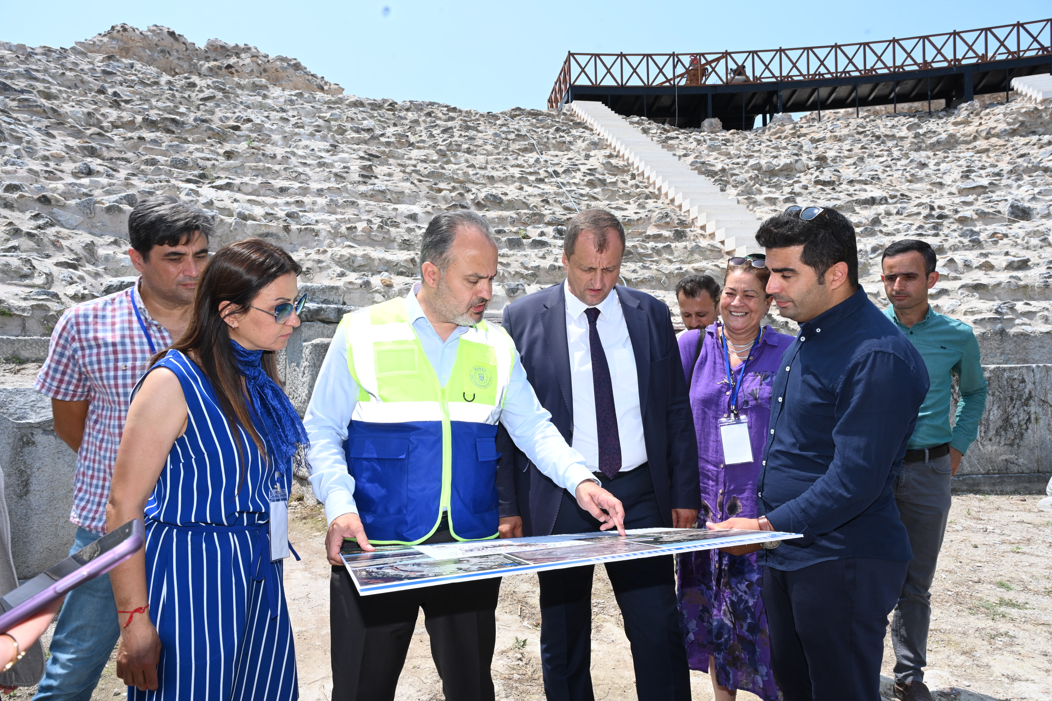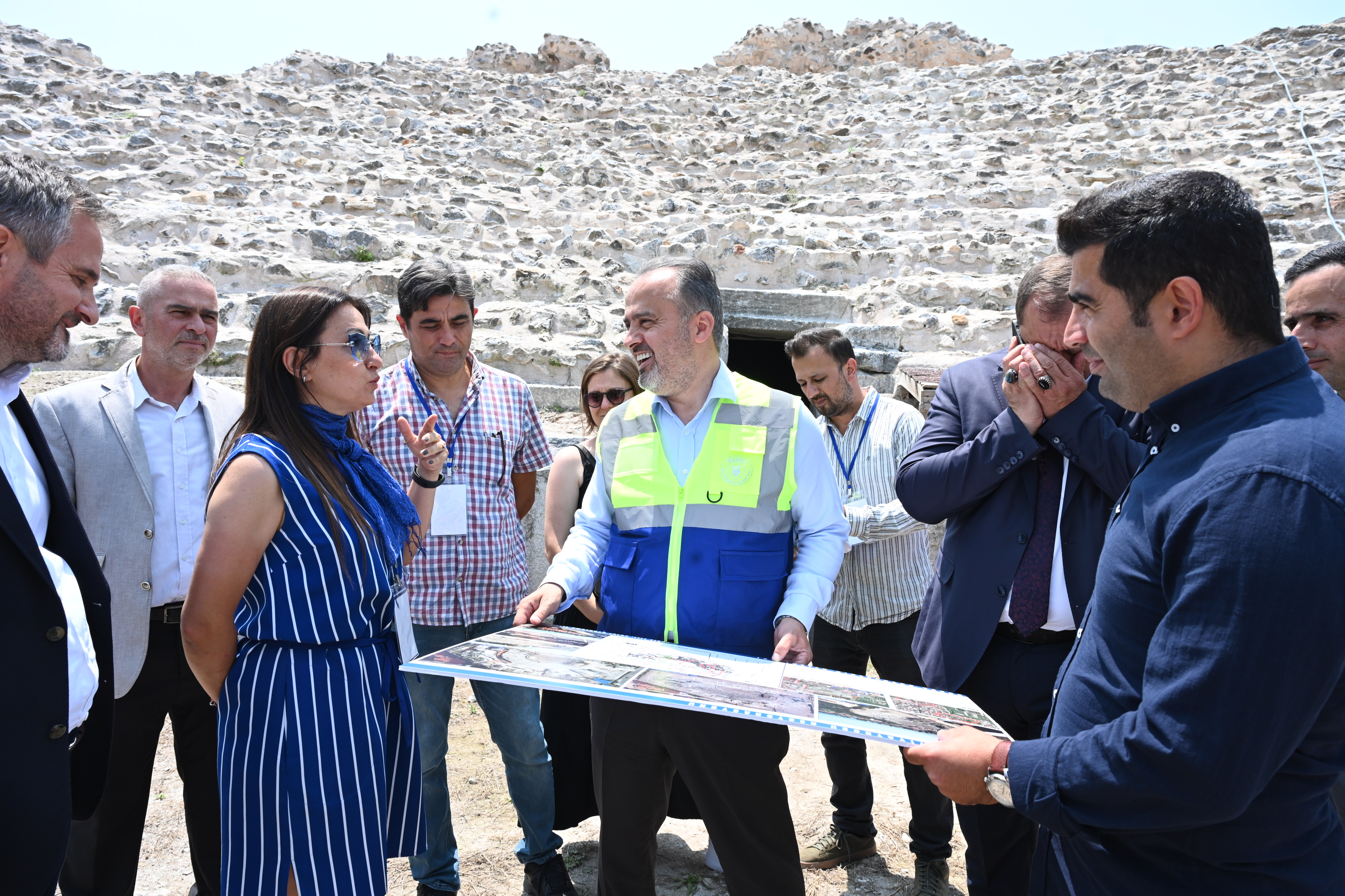 Bursa Büyükşehir Belediye Başkanı Alinur Aktaş, beraberindeki İznik Belediye Başkanı Kağan Mehmet Usta ile birlikte tarihi İznik Roma Tiyatrosu’nda devam eden çalışmaları yerinde inceledi. Uygulamaları tamamlanma aşamasına gelen restorasyon projesi hakkında Kazı Başkanı Doç.Dr. Aygün Ekin Meriç’ten bilgi alan Başkan Aktaş, İznik Müze Müdürlüğü başkanlığında devam eden kazı çalışmalarına Büyükşehir olarak destek verdiklerini hatırlattı. Bursa Kültür Varlıklarını Koruma Bölge Kurulu’nca onaylı proje kapsamında çalışmaların sürdüğünü hatırlatan Başkan Aktaş, “İznik Roma Tiyatrosu projesinde temel yaklaşım; mevcut oturma basamakları, sahne bölümü ve diğer yapı kalıntılarının olumsuz müdahale ve eklentilerden arındırılmasına, uygun bir şekilde korunması için dondurma ve derz işlemi yapılmasına yönelik oldu. Uzun yıllardır İznik turizmine kazandırılmaya çalışılan Roma Tiyatrosu’nda, bizim çalışmalarımızla birlikte, yerli ve yabancı turistlerin alanı gezmesine yönelik gezi güzergâhı oluşturuldu. Oturma basamaklarının üst kısmında yer alan seyir platformu oluşturuldu ve alanın net bir şekilde izlenebilmesi sağlandı. Dondurma işlemleri, derz çalışmaları, seyir platformu ve gezi rotasına yönelik çalışmalar devam ediyor. Aralık ayına kadar çalışmaları bitirmeyi hedefliyoruz. Ben inanıyor ve ümit ediyorum ki ziyaret noktasında Türkiye'deki en iddialı amfi tiyatrolardan bir tanesi olacak ve İznik’in asıl çekim merkezi burası olacak. Sadece İznik için değil, sadece ülkemiz için değil, insanlık adına yapılmış bu çok güzel yatırımı bütün dünyayla buluşturmanın heyecanını yaşıyoruz” diye konuştu.