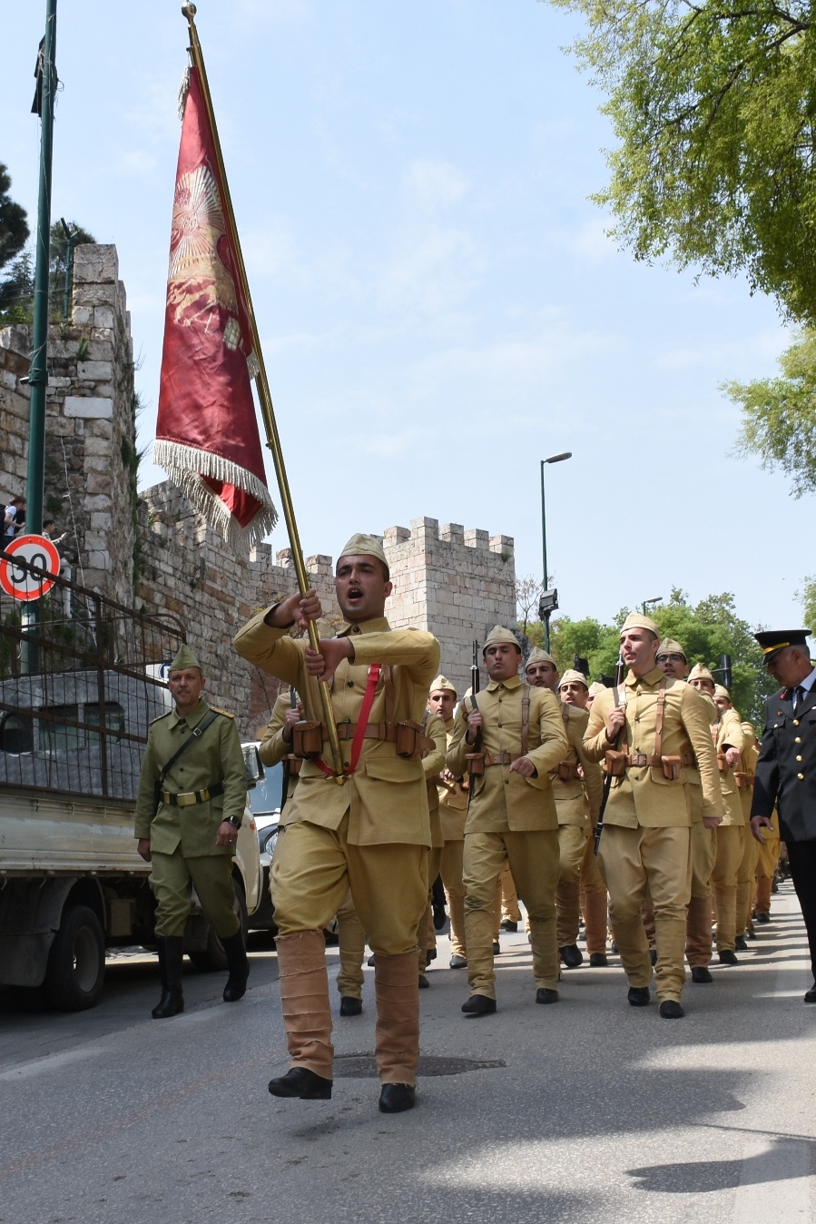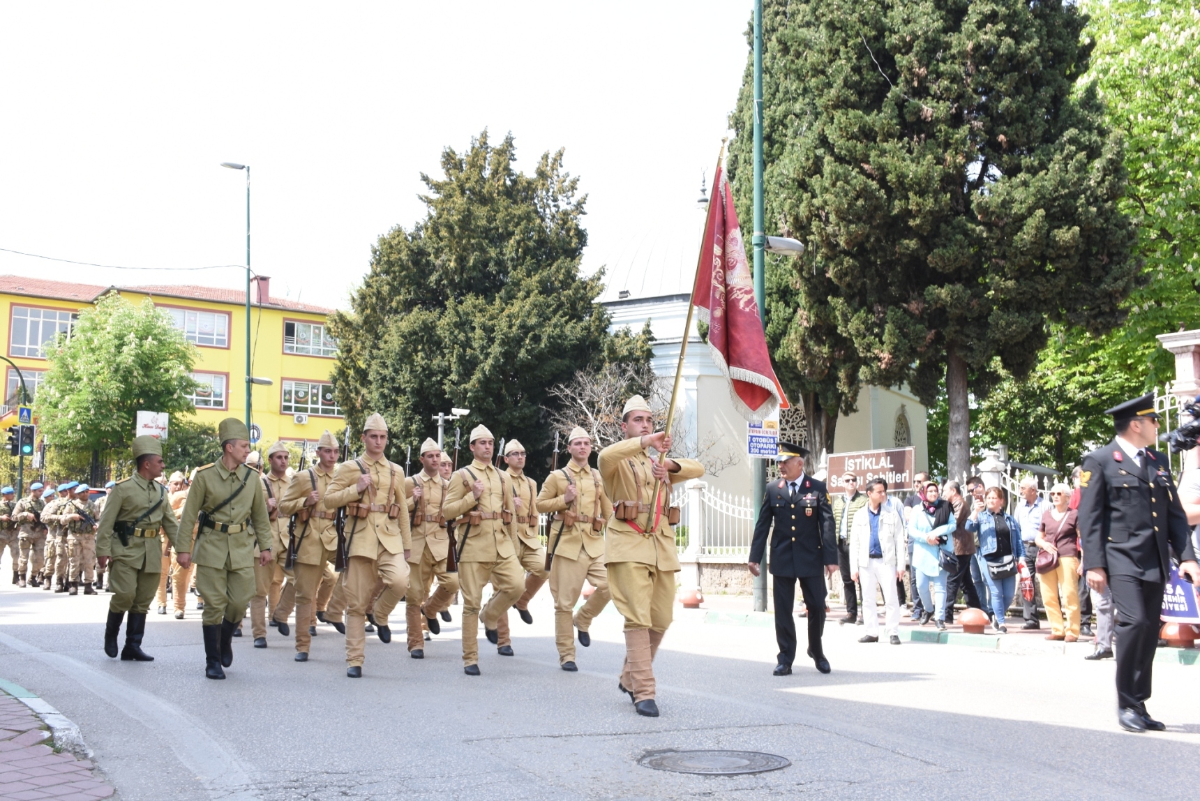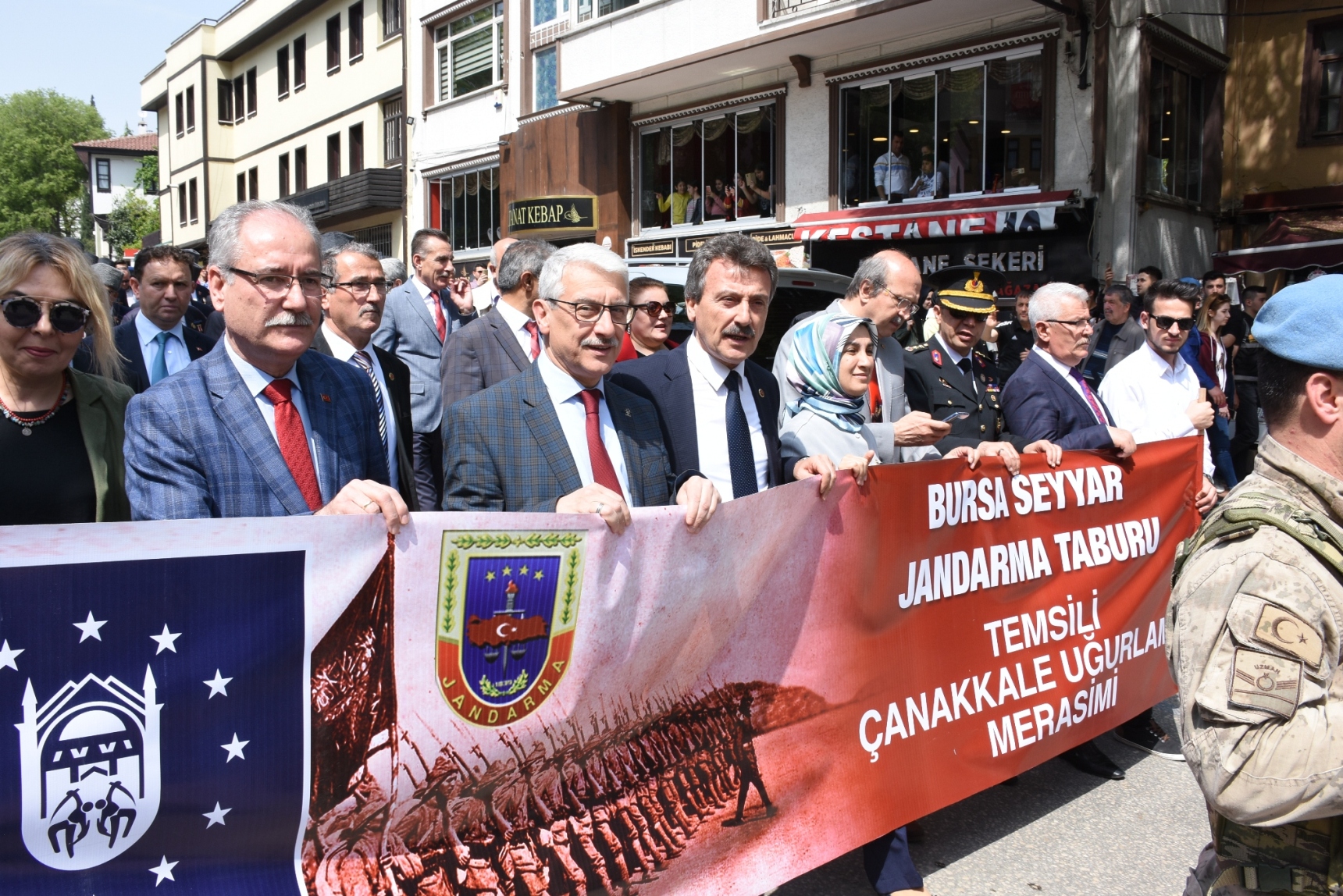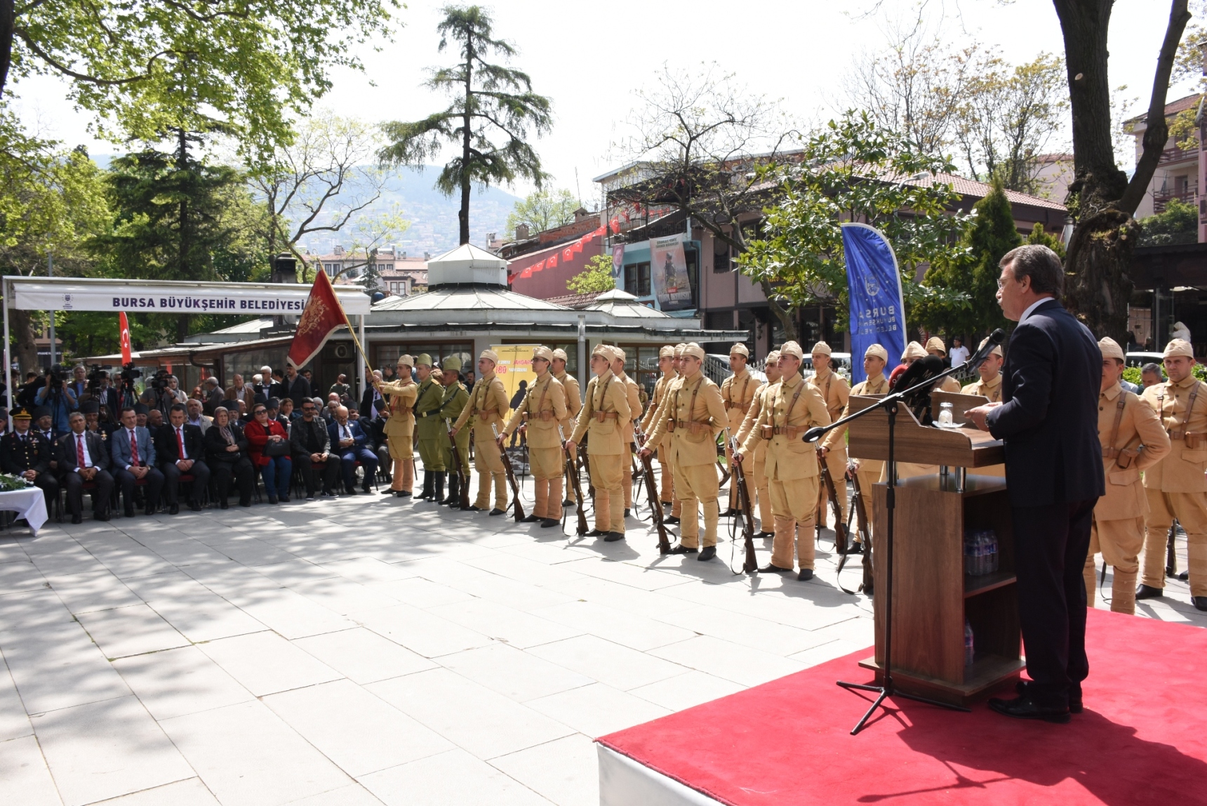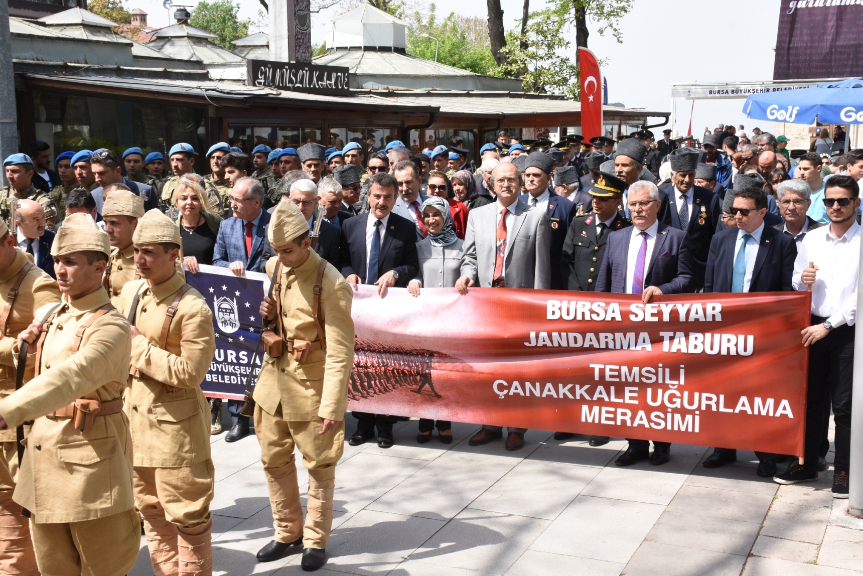 Büyükşehir Belediye Başkanvekili Süleyman Çelik, törende yaptığı konuşmada, 1915-16 yılları arasına gerçekleşen Çanakkale Kara Savaşları’nın tarihin altın sayfalarını dolduran bir destan olduğunu söyledi. Yapılan muharebelerde Bursa’dan 5 bin şehidin verildiğini hatırlatan Çelik, “Boğazı geçemeyen itilaf devletleri karaya çıkarma yapıp harekatı başlattıklarında, savunma hatlarımızı güçlendiren takviye birliklerden biri de Bursa Seyyar Jandarma Taburu idi. Yaklaşık 100 kişiden oluşan Yüzbaşı Hasan Tahsin Bey komutasındaki taburumuz, savaşın kaderini değiştiren stratejik savunmaların hep önünde yer almıştır. Cepheden cepheye koşarak bir nevi özel görev taburu olarak muharebelerde yer alan Bursa Seyyar Jandarma Taburu, ağır kayıplar vermesine karşın düşman saldırılarını kırarak adını tarihe altın harflerle yazdırmıştır” dedi. Çanakkale ruhunu hissedebilmek, ecdadın vatan savunması için yaptığı gayrete şahit olabilmek için temsili olarak uğurlama programını düzenlediklerini kaydeden Çelik, “Yakın tarihimizde yazılan bu destan, ecdadımızın aziz hatırasını hatırlatacak, milli birlik ve beraberliğimizi daima canlı tutacak izler bırakmıştır. Bu vesileyle, Çanakkale’de canlarını feda ederek bizlere huzur içerisinde yaşayacağımız bir vatan bırakan ecdadımızı rahmet ve minnetle anıyoruz” diye konuştu.