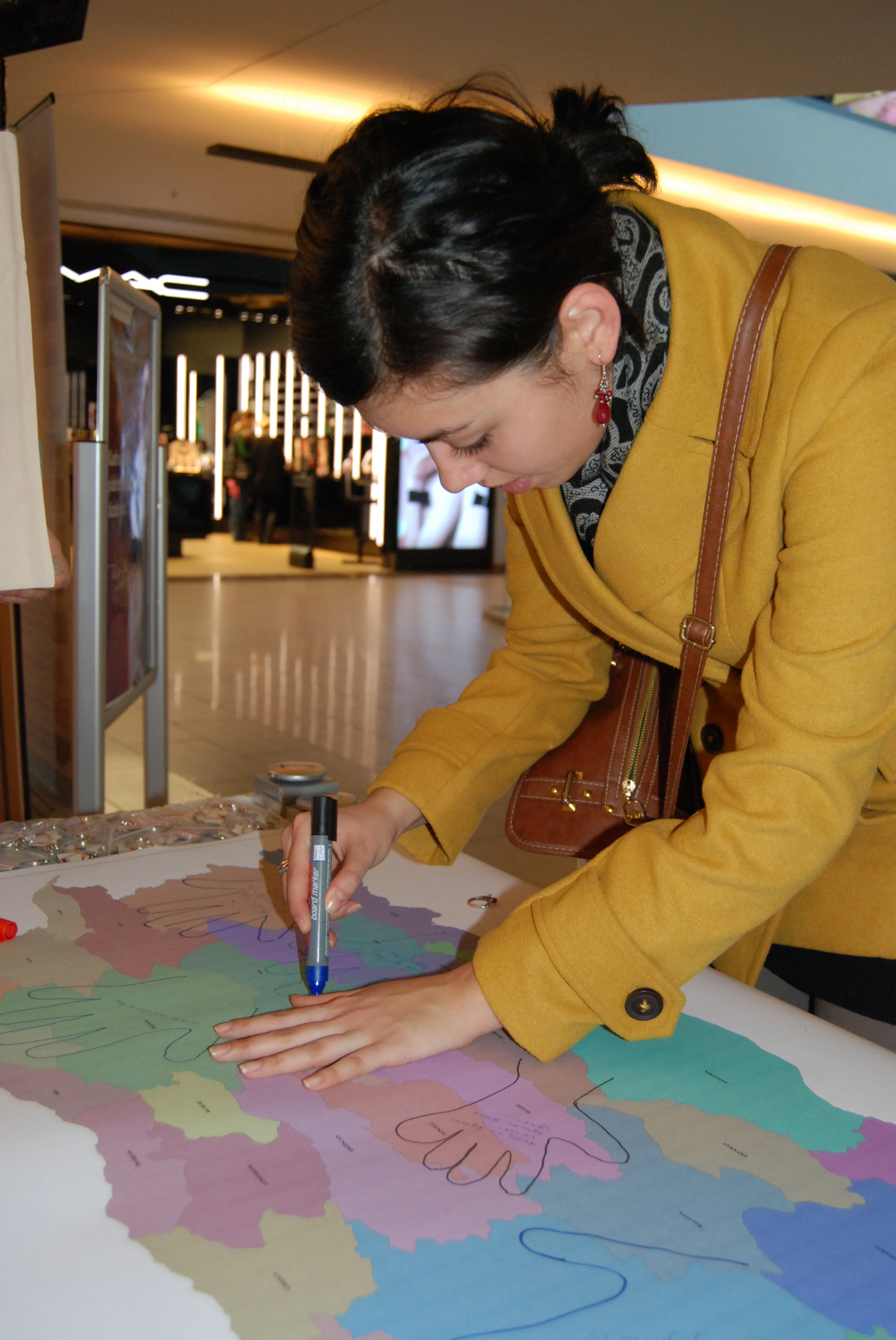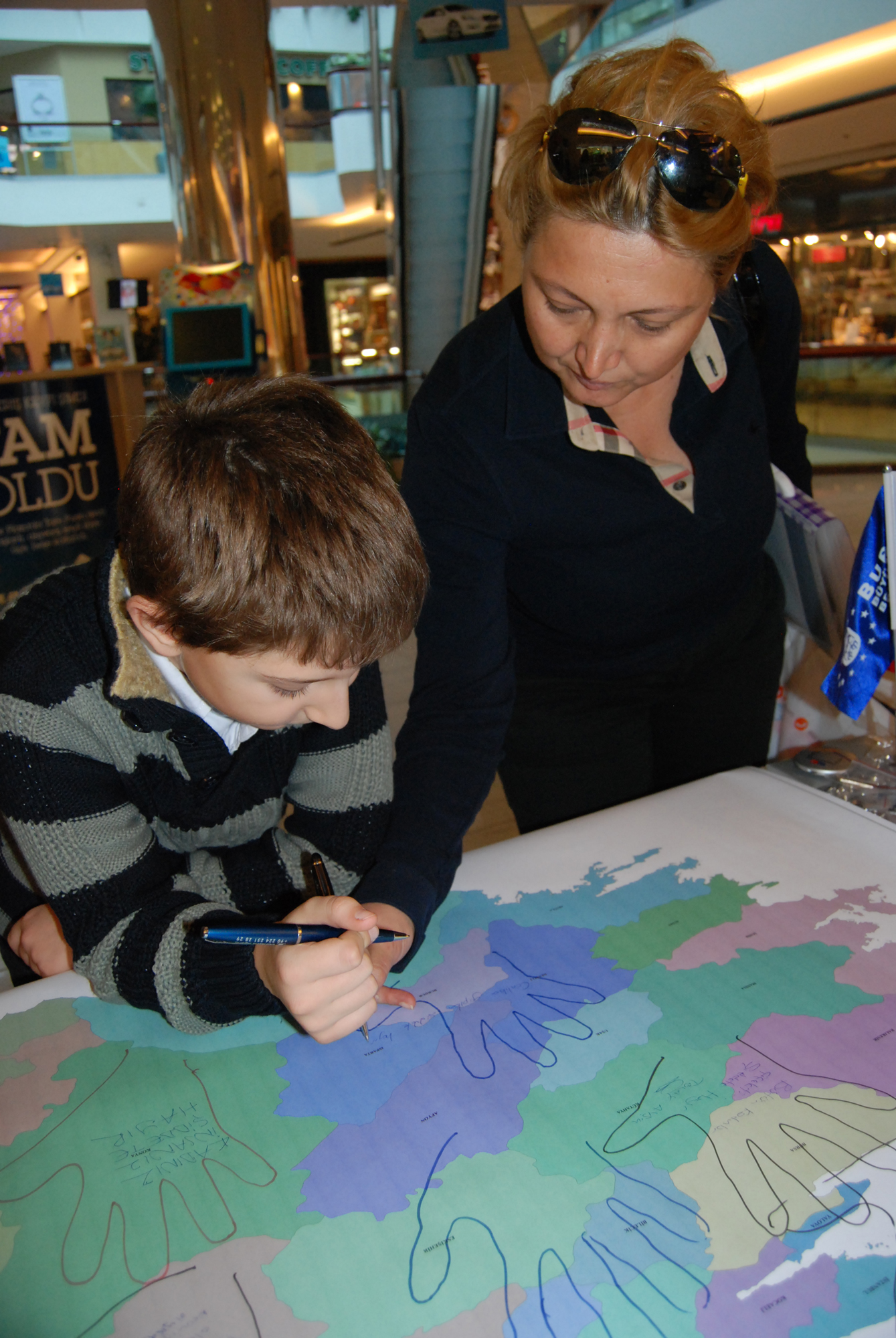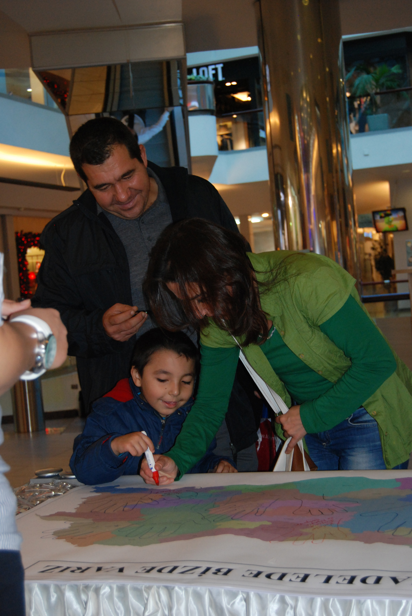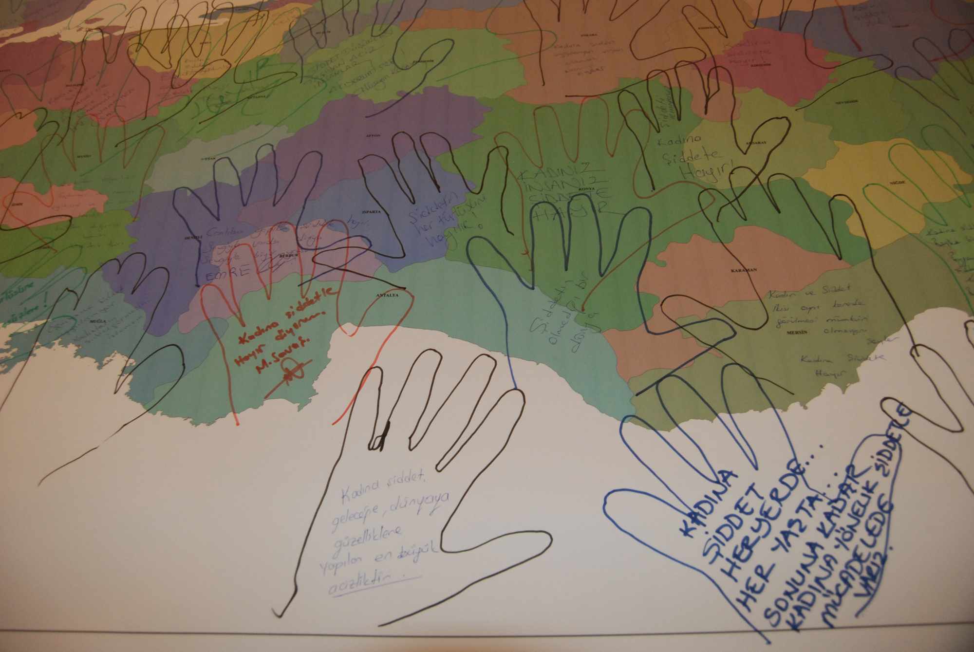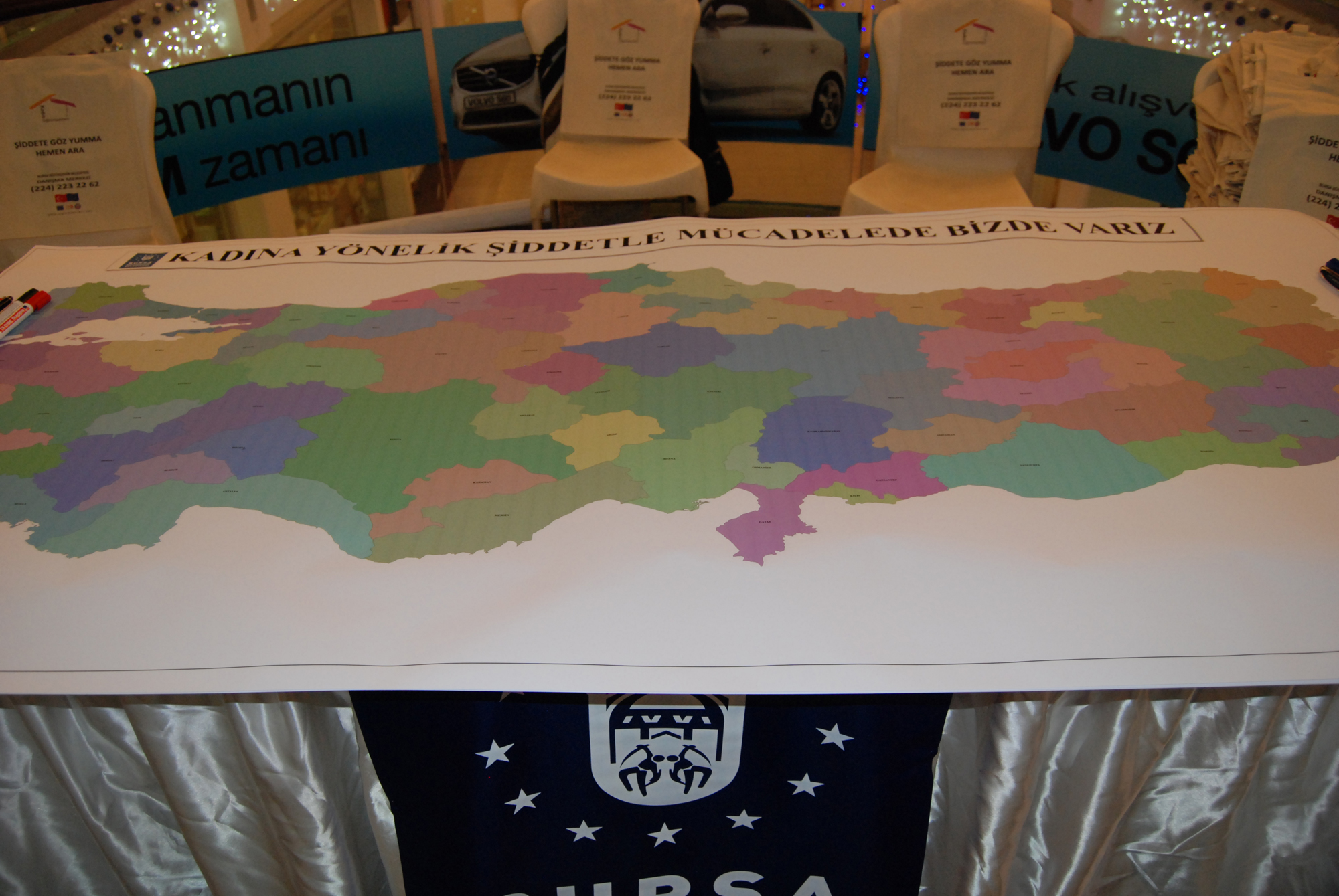 ‘Kadına Yönelik Şiddetle Mücadele Günü’, Türkiye’nin her köşesinde farklı organizasyonlarla sahne olurken, Bursa Büyükşehir Belediyesi’nin Zafer Plaza’da düzenlendiği etkinliğe katılan kadınlar da Türkiye haritası üzerine el izlerini bırakarak, şiddete tepki gösterdi. Büyükşehir Belediyesi tarafından kurulan stantta yer alan dev Türkiye haritası üzerine ellerinin resmini çizen bayanlar, şiddete tepki gösteren mesajlarını da çizdikleri elin içine yazdı. Yaklaşık 500 bayanın katıldığı etkinlikte, Türkiye haritası tamamen bayanların şiddete tepki yazıları içeren el izleriyle dolarken, katılımcılara günün anısına kadın sığınma evleri projesi bez çantası, ayna ve anahtarlık hediye edildi.