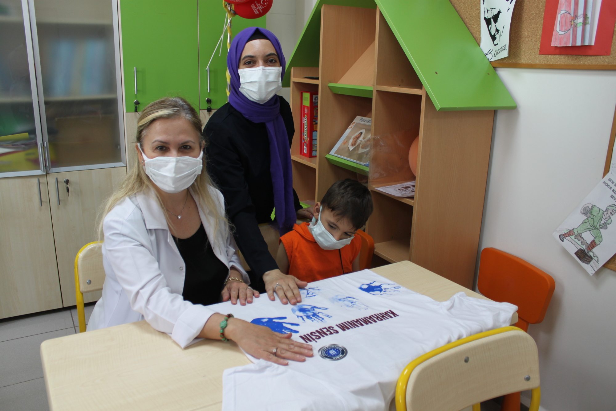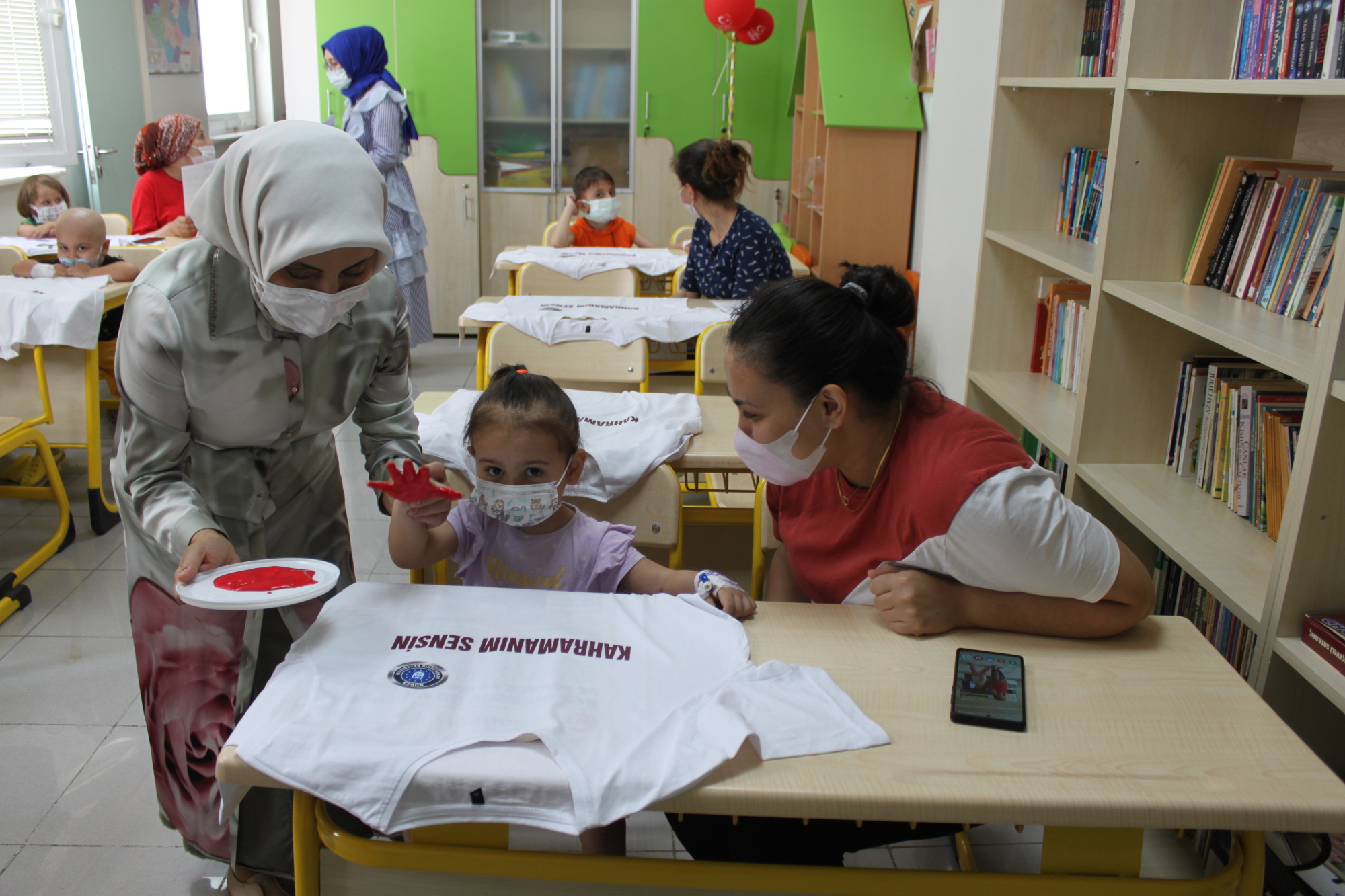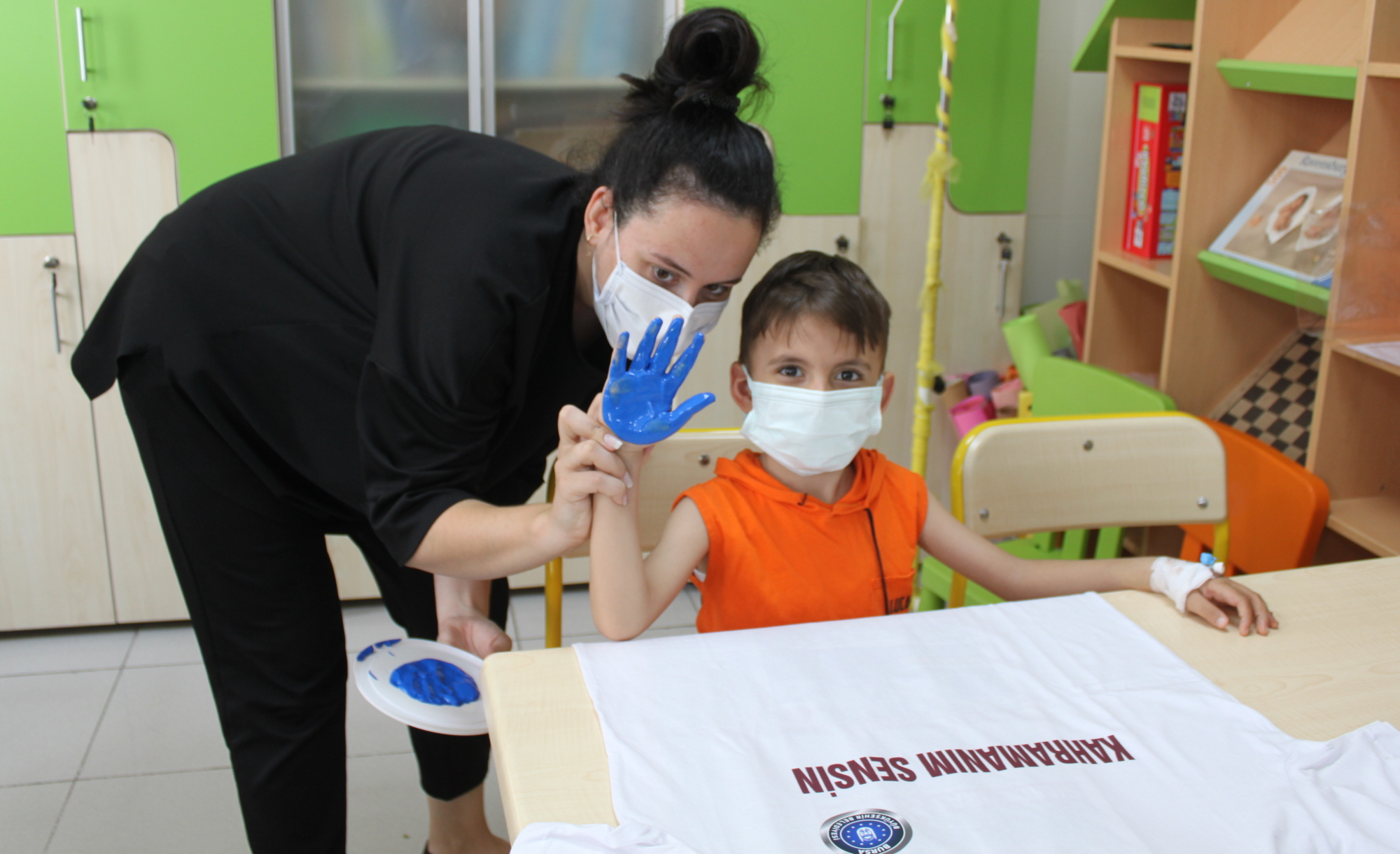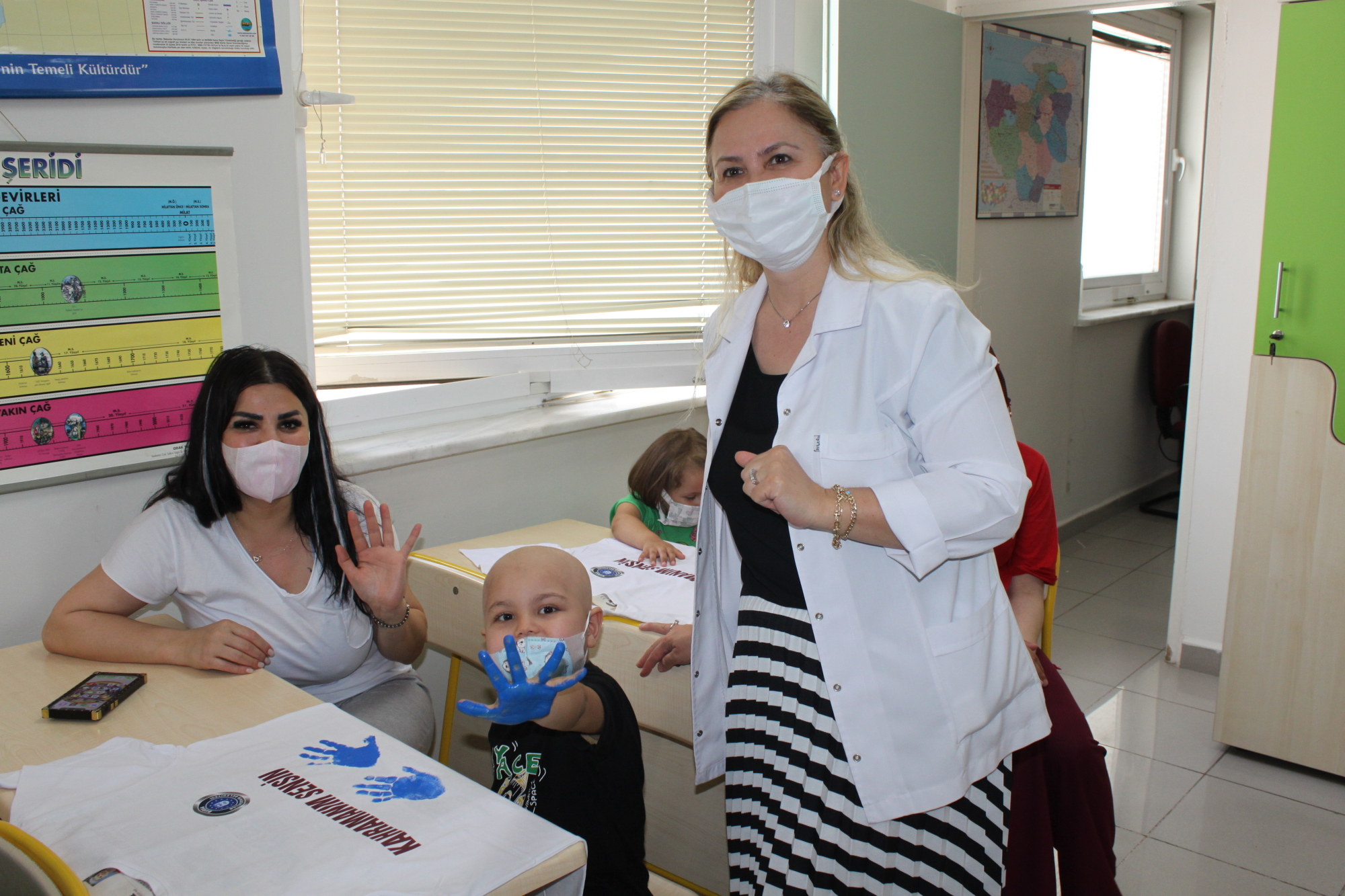 Bursa Büyükşehir Belediyesi Kültür ve Sosyal İşler Dairesi Başkanlığı, Yüksek İhtisas Eğitim ve Araştırma Hastanesi Çocuk Hematoloji Bölümü’nde tedavi gören çocuklar için özel bir etkinliğe imza attı. Gönüllü Resim Öğretmeni Selin Yıldız, hasta çocuklarla birlikte organik boyalar kullanarak, el baskısı yaptı. Babalar Günü nedeniyle düzenlenen etkinlikte, hasta çocuklar ‘kahramanım sensin’ yazılı beyaz tişörtlere babaları için el baskısı yaptı.