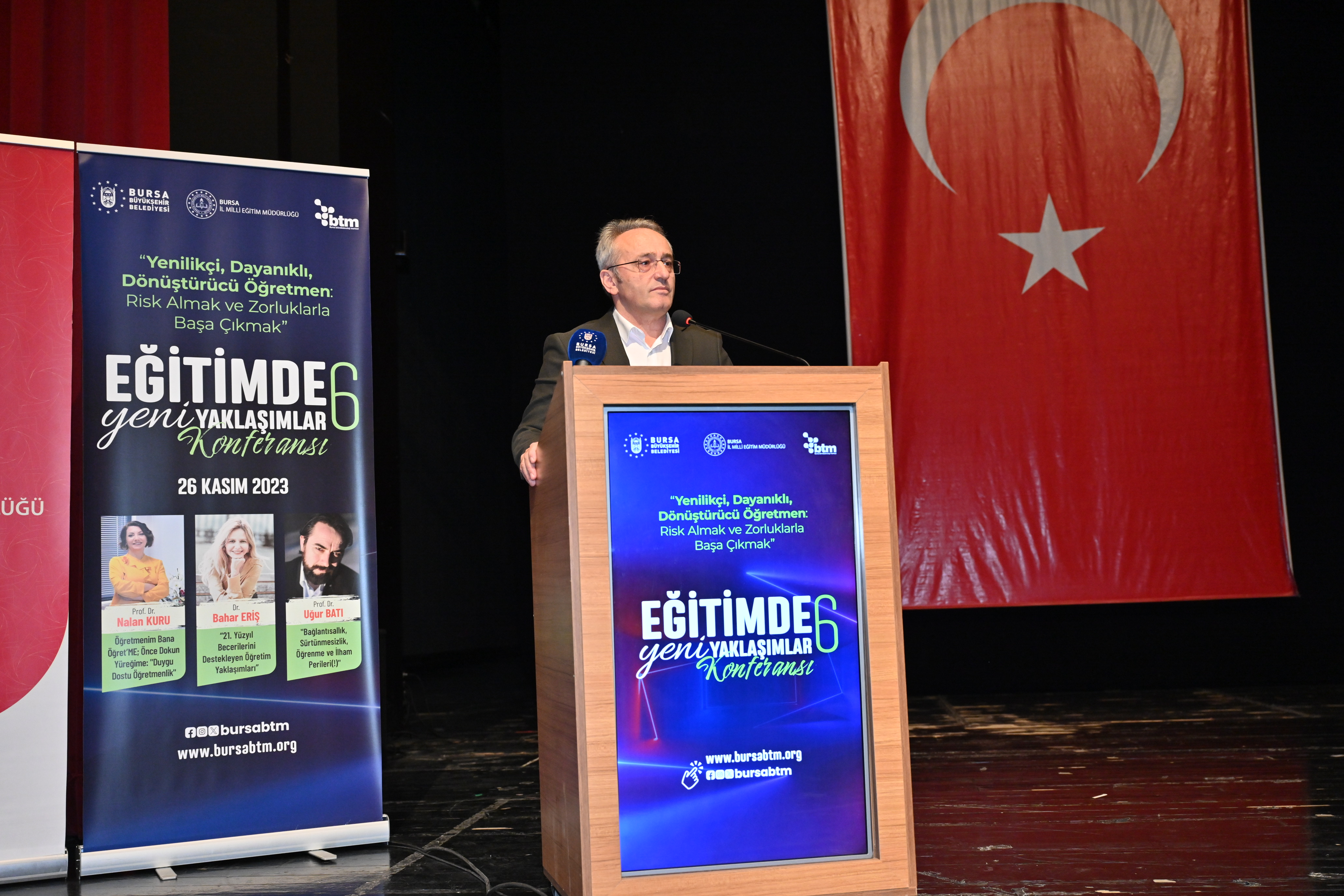 İl Milli Eğitim Müdürü Ahmet Alireisoğlu da bir milli eğitim müdürü için 24 Kasım haftasında meslektaşlarıyla, öğrenmenin kendini geliştirmenin başlangıcını ihya eden bir program içerisinde bulunmaktan mutluluk duyduğunu söyledi. Bursa'daki 700 bine yakın öğrenci ve anne babaları adına bu eğitim çalışmasına katılan öğretmenlere teşekkür eden Alireisoğlu, "Ben inanıyorum ki 40 bin öğretmenimiz de burada. Çünkü siz burada çok değerli hocalarımızdan öğrendiğiniz bilgilerle, kendinize katmış olduğunuz katkıyla 40 bin öğretmen arkadaşımızı da şekillendireceksiniz ve onlara da liderlik yapacaksınız. Bu anlamda eğitimde yeni yaklaşımlar çok önemli bir etkinlik Bursa için. Evet bizim yeni yaklaşımlara, yeni becerilere, yeni tutumlara ihtiyacımız var. Çünkü çocuklarımız her yıl bilimin teknolojinin ve değişimin baş döndürücü etkisi altında farklılaşıp, farklı tutumlarla ve çözmemiz gereken yeni problemlerle karşımıza geliyorlar. Biz tabii ki kendimizi yenilemek durumundayız. Tabii ki bunu bir tek başımıza yapamayız. Bu anlamda duyarlı, bu anlamda destek vermeye açık bir kurum, kurumun başında da lider olunca bunu gerçekleştiriyoruz. Bunu Büyükşehir Belediyemizin katkılarıyla, değerli başkanımın liderliğiyle gerçekleştiriyoruz. Ben bu vesileyle kendisine katkısı için, bu anlamdaki destekleri için huzurlarınızda tekrar teşekkür ediyorum" dedi.
