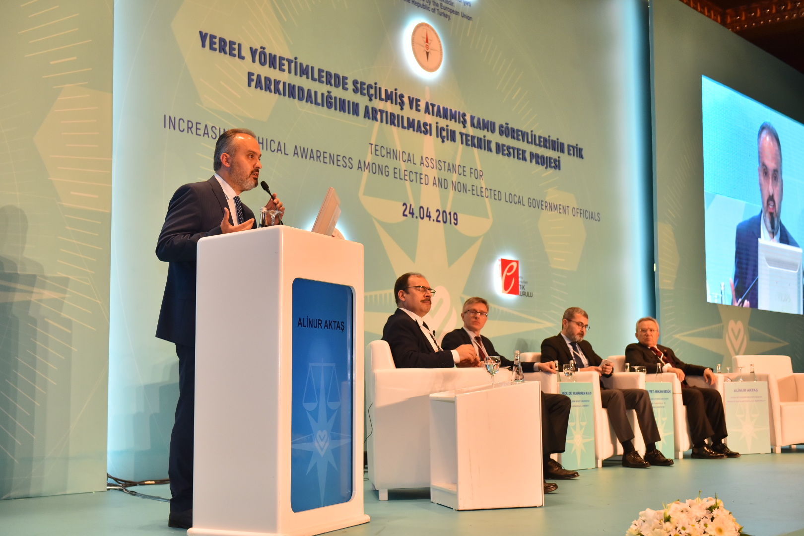 Türkiye Cumhuriyeti ile Avrupa Birliği (AB) tarafından ortaklaşa yürütülen ve kamuda etik anlayışın yaygınlaştırılmasını hedefleyen Yerel Yönetimlerde Seçilmiş ve Atanmış Kamu Görevlilerinin Etik Farkındalığının Artırılması İçin Teknik Destek Projesi’nin açılışı, Sheraton Otel’de gerçekleştirildi. Projenin açılışına, Cumhurbaşkanı Yardımcısı Oktay İle İçişleri Bakanı Soylu’nun yanı sıra Avrupa Birliği Türkiye Delegasyonu Başkanı Christian Berger, Türkiye Belediyeler Birliği Başkanı Fatma Şahin ve Kamu görevlileri Etik Kurulu Başkanı Köksal Toptan da katıldı. Bursa Büyükşehir Belediye Başkanı Alinur Aktaş, protokol konuşmalarının ardından organize edilen Yerelde Etik Farkındalık Panelinde söz alarak, kamuda etik konusunda düşüncelerini ve bu konuda yaptıkları çalışmaları dile getirdi.