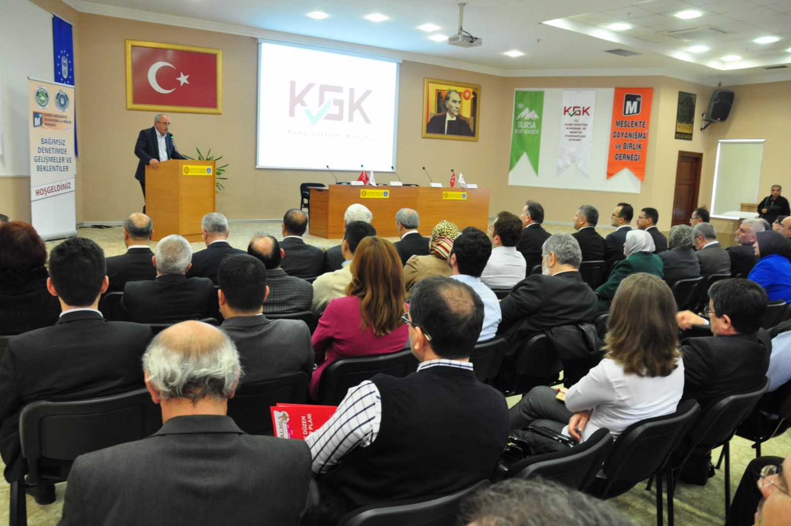 BKK’nin katılımcı derneklerinden olan Meslekte Dayanışma ve Birlik Derneği tarafından Atatürk Kongre Kültür Merkezi (Merinos AKKM) Başkanlık Salonu’nda düzenlenen ‘Bağımsız Denetimde Gelişmeler ve Beklentiler’ konulu toplantıya, Kamu Gözetimi Muhasebe ve Denetim Standartları Kurumu Başkanı Seyit Ahmet Baş, kamu kurumlarının temsilcileri, akademisyenler ve çok sayıda mali müşavir katıldı. Toplantıda konuşan Dernek Başkanı Asım Karaman, geçiş dönemindeki yetkilendirme sürecinin hızla devam ettiğini söyledi. Durumun en çok bağımsız denetim raporunu talep edecek iş, finans, rapor düzenleyen denetçileri ve meslektaşlarını ilgilendirdiğini belirten Karaman, “Serbest muhasebeci mali müşavirler olarak denetimin hep içinde olduk. Bağımsız denetçilere verilen sorumluluk her ne kadar uykularımızı kaçırsa da meslekten beklentilerimiz var. Bu noktada düzenlediğimiz toplantı, bilgilenmemiz açısından önem taşıyor” dedi.