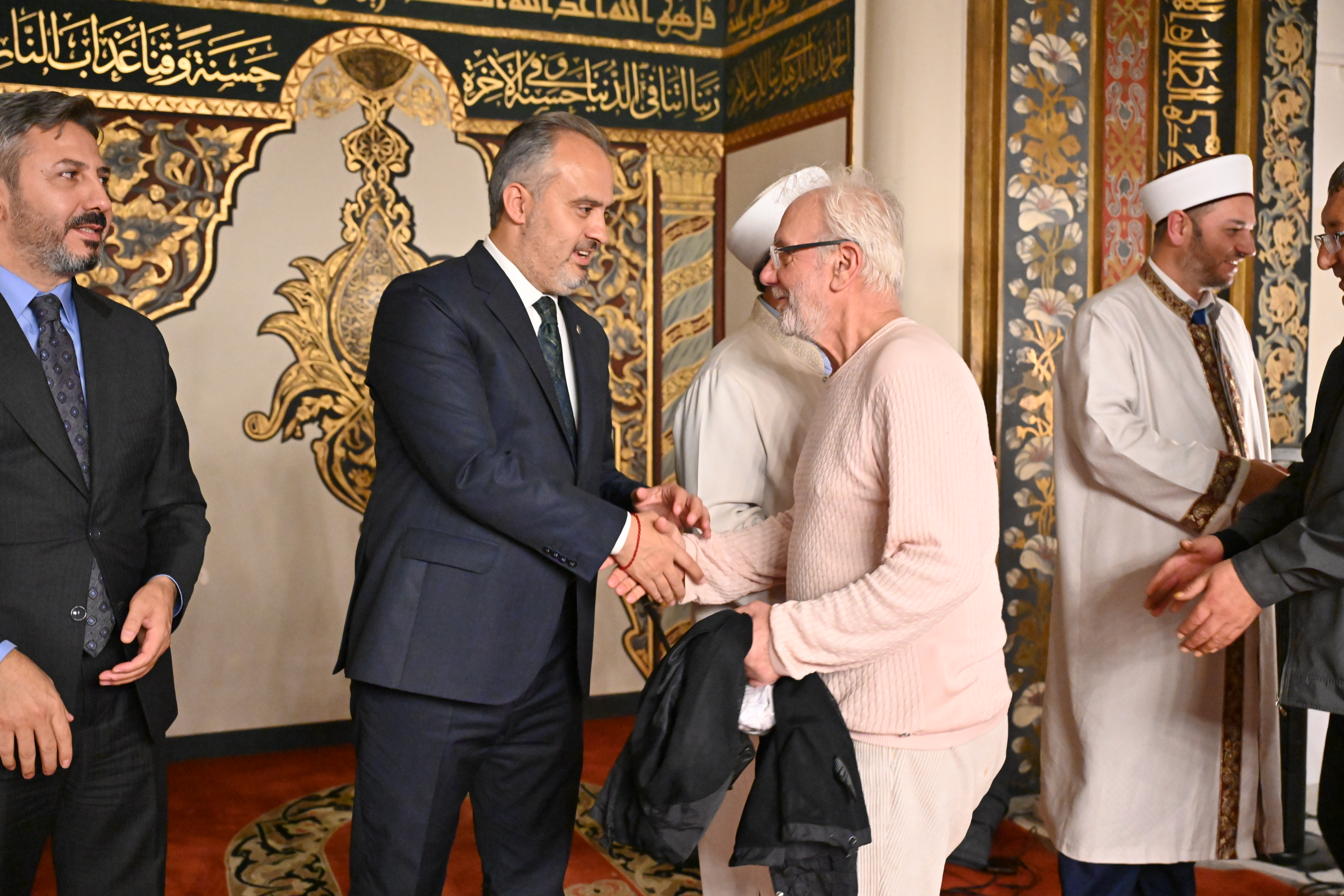 BURSA – Alemlere rahmet olarak gönderilen Hazreti Muhammed’in dünyaya gelişinin yıldönümü olan Mevlit Kandili’nde Bursalılar özellikle selatin camilerine akın ederken, Büyükşehir Belediye Başkanı Alinur Aktaş da kandil coşkusunu Ulu Cami’de vatandaşlarla birlikte yaşadı. Başkan Aktaş, kandil programının ardından vatandaşlara süt ve akide şekeri ikram etti.