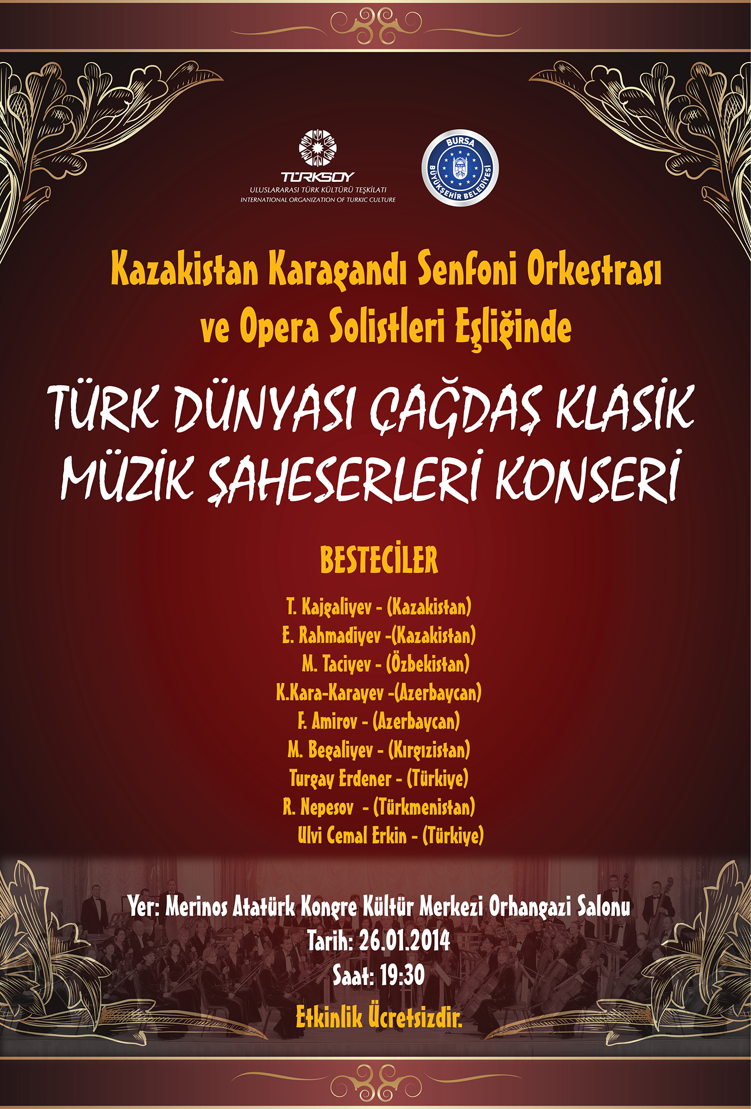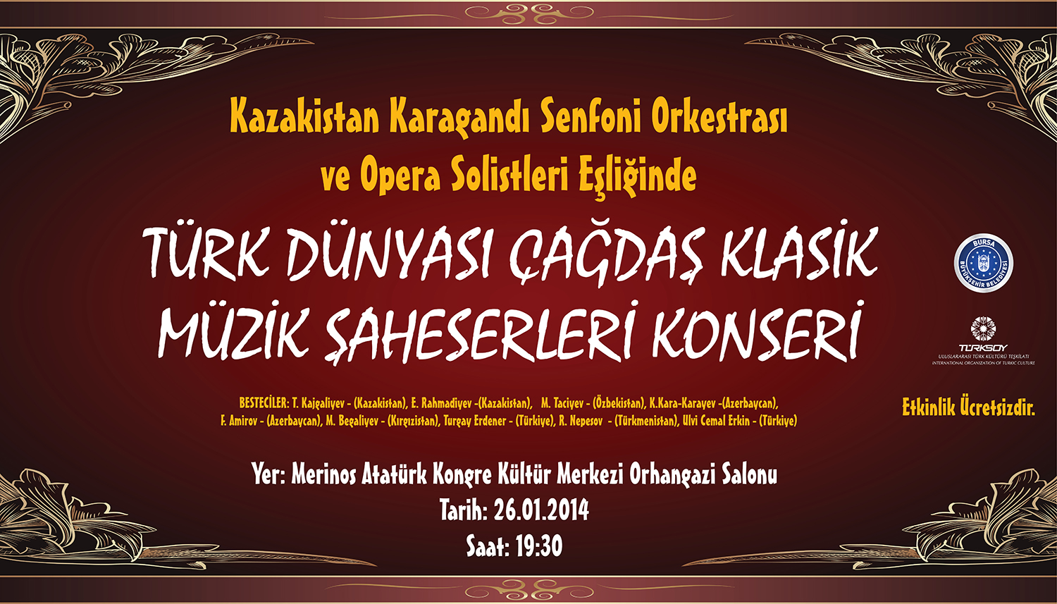 - Türkiye’ye ilk kez gelen Kazakistan’ın Karagandı Senfoni Orkestrası, 26 Ocak Pazar günü Bursa’da konser verecek.