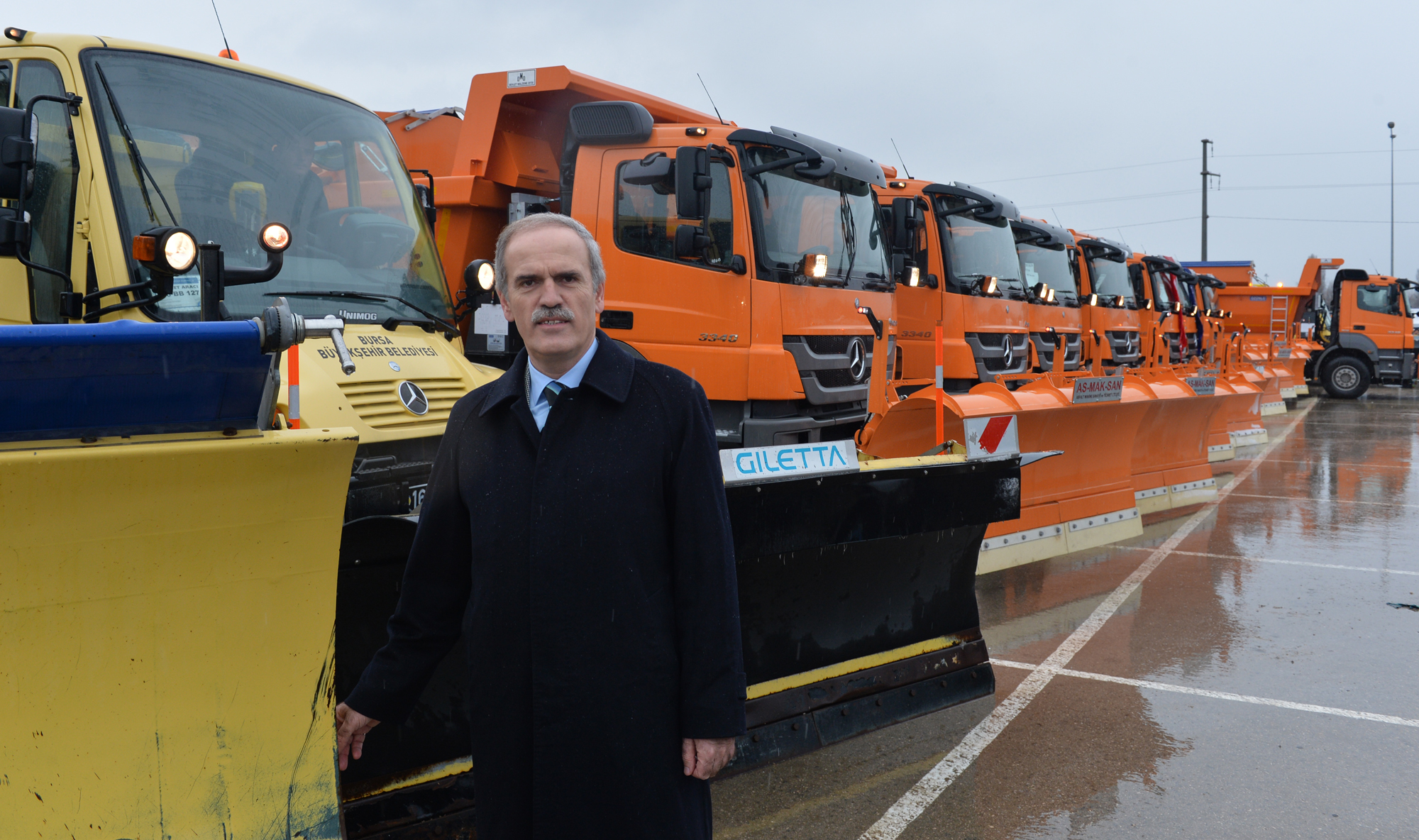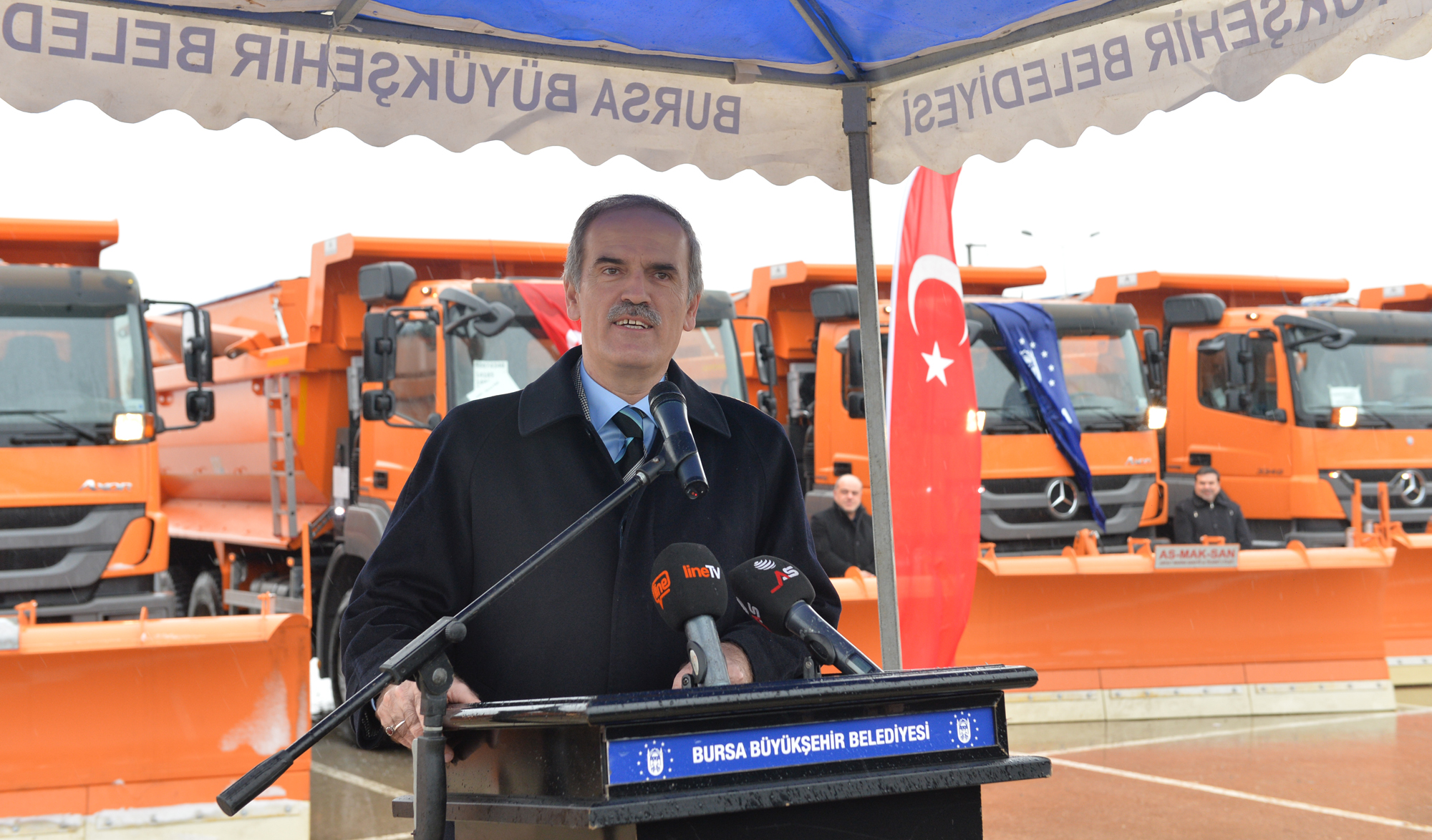 BURSA - Bursa Büyükşehir Belediyesi, önceki yıllardan farklı olarak bu yıl 17 ilçe ve köyleri de kapsayacak şekilde genişletilen karla mücadele çalışmaları kapsamında hem araç filosunu güçlendirdi hem de personel sayısını artırdı. Karla mücadele çalışmalarının startını veren Büyükşehir Belediye Başkanı Recep Altepe, “Bu kışı sorunsuz geçirmek için her türlü tedbirimizi aldık. Yeter ki kar yağsın” dedi.
