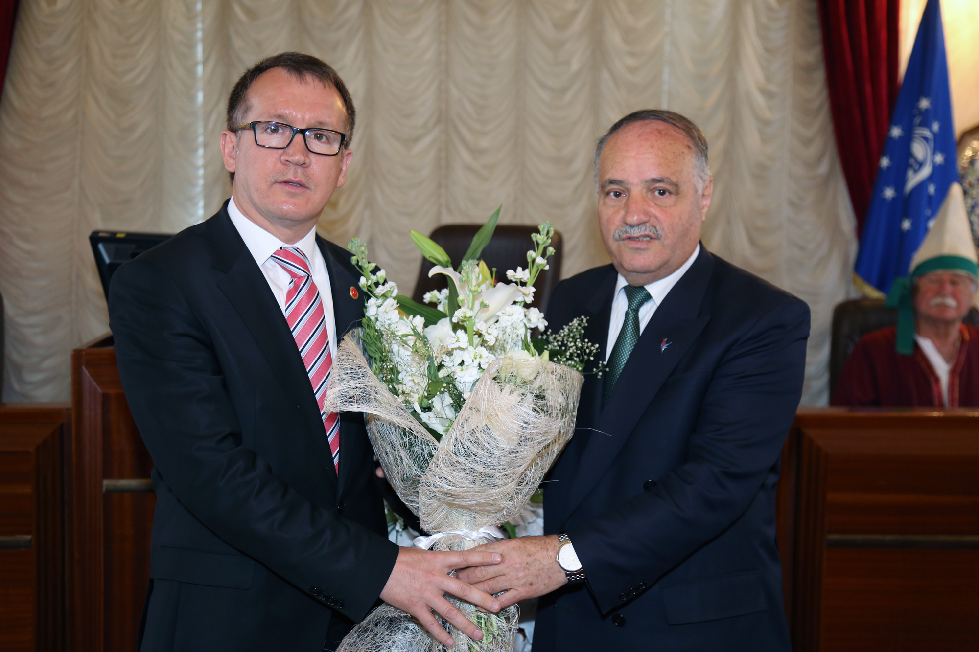 İpekyolu Uluslararası Öğrenci Derneği Başkanı Ebubekir Armağan, Bursa’da üniversite ve lise eğitimi alan yabancı öğrencilerle birlikte Büyükşehir Belediyesi Başkanvekili Abdulkadir Karlık’ı ziyaret etti. Bursa’da 101 farklı ülkeden 1874 kayıtlı öğrencinin eğitim aldığını ifade eden Armağan, önümüzdeki 3-4 yıl içinde bu sayının 5 bine ulaşmasının beklendiğini kaydetti. Türkiye’de eğitim alan yabancı öğrencilerin ülkeler arası ilişkiler açısından büyük önem taşıdığını ifade eden Armağan, “1990 yılından bu yana Türkiye’de eğitim alıp, ülkelerine dönen öğrenciler, yönetim kademelerinde önemli görevlere geldiler. Bu dostluk ve kardeşlik ilişkilerinin yakın gelecekte İslam dünyasında yaşanan kargaşanın sona ermesini sağlayacağına inanıyoruz” dedi.