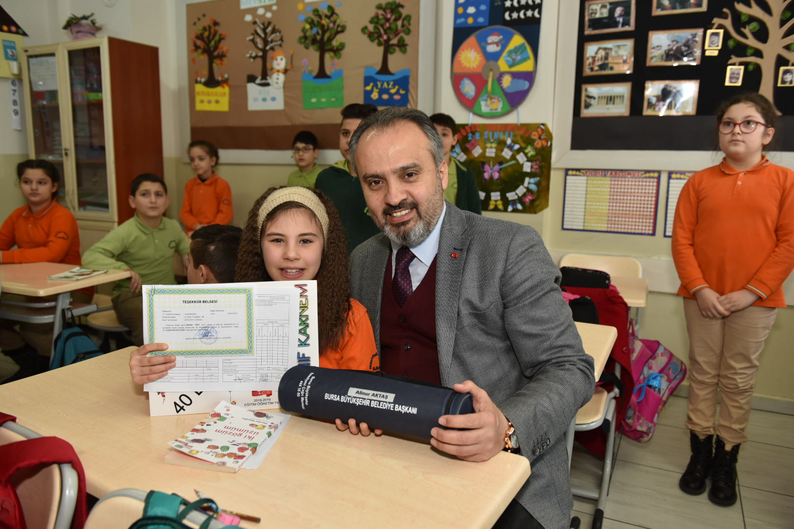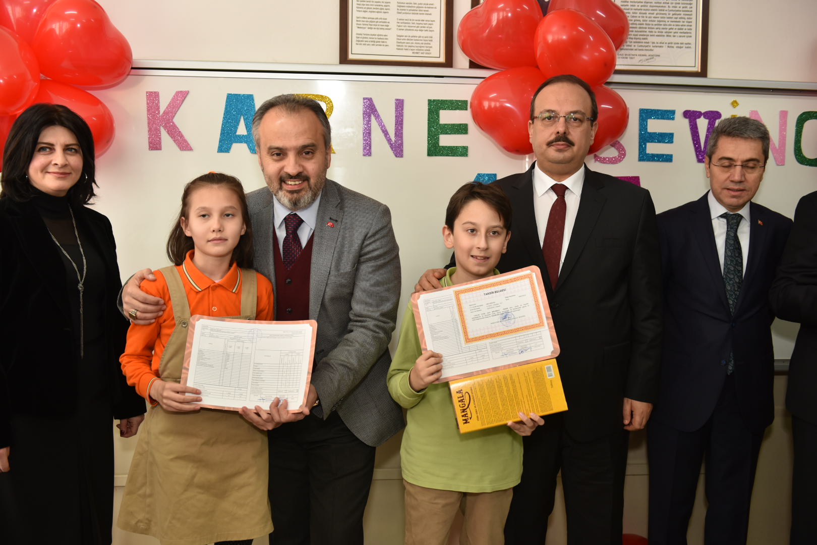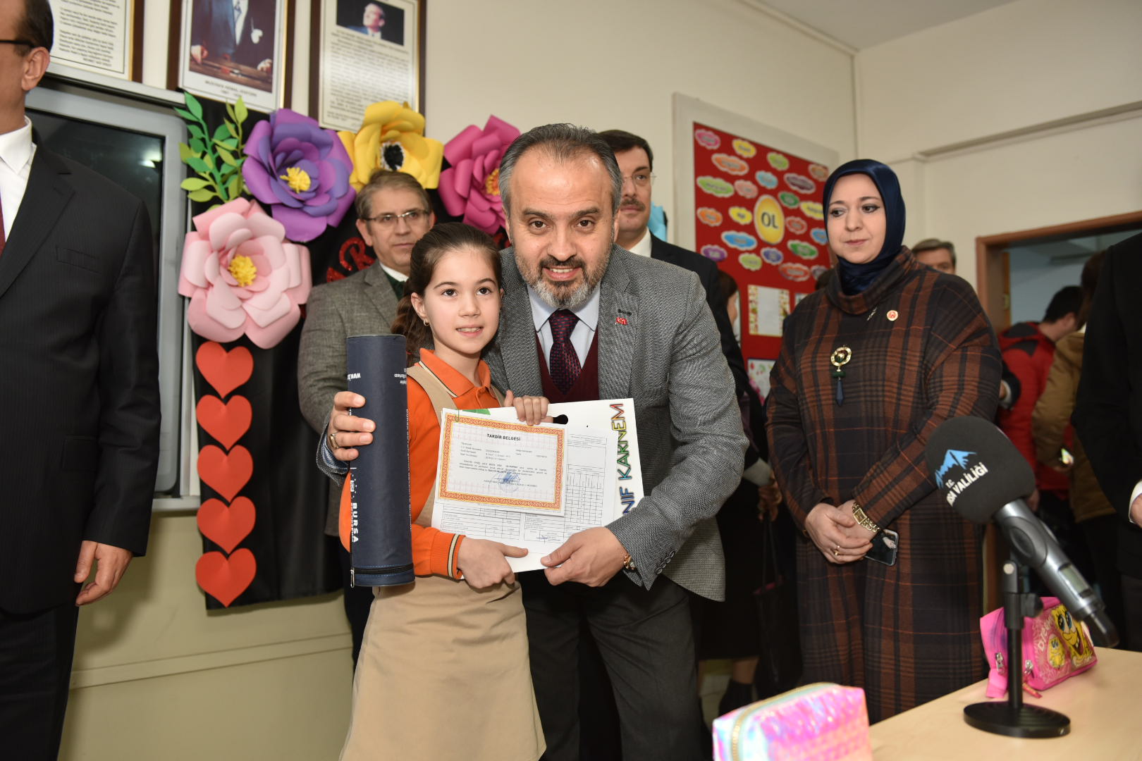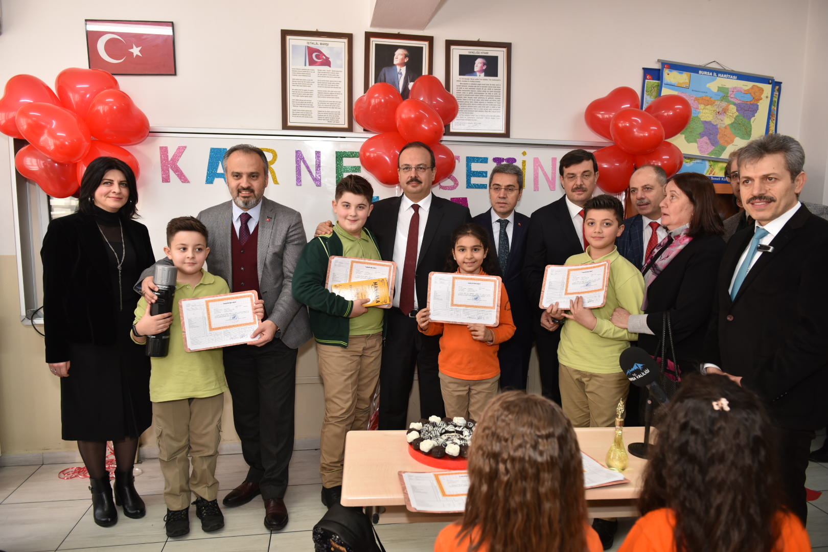 BURSA - Bursa Büyükşehir Belediye Başkanı Alinur Aktaş, karne sevincine ortak olduğu öğrencilere önce karne ve hediyelerini dağıttı, ardından eline fotoğraf makinesi alıp, karne alan öğrencilerin fotoğrafını çekti.