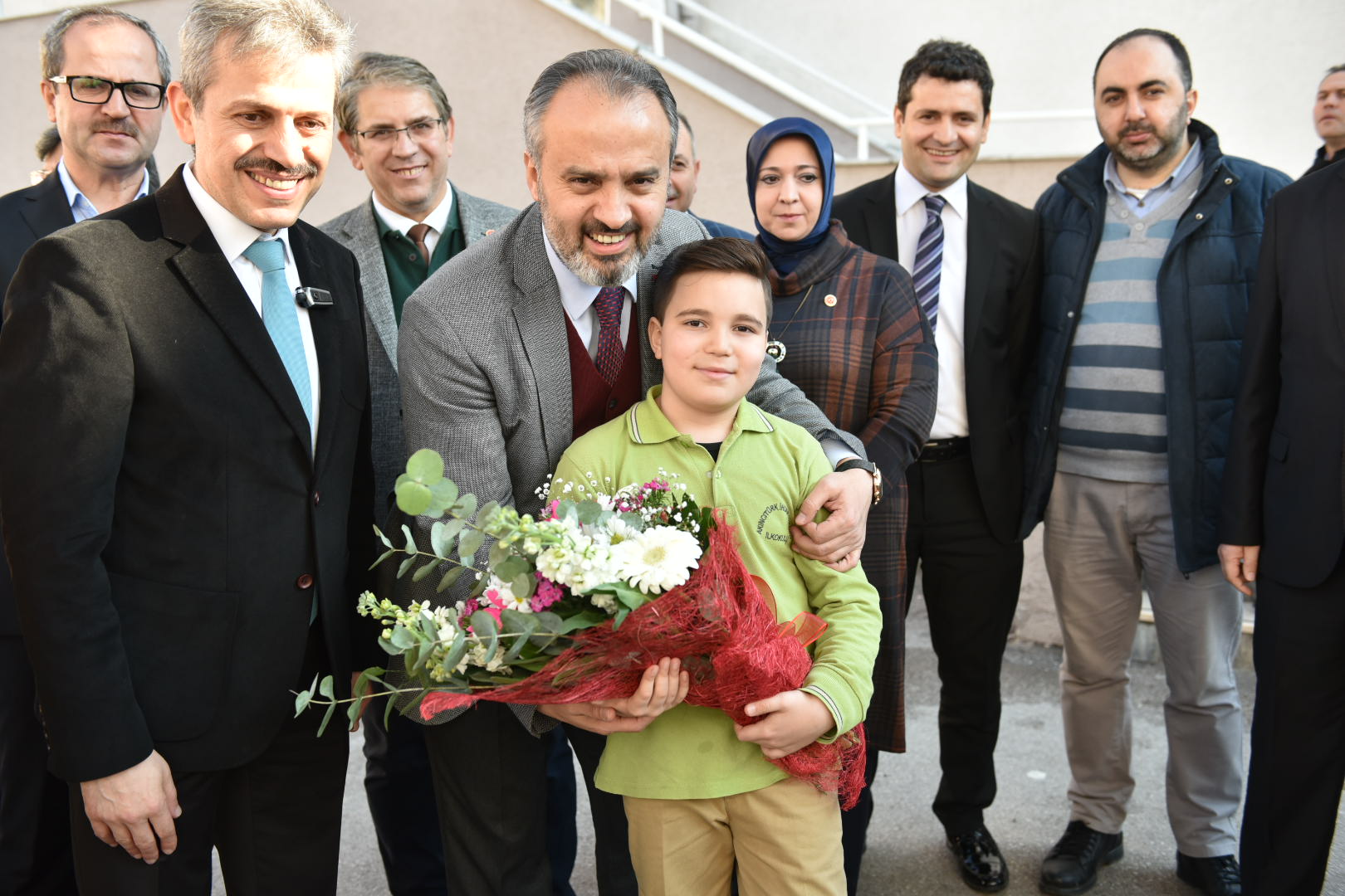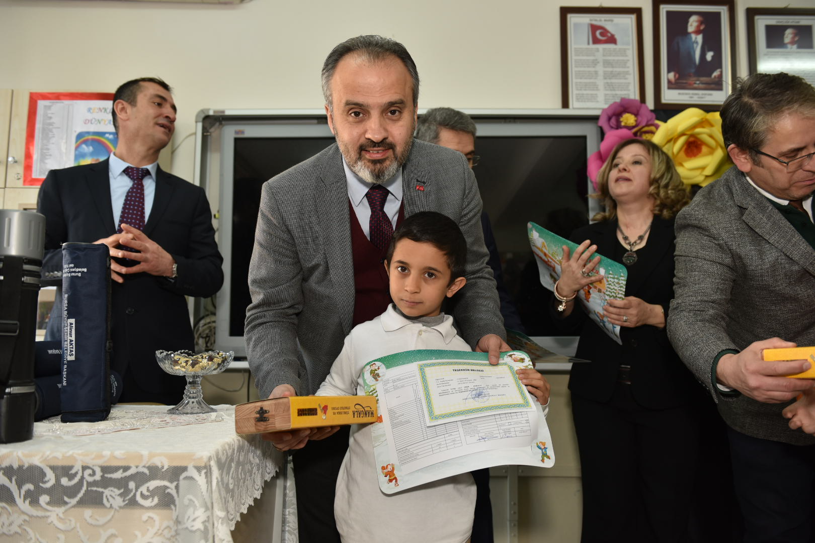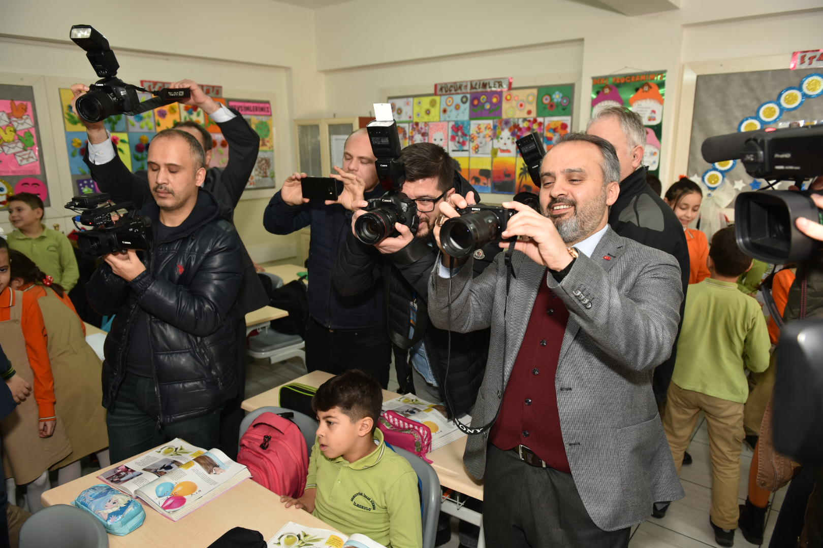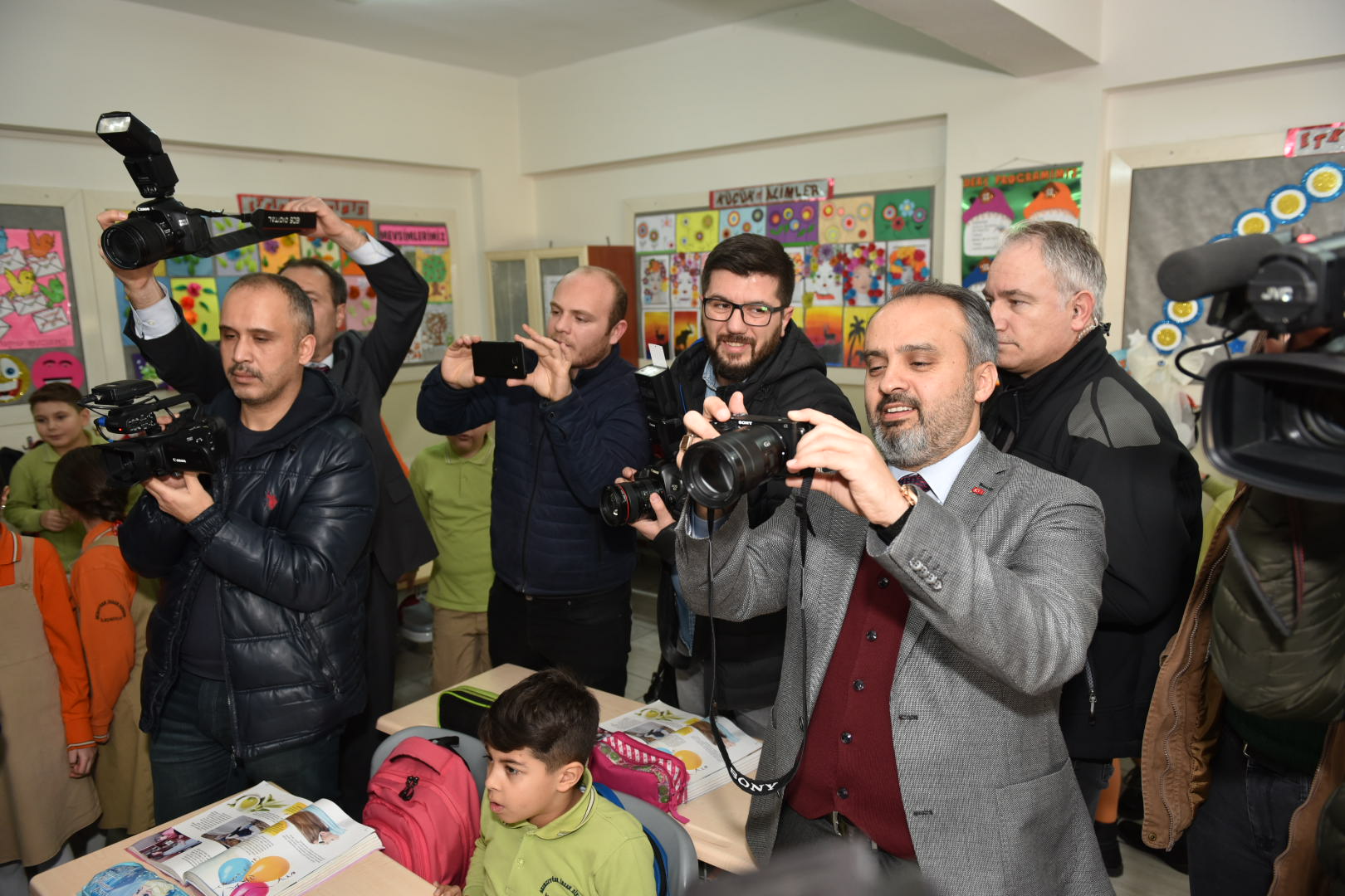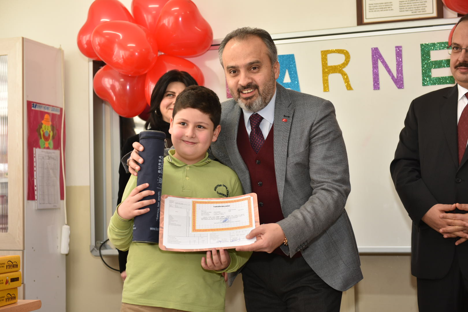BURSA - Bursa Büyükşehir Belediye Başkanı Alinur Aktaş, karne sevincine ortak olduğu öğrencilere önce karne ve hediyelerini dağıttı, ardından eline fotoğraf makinesi alıp, karne alan öğrencilerin fotoğrafını çekti.