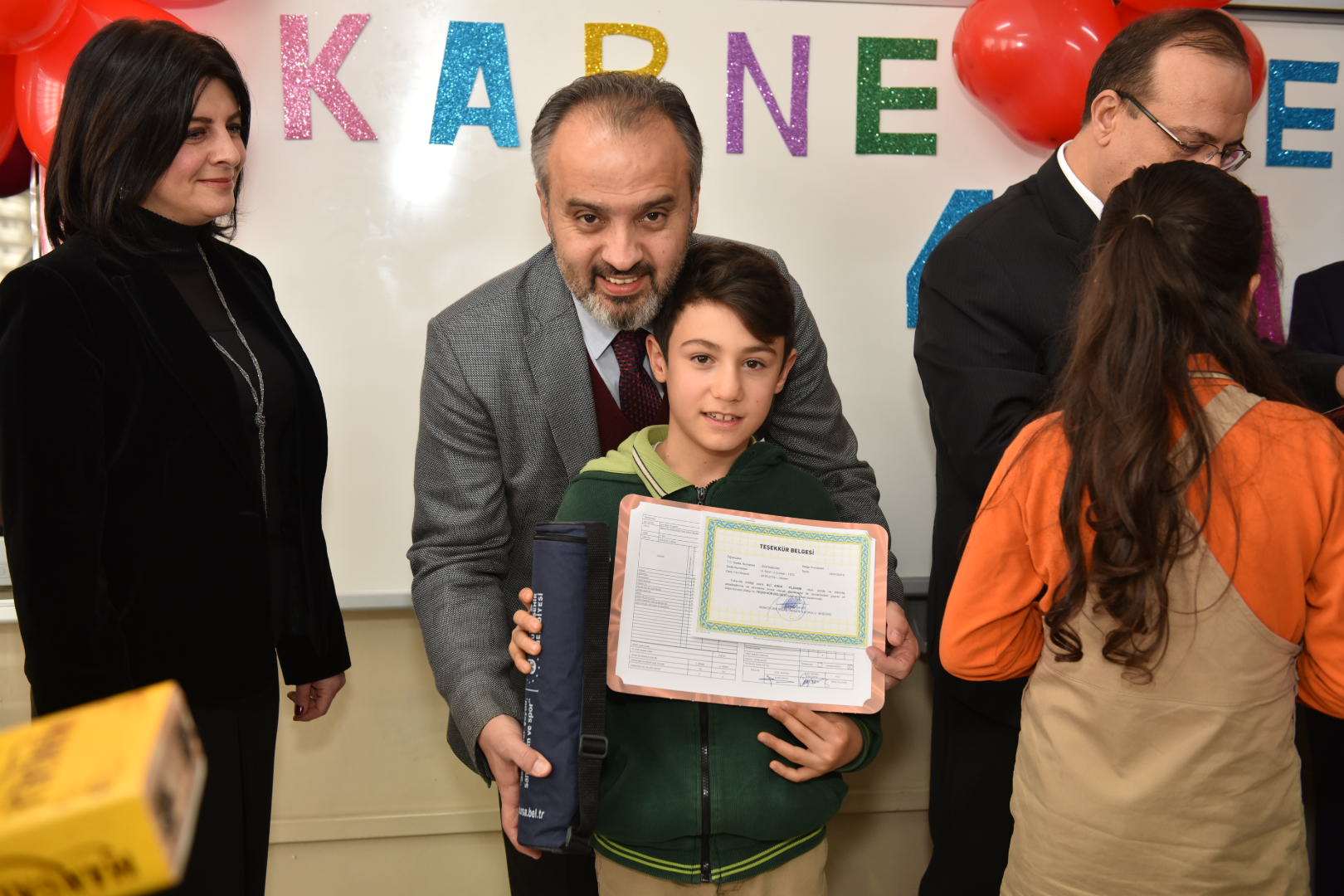 Bursa’da 2018-2019 eğitim öğretim yılının ilk dönemi karnelerin dağıtılmasıyla sona erdi. Bursa’da yaklaşık 570 bin öğrenci ve 32 bin öğretmen karnelerin dağıtılmasıyla 15 günlük tatile çıkmış oldu. İlk dönemin son gününde Akıncıtürk İhsan Dikmen İlkokulu’nda öğrencilerin karne sevincine Bursa Valisi Yakup Canbolat, Büyükşehir Belediye Başkanı Alinur Aktaş ve İl Milli Eğitim Müdürü Sabahattin Dülger de ortak oldu. Başkan Aktaş, bir süre öğrencilere karne ve hediyelerini verdikten sonra kendilerini görüntüleyen gazetecilerin arasına geçip, aldığı fotoğraf makinesi ile karne alan öğrencilerin fotoğrafını çekti. Öğrencilerle sohbet etmeyi de ihmal etmeyen Başkan Aktaş, öğrencilerden tatilin keyfini çıkarmalarını istedi.