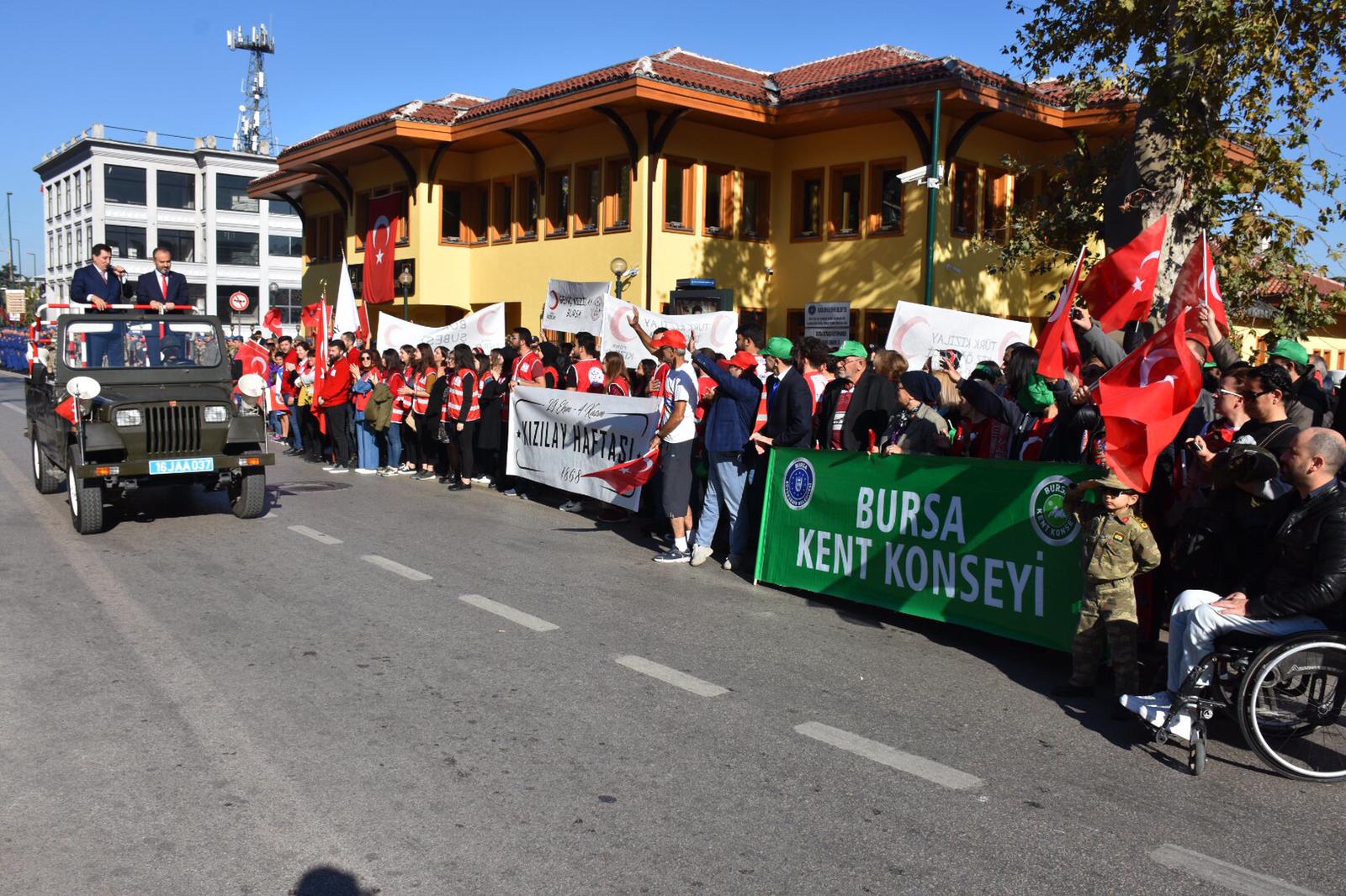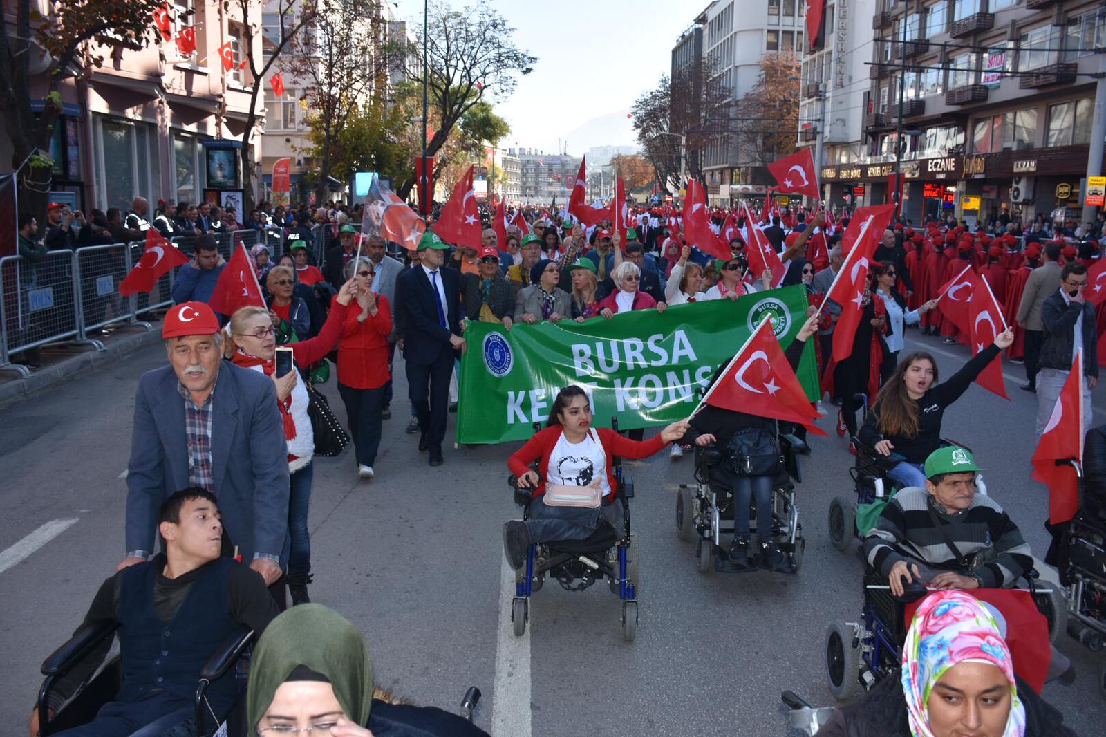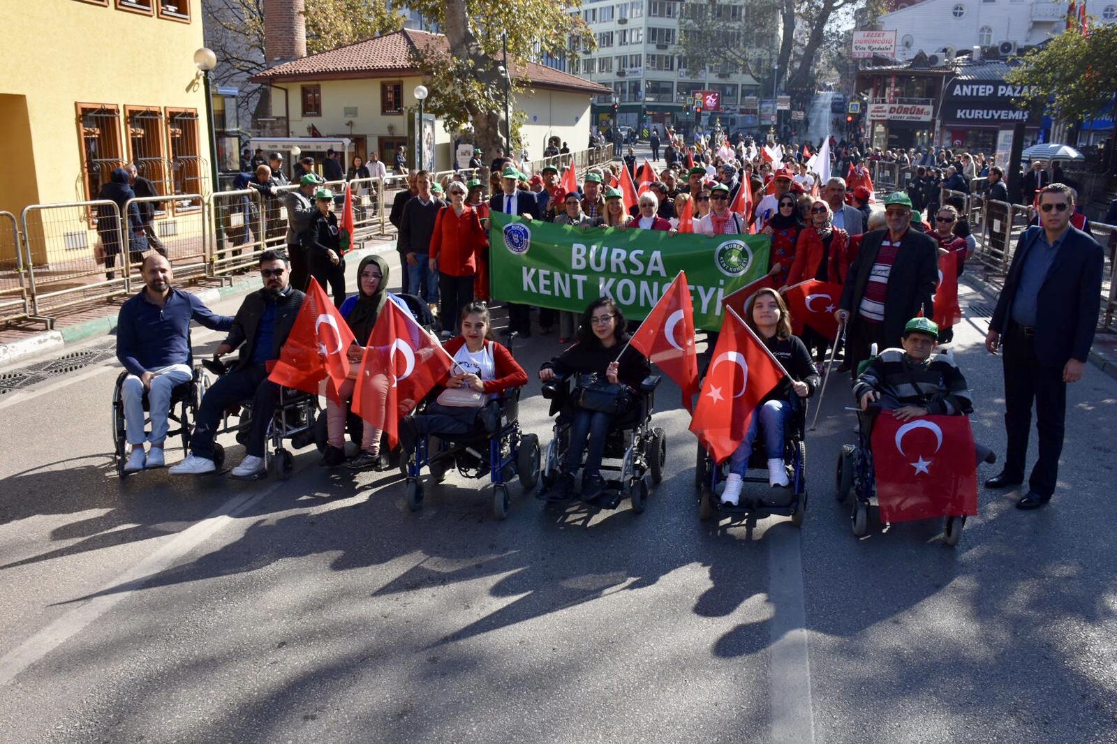 Heykel’deki Atatürk Anıtı önünde yapılan 29 Ekim Cumhuriyet Bayramı kutlamalarının ardından Cumhuriyet Caddesi’nde düzenlenen yürüyüşe, Bursa Kent Konseyi gönüllüleri yoğun katılım sağladı. Yürüyüşe, Bursa Valisi İzzettin Küçük, Büyükşehir Belediye Başkanı Alinur Aktaş, Bursa Kent Konseyi Başkanvekili Şuayip Toprak ile protokolün yanı sıra Bursa Kent Konseyi yürütme kurulu üyeleri, Kadın Meclisi, Gençlik Meclisi, Engelliler Meclisi, Çocuk Meclisi üyeleri ile çalışma gruplarının temsilcileri, sivil toplum kuruluşu temsilcileri ve vatandaşlar katıldı.