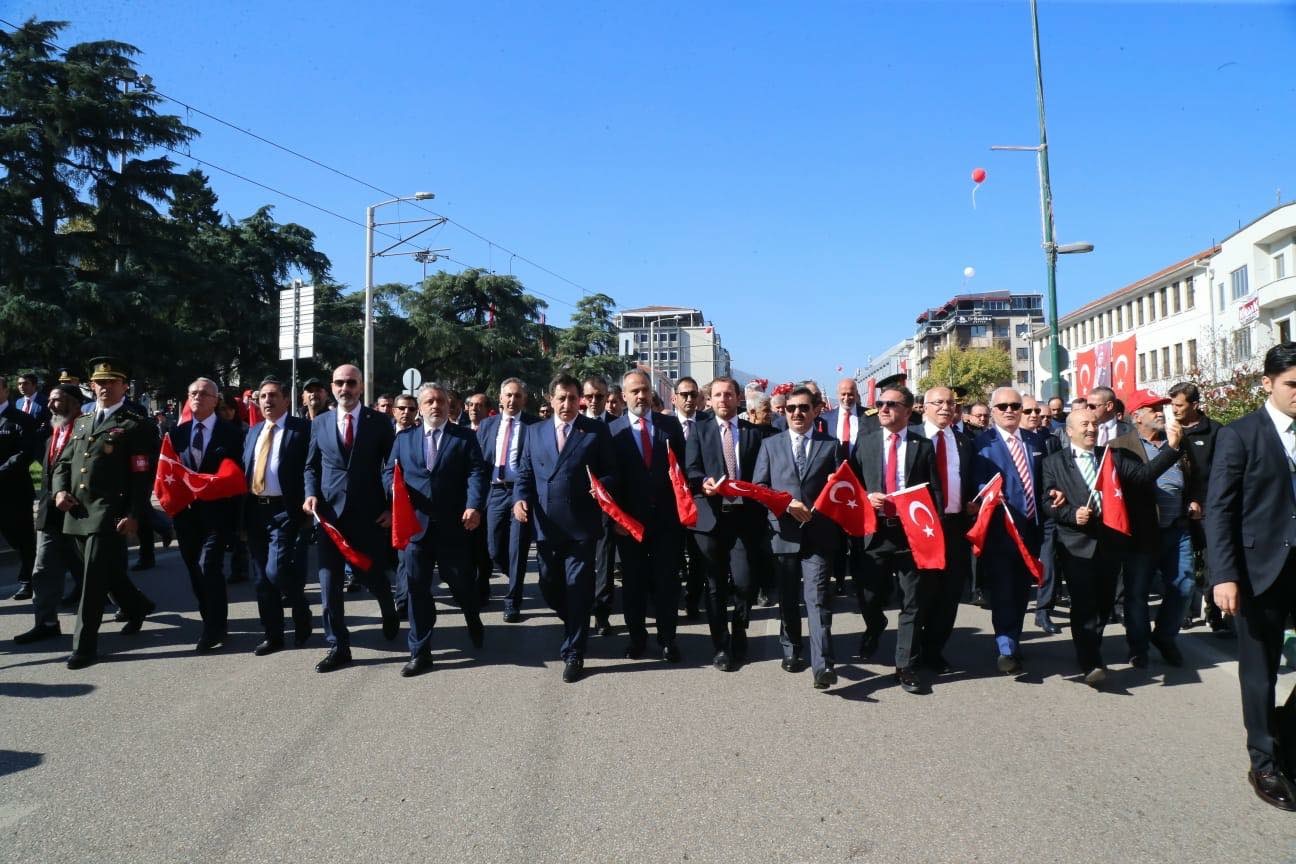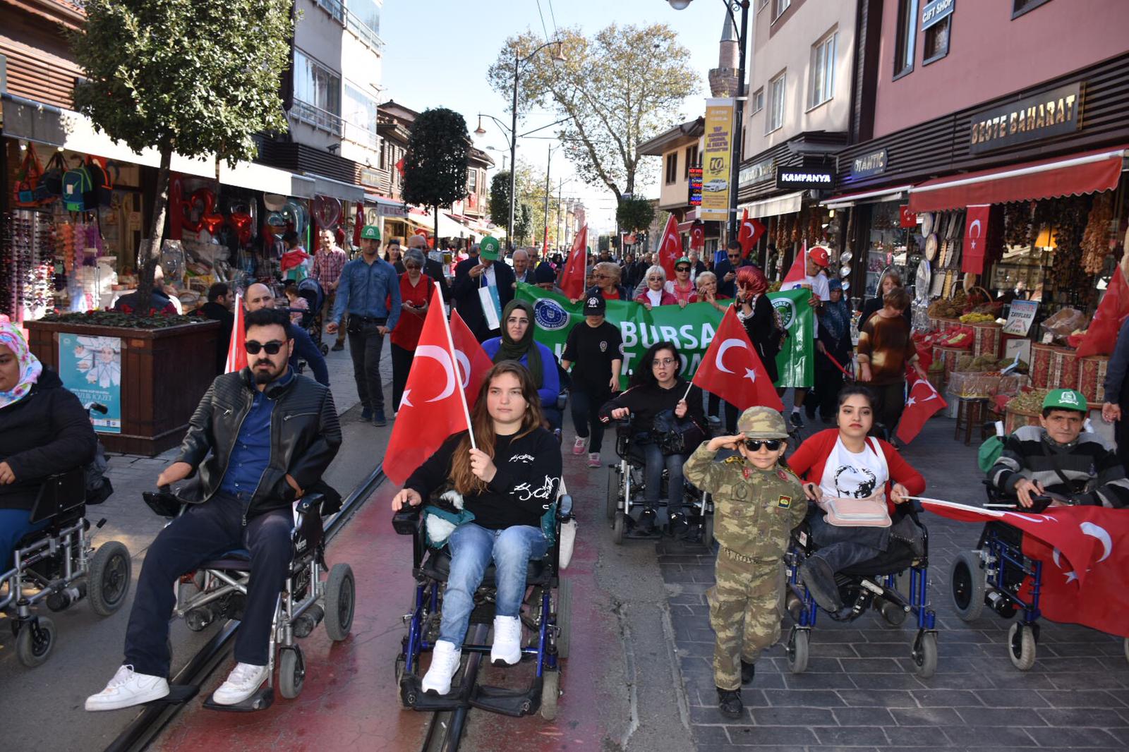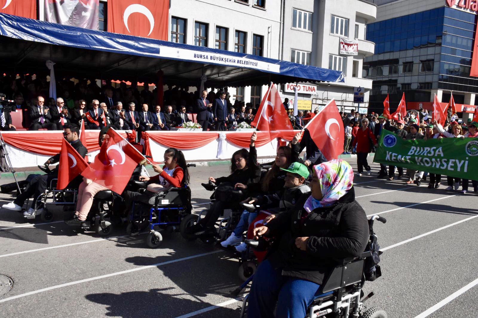 Heykel’deki Atatürk Anıtı önünde yapılan 29 Ekim Cumhuriyet Bayramı kutlamalarının ardından Cumhuriyet Caddesi’nde düzenlenen yürüyüşe, Bursa Kent Konseyi gönüllüleri yoğun katılım sağladı. Yürüyüşe, Bursa Valisi İzzettin Küçük, Büyükşehir Belediye Başkanı Alinur Aktaş, Bursa Kent Konseyi Başkanvekili Şuayip Toprak ile protokolün yanı sıra Bursa Kent Konseyi yürütme kurulu üyeleri, Kadın Meclisi, Gençlik Meclisi, Engelliler Meclisi, Çocuk Meclisi üyeleri ile çalışma gruplarının temsilcileri, sivil toplum kuruluşu temsilcileri ve vatandaşlar katıldı.