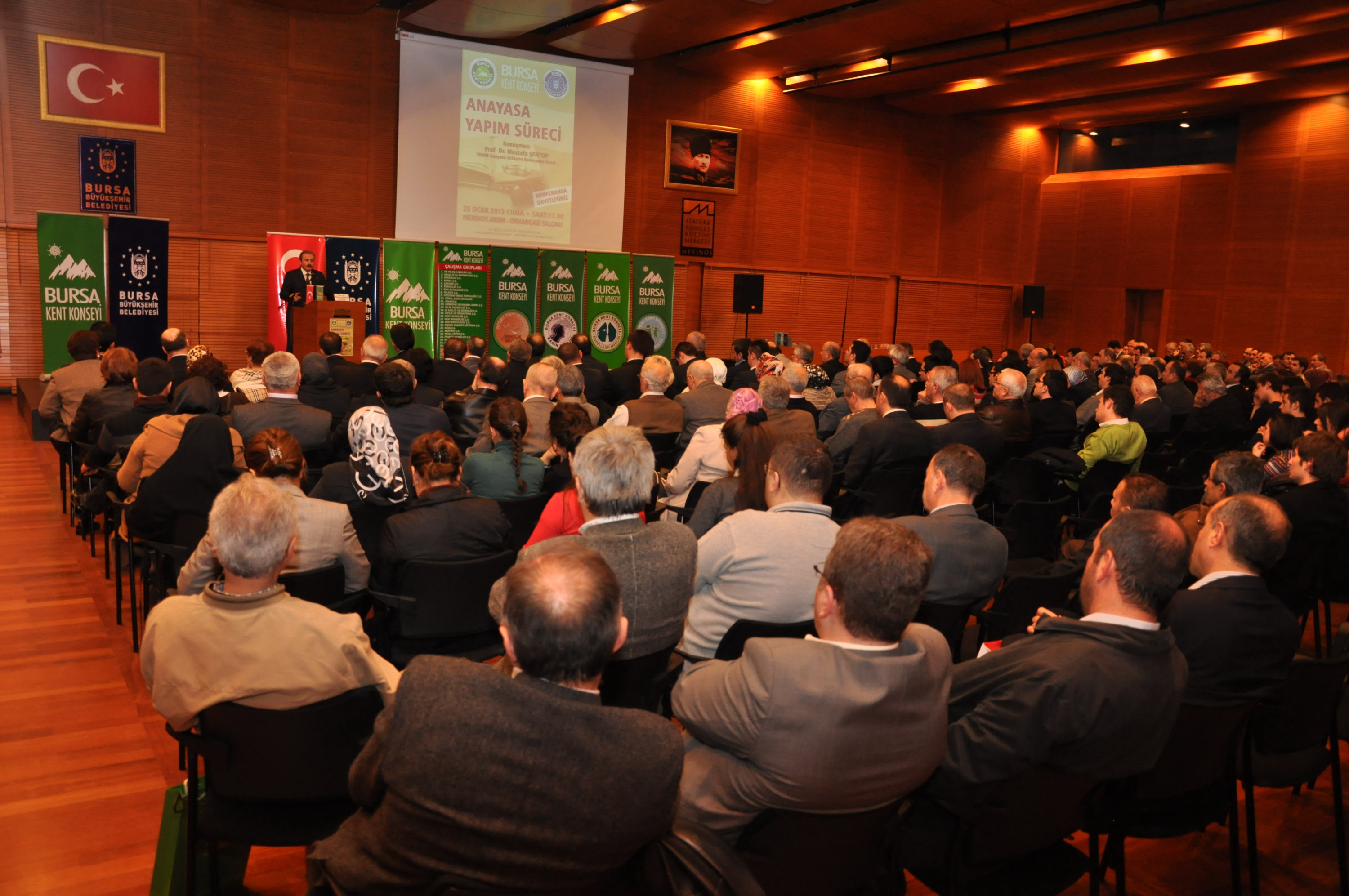 Yeni Anayasa Süreci’ konulu toplantıya konuşmacı olarak katılan AK Parti Seçim İşlerinden Sorumlu Genel Başkan Yardımcısı, TBMM Anayasa Uzlaşma Komisyonu Üyesi ve İstanbul Milletvekili Prof. Dr. Mustafa Şentop, program vesilesiyle kendisini Bursa’ya davet eden Bursa Kent Konseyi Başkanı Semih Pala’ya teşekkür etti. Türkiye’nin en önemli konularından birisinin anayasa olduğunu anlatan Mustafa Şentop, 12 Haziran 2011 seçimlerinden sonra yeni anayasa için çalışmaların başlatıldığını kaydetti. Referandum’da AK Parti dışındaki birçok partinin karşı durmasına karşın 2011 seçimlerinden önce tüm partilerin yeni anayasa vaadinde bulunduğunu söyledi. Meclis’te oluşturulan Anayasa Komisyonu’nda her parti 3 kişiyle temsil edildiğini, komisyonun mutabakatla kararlar aldığını belirten Prof. Dr. Şentop, “Komisyon, ilk çalışmasına 19 ekim 2011 tarihinde başladı. 6 aylık sürede toplumsal katılımı sağlama kararı alındı. Aralık 2012 sonuna kadar metni hazırlayıp Meclis Başkanlığı’na teslim edeceğini vaat etmişti. Ama vakit doldu. Hedefe ulaşma imkanı gözükmedi. Yine makul süre içerisinde komisyonun çalışmalarını sürdürmesi benimsendi. Komisyon çalışmaları Aralık ayında yavaşlamıştı. Ama ocak ayında yeniden hız kazandı. Benim düşünceme göre 3 ay içerisinde komisyon, ortaya tamamen mutabakatla oluşmuş olmasa da bir metin çıkartacaktır. Türkiye seçim atmosferine girdikten sonra yeni anayasayı konuşmak imkansız hale gelecek. Bu yüzden komisyon, kendisine üstlenen misyonu makul sürede tamamlamalıdır. Yapamıyorsa Meclisin başka seçenekleri değerlendirmesi için kenara çekilmelidir. Komisyon, Türkiye’nin bu konudaki tek şansı değildir. Alternatif yollarda düşünülebilir” dedi.