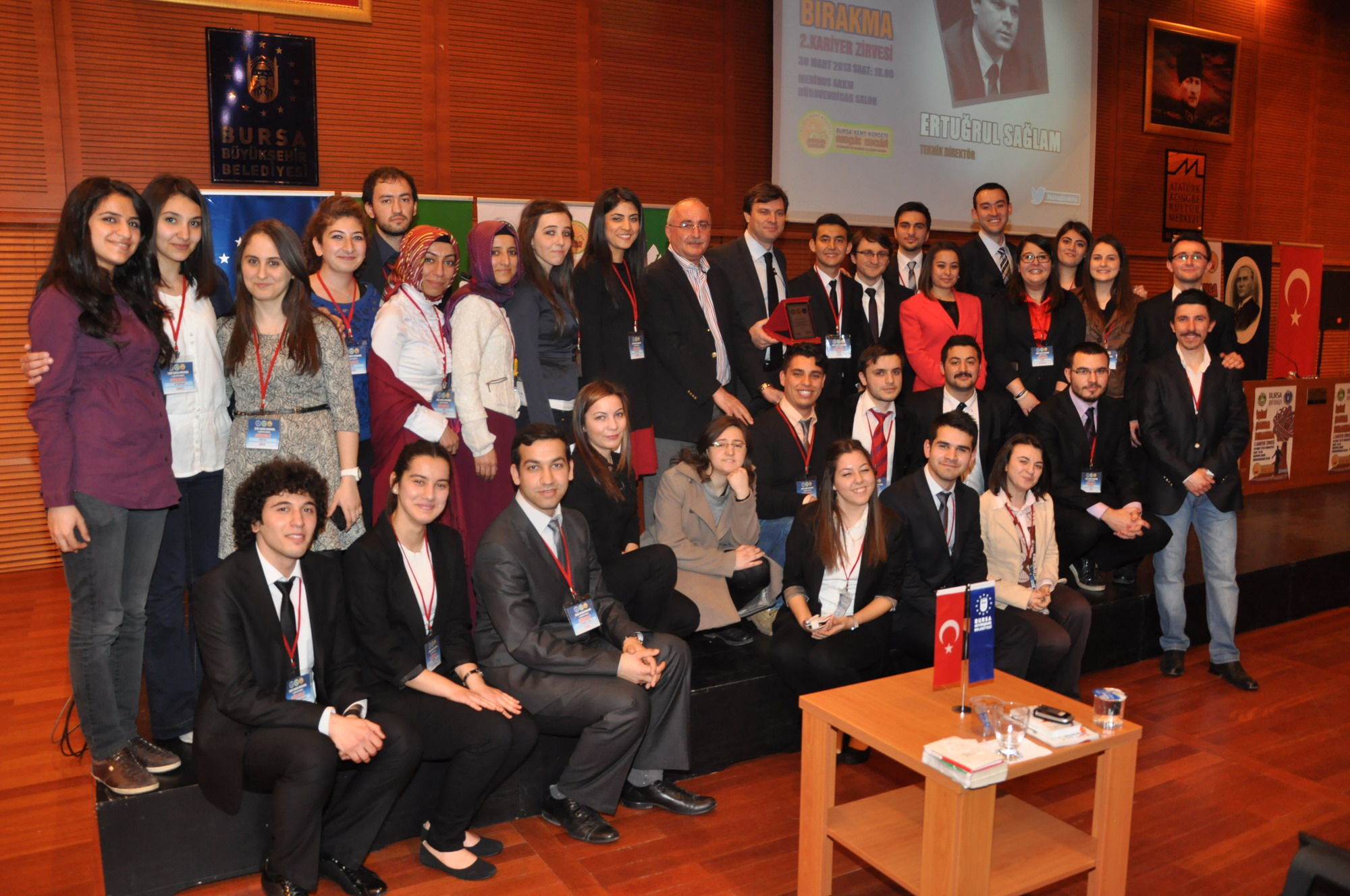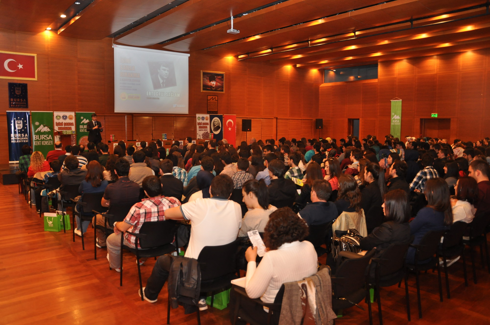 ‘İşini Şansa Bırakma Kariyer Zirvesi’ ilk oturumunda ID Danışmanlık tarafından ‘Yönetici koçluğu’ semineri verildi. Ardından Teknik Direktör Ertuğrul Sağlam tarafından ‘Sürdürülebilir Başarı için Liderlik’ konulu sunum yapıldı. Tekrar Bursa’ya gelmesine vesile olan ve gençlerle buluşturan Bursa Kent Konseyi Gençlik Meclisi’ne teşekkür eden Ertuğrul Sağlam, geçmişte yaşadığı tecrübeleri paylaştı. Futbolculuk dönemini, antrenörlüğe geçiş dönemini, Samsunspor, Kayserispor, Beşiktaş dönemlerini anlatan Sağlam, Bursaspor’da geçirdiği 4 yılı ve şampiyonluğa giden süreçte yaşadıklarını gençlere aktardı. Kariyeri boyunca yaşadığı ve yaşayacağı en önemli başarıyı Bursaspor’da yakaladığını söyleyen Sağlam, “Türkiye o günkü ortamda ürettiğimiz başarıyı anlayabilmiş değil. Bundan sonra da çok anlaşılacağına inanmıyorum. Bu süreç çok iyi analiz edilirse, önümüzdeki sürece iyi ışık tutacaktır. 4 yıl boyunca yakaladığımız istikrarı da incelemek gerekir. Devre arasında başladığımız ilk sezonu ikinci sırada bitirdik. Bir sonraki şampiyon bitirdik. Ardından 3. bitirdik, ondan sonraki sezonu 5. bitirdik ve kupa finali oynadık. Bizim imkanlarımızdaki Anadolu takımı için başarıda istikrarın oluştuğunu rahatlıkla söyleyebiliriz. Şans, hazırlıkla fırsatın karşılaştığı köşe başıdır” diye konuştu.